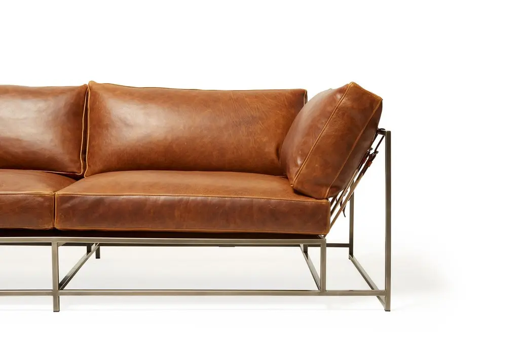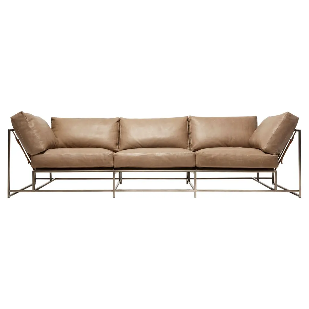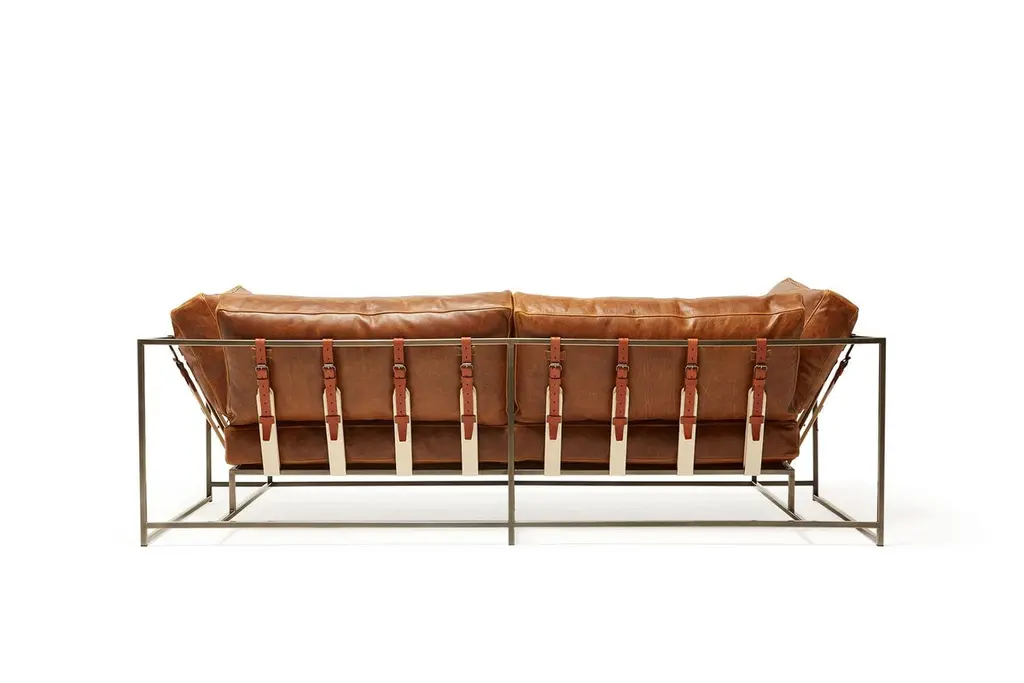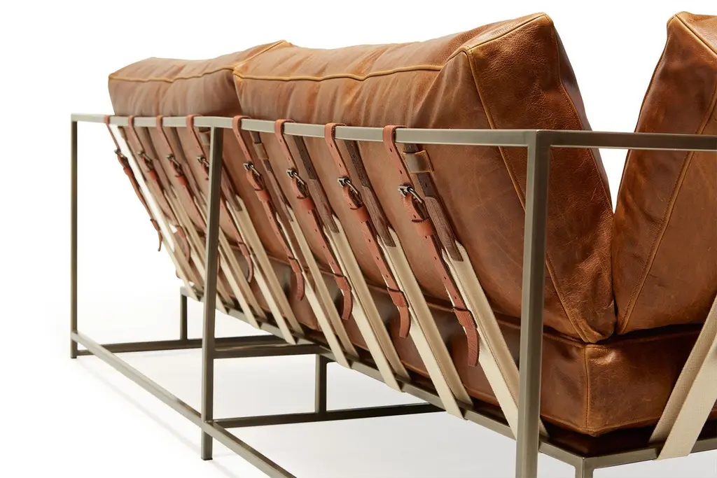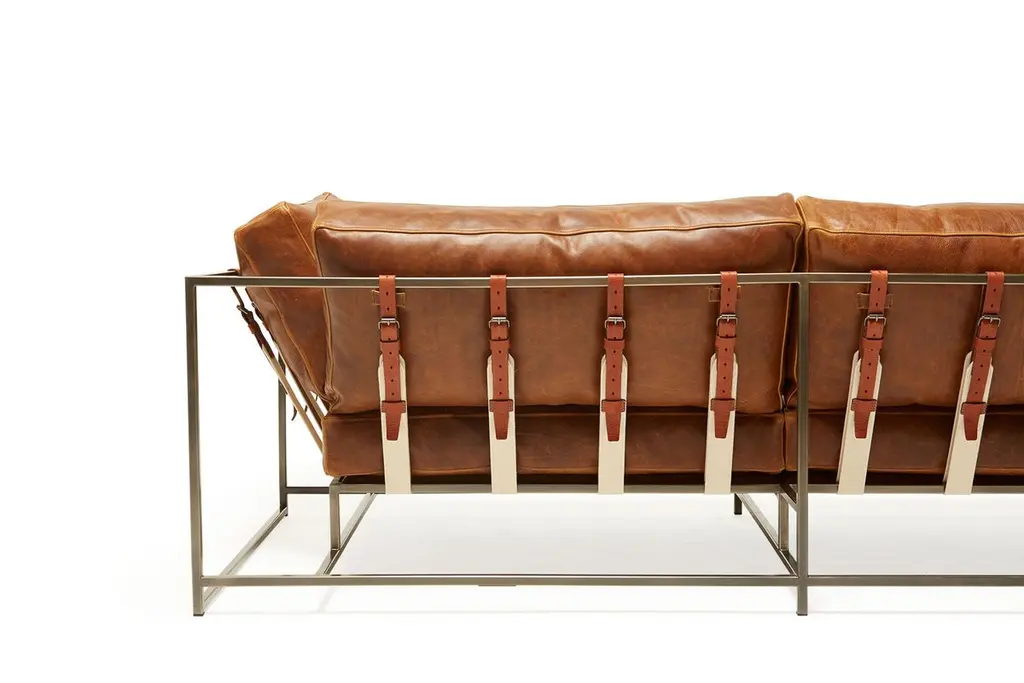 The Inheritance Two Seat Sofa by Stephen Kenn is as comfortable as it is unique. The design features an exposed construction composed of three elements - a steel frame, plush upholstery, and supportive belts. The deep seating area is perfect for a relaxing lounge experience.Every Stephen Kenn piece is made to order through our Los Angeles studio in partnership with a number of small businesses and fabricators in the LA area. With this highly customizable two seat sofa you can select from a wide range of finishes and materials to complement your home and lifestyle - please message us to see our Customization Guide with all available options.This version of our Inheritance Two Seat Sofa is upholstered in waxed tan leather from the Potomac Collection by Moore & Giles. The foam seat cushion has been wrapped in down for added comfort and sits atop an antique nickel plated steel frame. The two seat sofa is strapped with support belts featuring natural cotton webbing, aged natural veg tan leather, and antique nickel buckles.