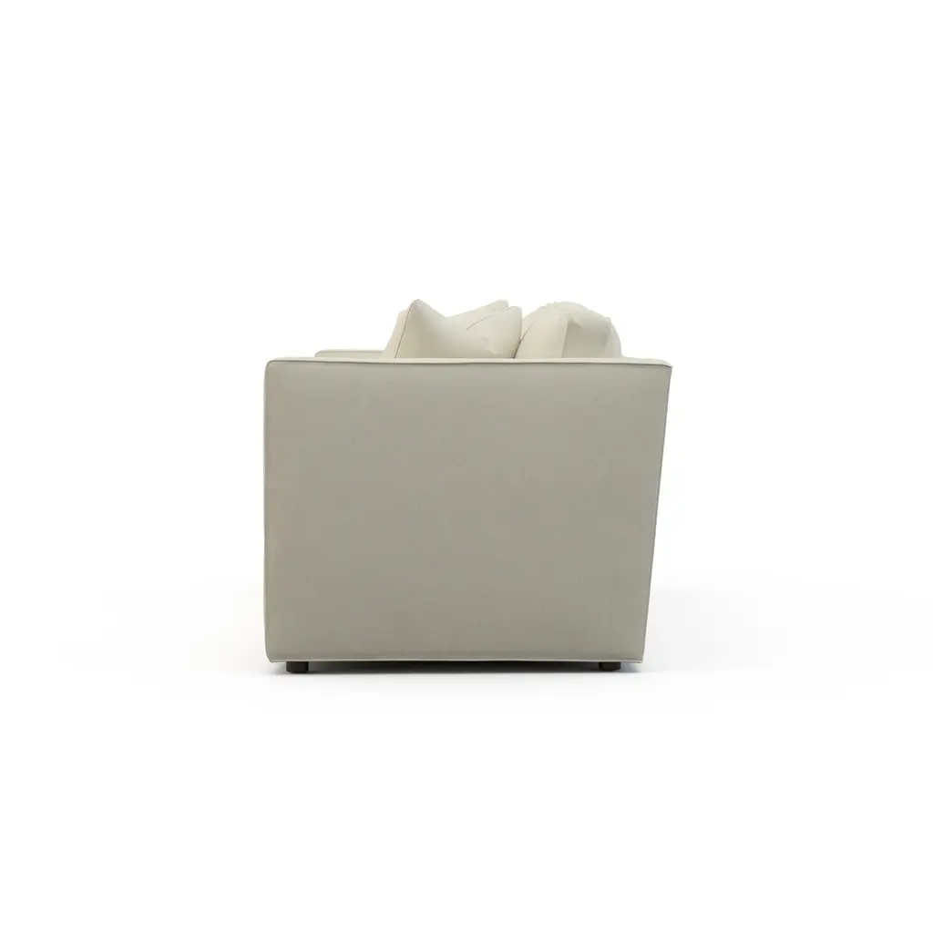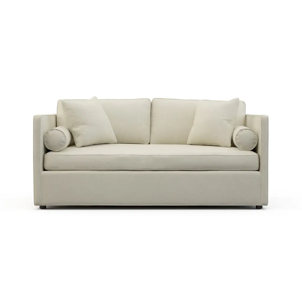 Our Pridwin Sofa is both contemporary and classic, and the clean lines and bold scale make it a stylish, comfortable choice for both casual family gathering areas and more formal living rooms. The Pridwin collection also includes a loveseat (sold separately). Ships In 8-10 Weeks Two 23" x 9" cylinder throw pillows Two 21" square throw pillows Two loose back pillows One loose seat cushion As Shown Fabric: Rayburn Oatmeal, Boca Moss with Adalio White Contrast Welt (lifestyle) As Shown Finish: Antique Walnut If you choose to purchase COM, once you have placed your order a customer service rep will contact you regarding where to send your fabric. Please note that current lead time is 17-19 weeks once your fabric arrives at the factory, and if unused fabric is under 1.5 yards, it cannot be sent back to you.This product can be special ordered in additional fabrics, leathers, finishes, and cushion fillings. Click here to email us for for additional information about special ordering.This image is for illustrative purposes only. The colors shown are accurate within the constraints of lighting, photography, and the color accuracy of your screen.
