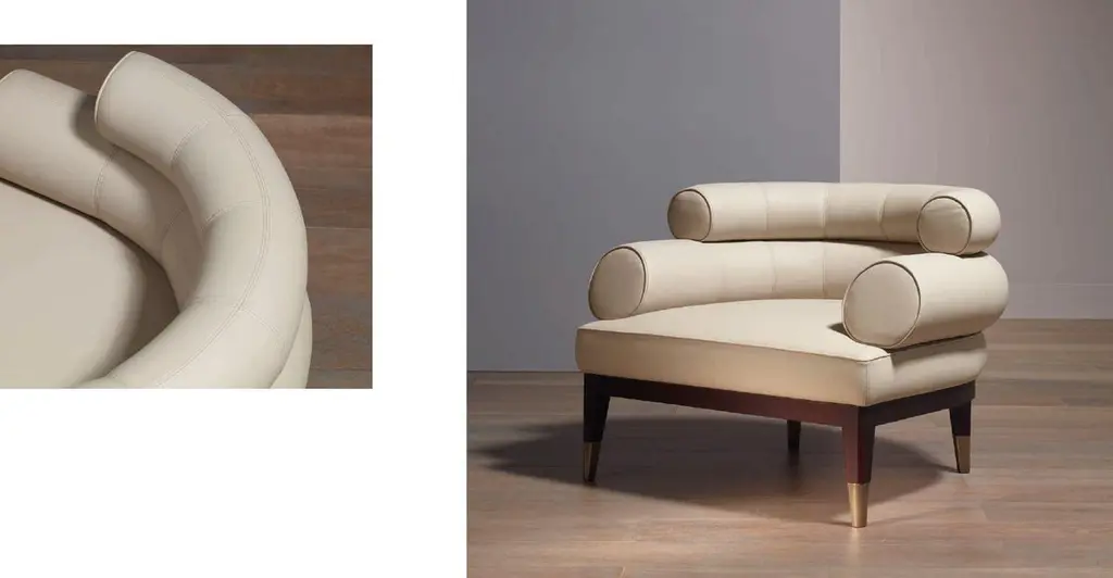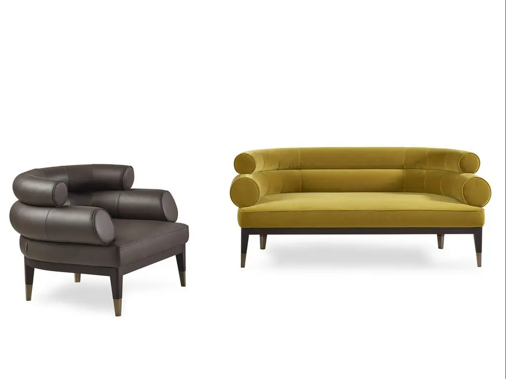 The Pyper Armchair and Loveseat are exquisite pieces designed for both comfort and style. Upholstered in a limited edition fabric, they feature a sturdy structure made from multilayer Italian poplar wood, ensuring durability. The base is crafted from moka-stained beechwood, complemented by feet in brass with an antique bronze finish, adding a touch of elegance to the overall design.These pieces are available in various finishes, including both fabric and leather, allowing for customization to suit your interior decor. The padding consists of variable density polyurethane foam, providing a comfortable seating experience. Please note that the covers for both the fabric and leather versions are not removable, and back pillows are not included—check the pillows page for options.Additionally, the Pyper collection offers two different sizes, catering to diverse space requirements. The close-up details highlight the craftsmanship, showcasing the beautiful foot design and the elegant backrest. Please note that the price does not include the upholstery fabric.