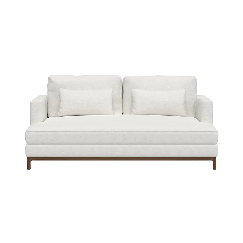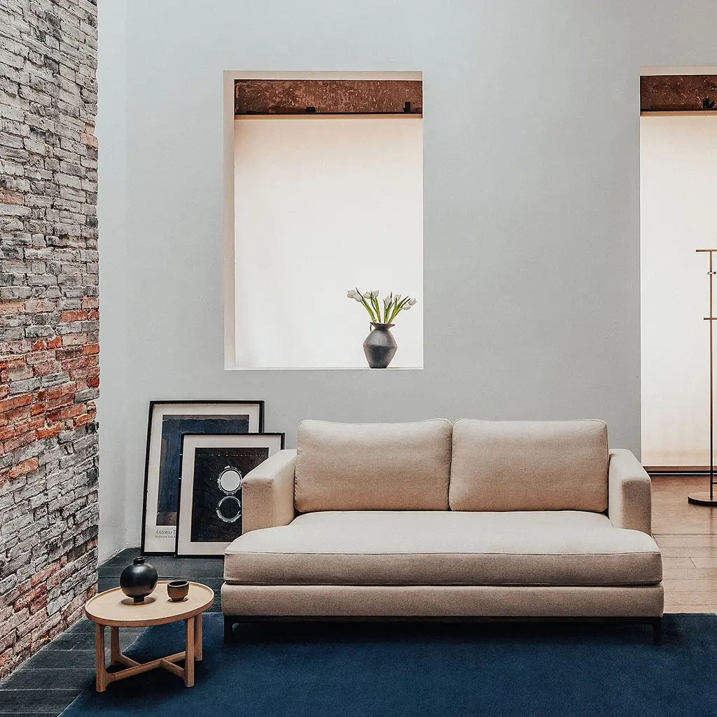 A low-profile frame supports a cushioned seat and backrest, offering comfort for both seated and reclined use. The solid oak or walnut wood base can be paired with a range of fabric upholstery options. The form emphasizes simplicity and balance, making it well-suited for a variety of interior settings.