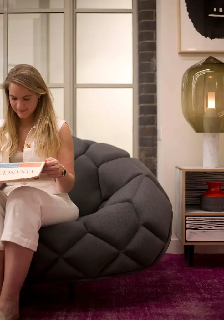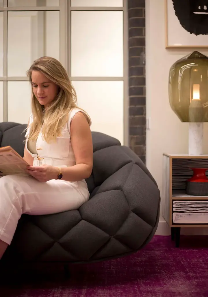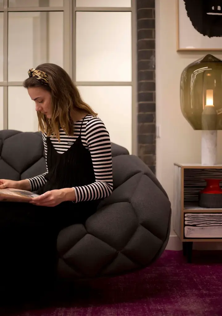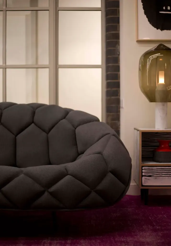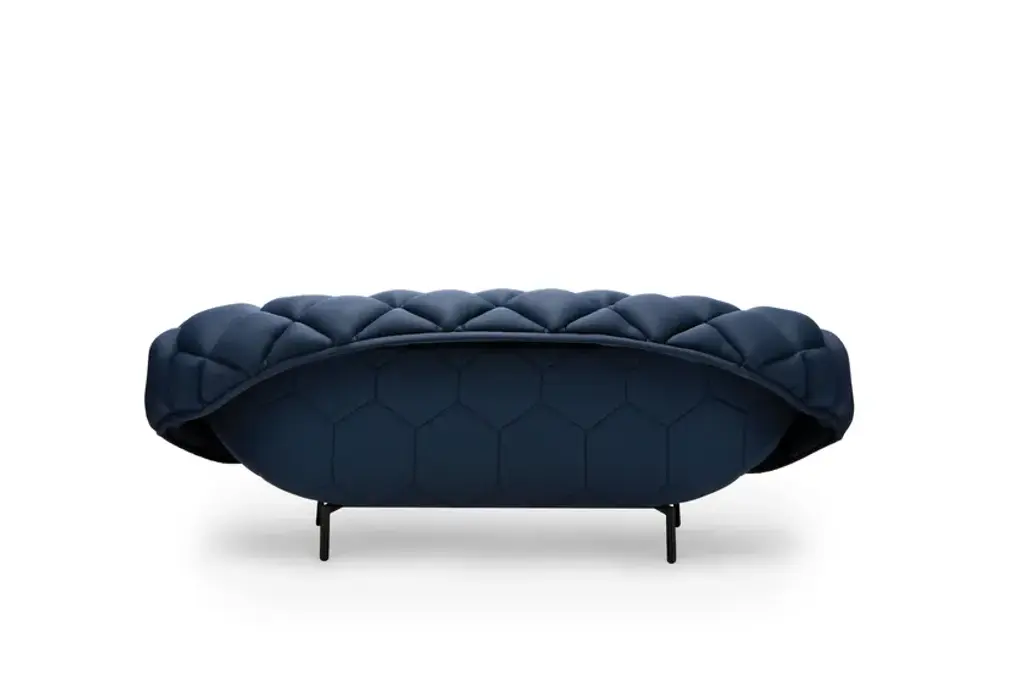 Quilt is a 3 seats sofa.Materials:Powder-coated steel frame, glass-reinforced polyester core, foam inserts, fixed non-removable upholstery cover, rubber feet.The Quilt seating series by the Bouroullecs is covered with soft, honeycomb-like padding in vibrant, stretch fabrics, delivering an instant burst of color in both residential and contract settings. These geometric components are both mathematical and decorative in design, while their soft and full padding ensures superior comfort.
