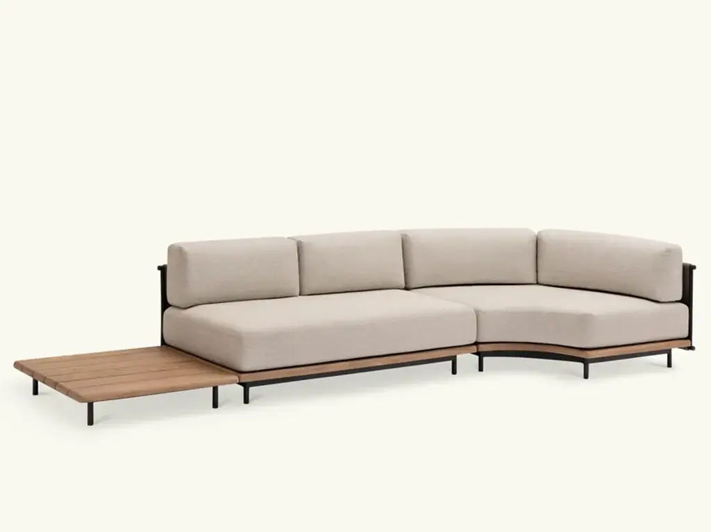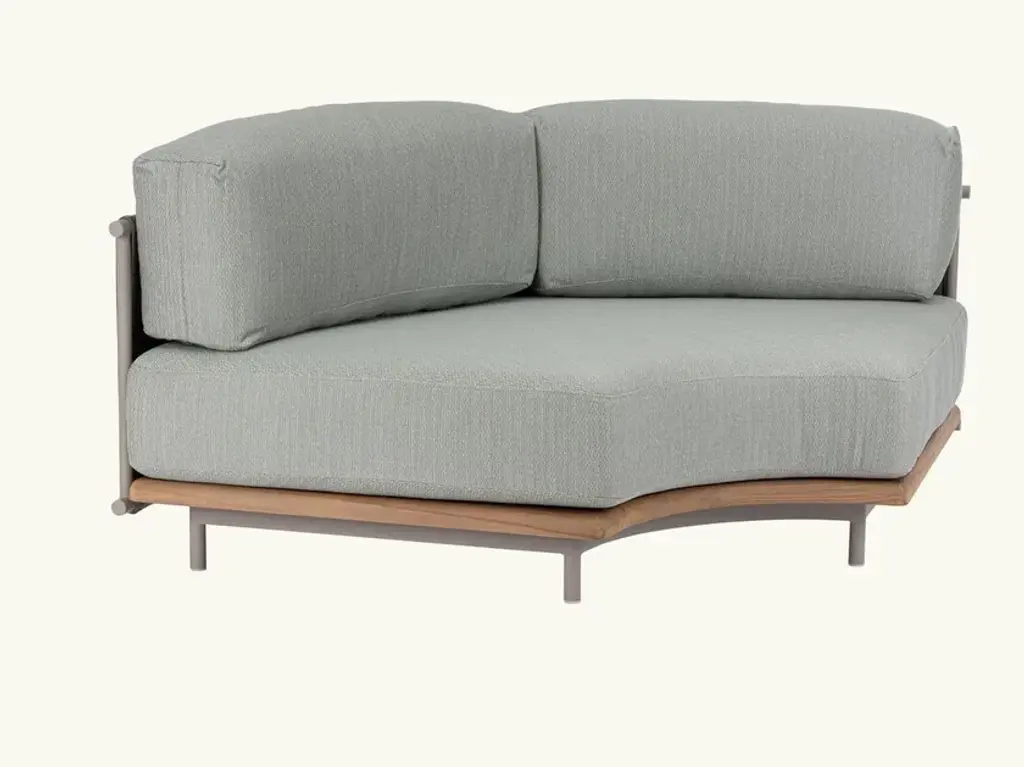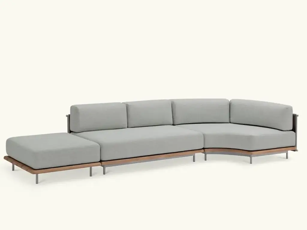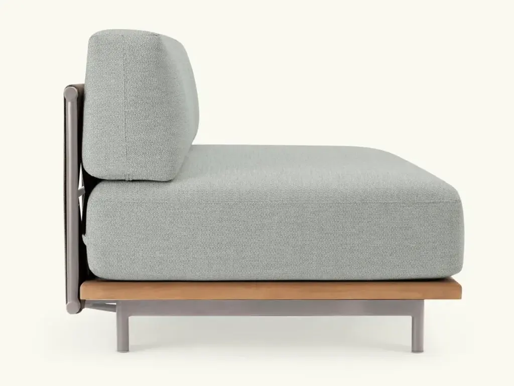 Rada is an upholstered sofa with wooden frame and woven back with waterproof padding.A living room without walls: the Rada collection reinvents the outdoor space as if it were a room in the house. Elegant and cozy. Rada draws The name from the natural cove that gives shelter to ships and echoes its cozy shapes. The sofa, an iconic element of the collection, through its modular design offers the possibility of configuring the outdoor space in different hospitality situations, like a real living area.The collection consists of lounge area, dining area and loungers. The whole line is generous in character, which is evident in the size, depth and softness of the upholstery. Different combinations of materials: teak base and tops, aluminum frame softened by a weave in the back of the sofas and thin padding in the dining area seats.