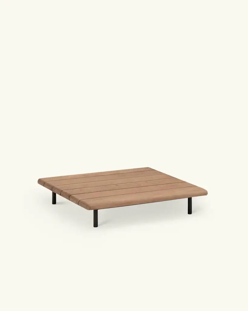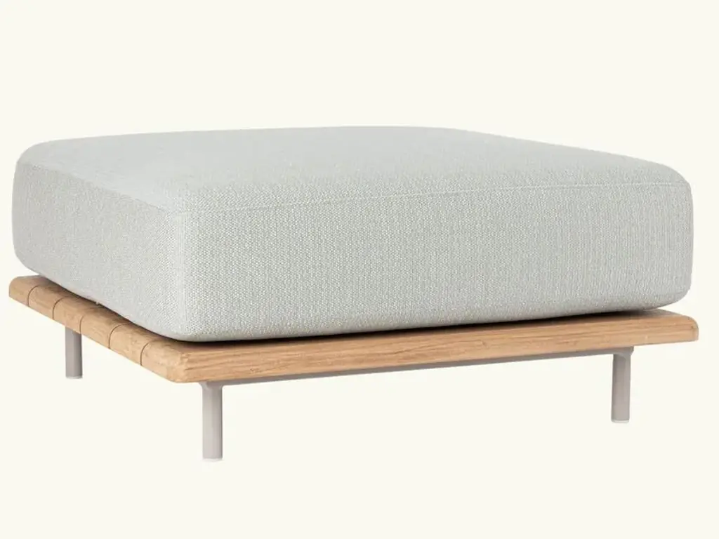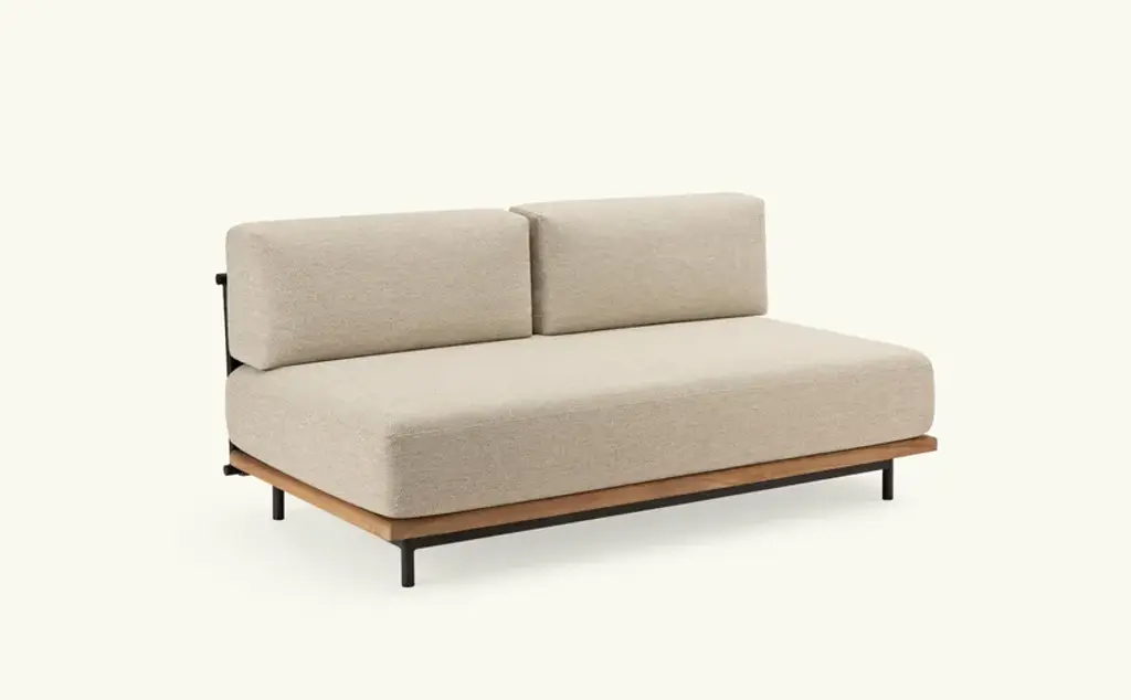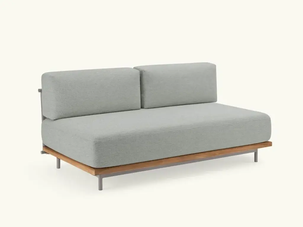 Rada is an upholstered sofa with wooden frame and woven back with waterproof padding.A living room without walls: the Rada collection reinvents the outdoor space as if it were a room in the house. Elegant and cozy. Rada draws The name from the natural cove that gives shelter to ships and echoes its cozy shapes. The sofa, an iconic element of the collection, through its modular design offers the possibility of configuring the outdoor space in different hospitality situations, like a real living area.The collection consists of lounge area, dining area and loungers. The whole line is generous in character, which is evident in the size, depth and softness of the upholstery. Different combinations of materials: teak base and tops, aluminum frame softened by a weave in the back of the sofas and thin padding in the dining area seats.