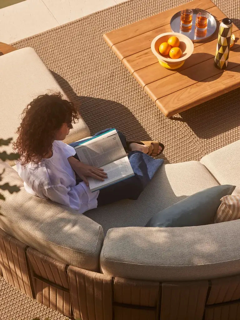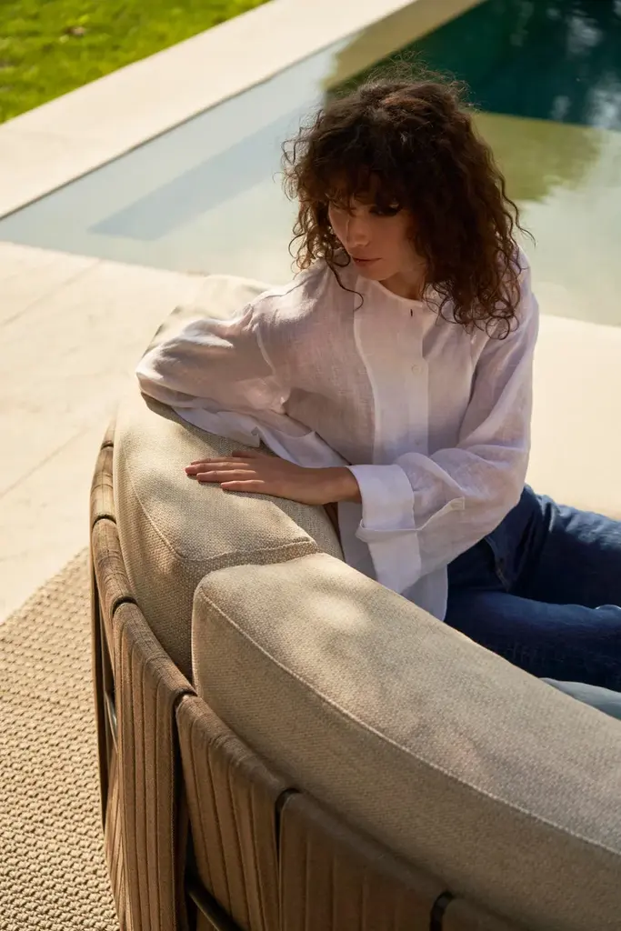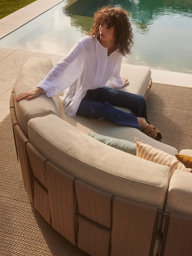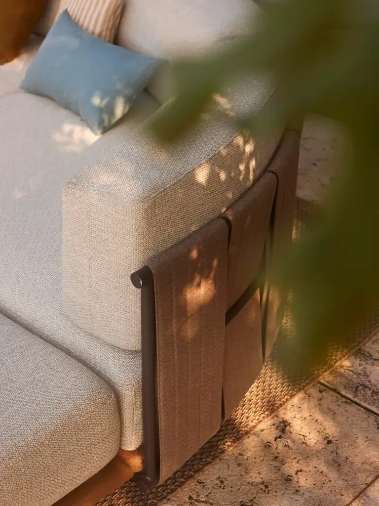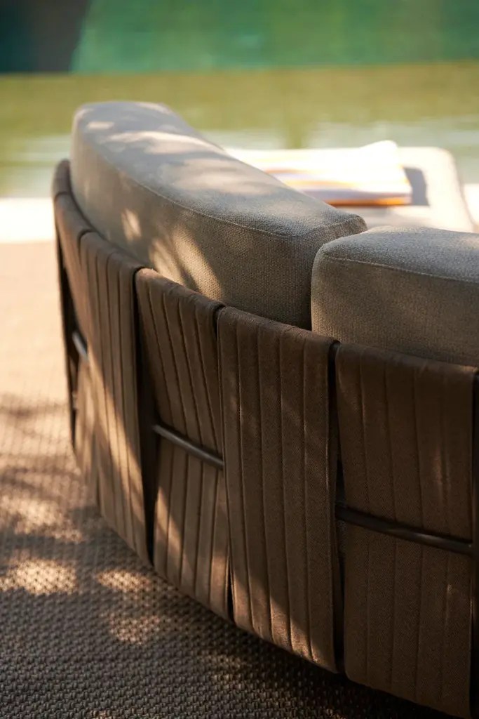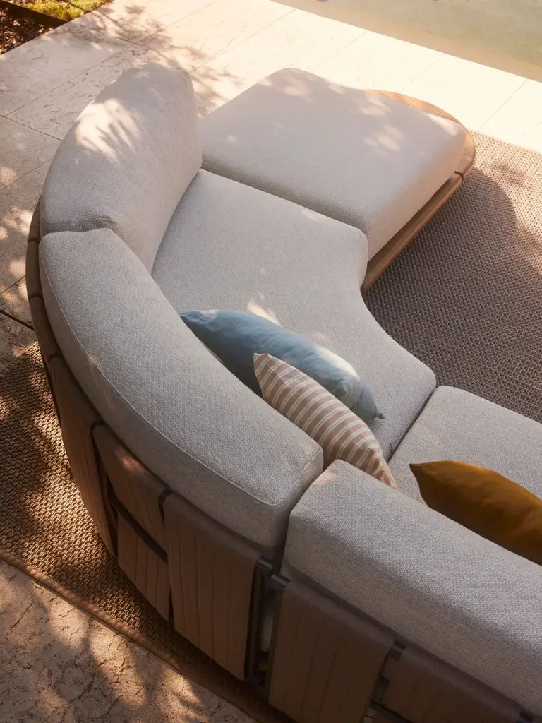 Rada is a two-seater padded sofa with wooden structure and woven backrest with waterproof padding.Colors:6000017 - Rada beige corner sofa6000024 - Rada blue corner sofa6000031 - Rada aquamarine corner sofaA living room without walls: the Rada collection reinvents the outdoor space as if it were a room in the house. Elegant and cozy. Rada draws The name from the natural cove that gives shelter to ships and echoes its cozy shapes. The sofa, an iconic element of the collection, through its modular design offers the possibility of configuring the outdoor space in different hospitality situations, like a real living area.The collection consists of lounge area, dining area and loungers. The whole line is generous in character, which is evident in the size, depth and softness of the upholstery. Different combinations of materials: teak base and tops, aluminum frame softened by a weave in the back of the sofas and thin padding in the dining area seats.