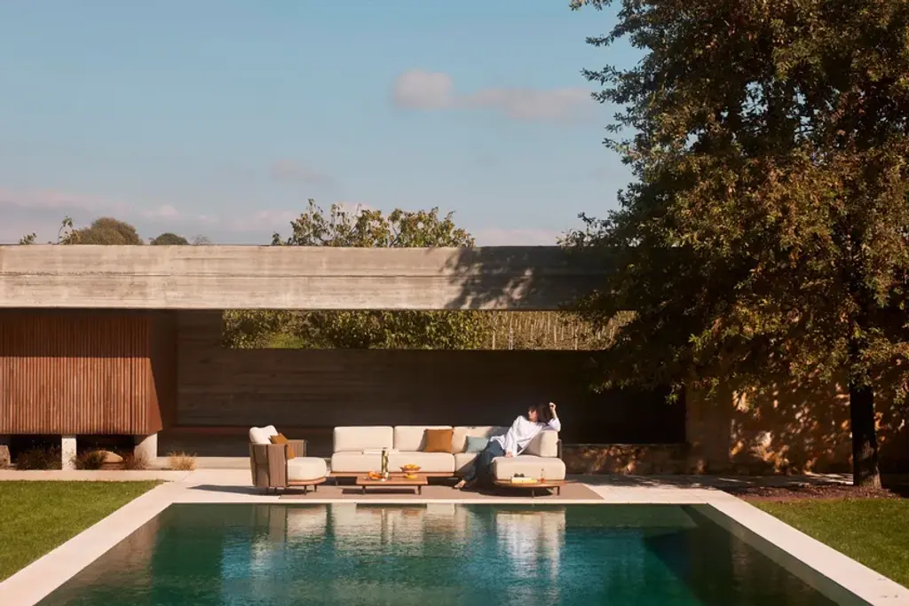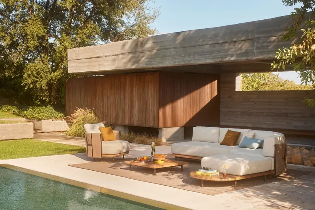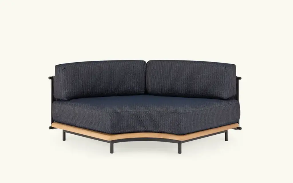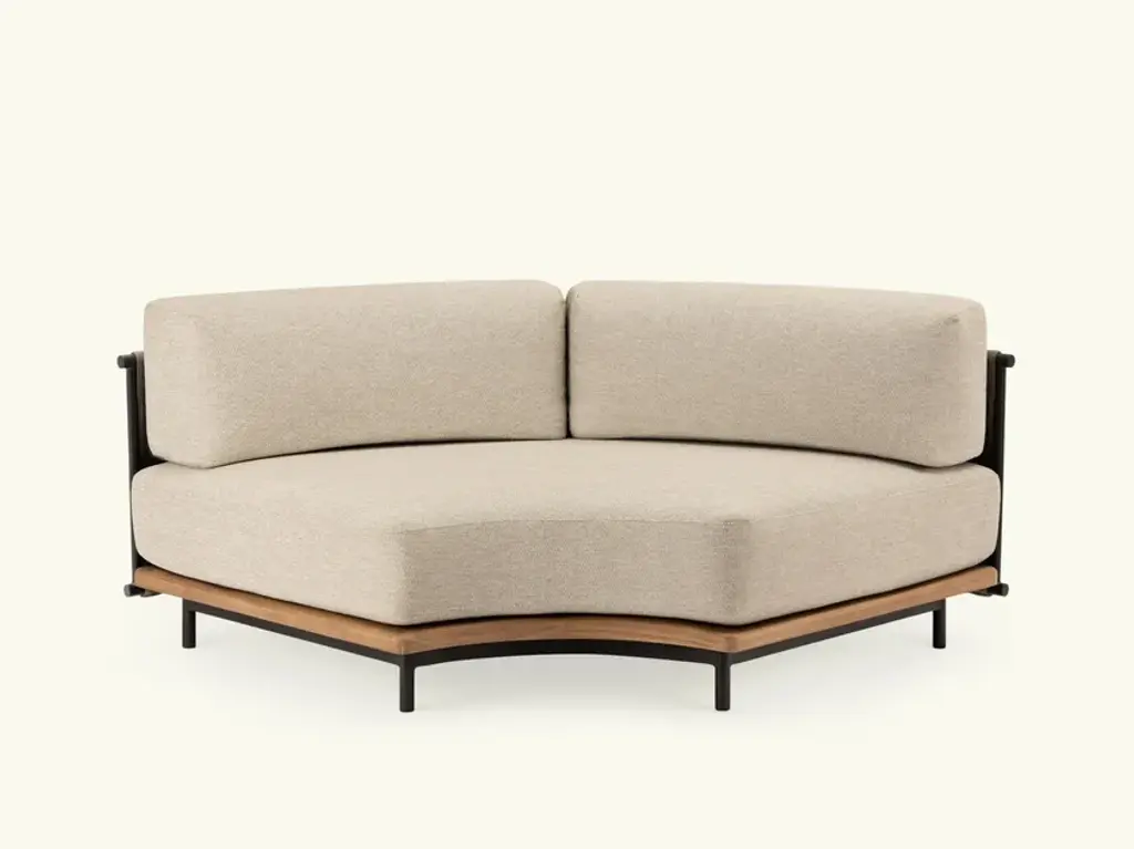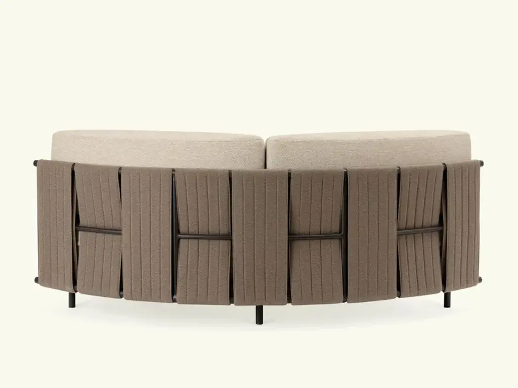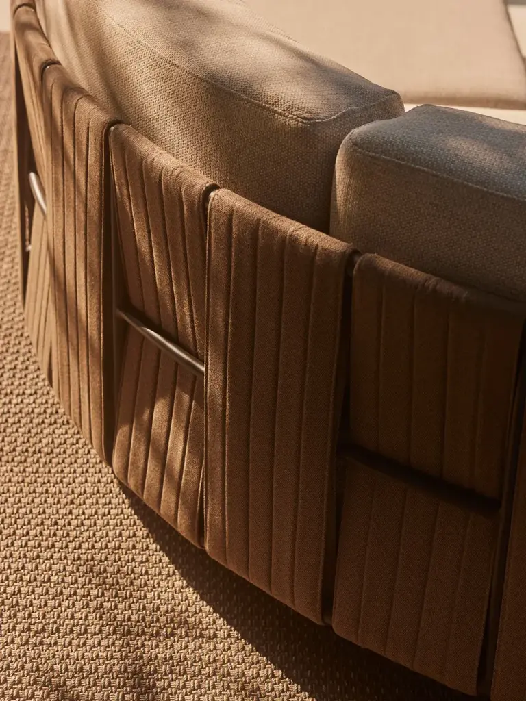 Rada is a two-seater padded sofa with wooden structure and woven backrest with waterproof padding.Colors:6000017 - Rada beige corner sofa6000024 - Rada blue corner sofa6000031 - Rada aquamarine corner sofaA living room without walls: the Rada collection reinvents the outdoor space as if it were a room in the house. Elegant and cozy. Rada draws The name from the natural cove that gives shelter to ships and echoes its cozy shapes. The sofa, an iconic element of the collection, through its modular design offers the possibility of configuring the outdoor space in different hospitality situations, like a real living area.The collection consists of lounge area, dining area and loungers. The whole line is generous in character, which is evident in the size, depth and softness of the upholstery. Different combinations of materials: teak base and tops, aluminum frame softened by a weave in the back of the sofas and thin padding in the dining area seats.