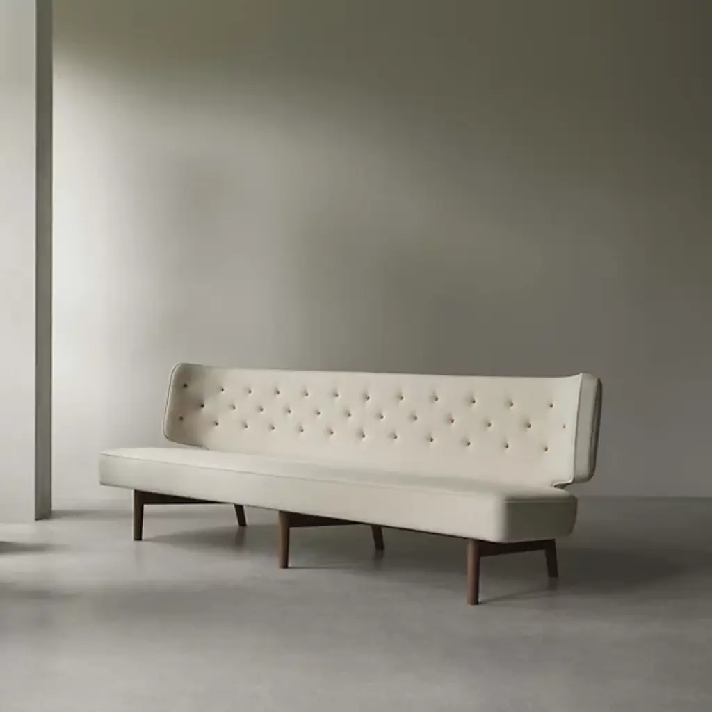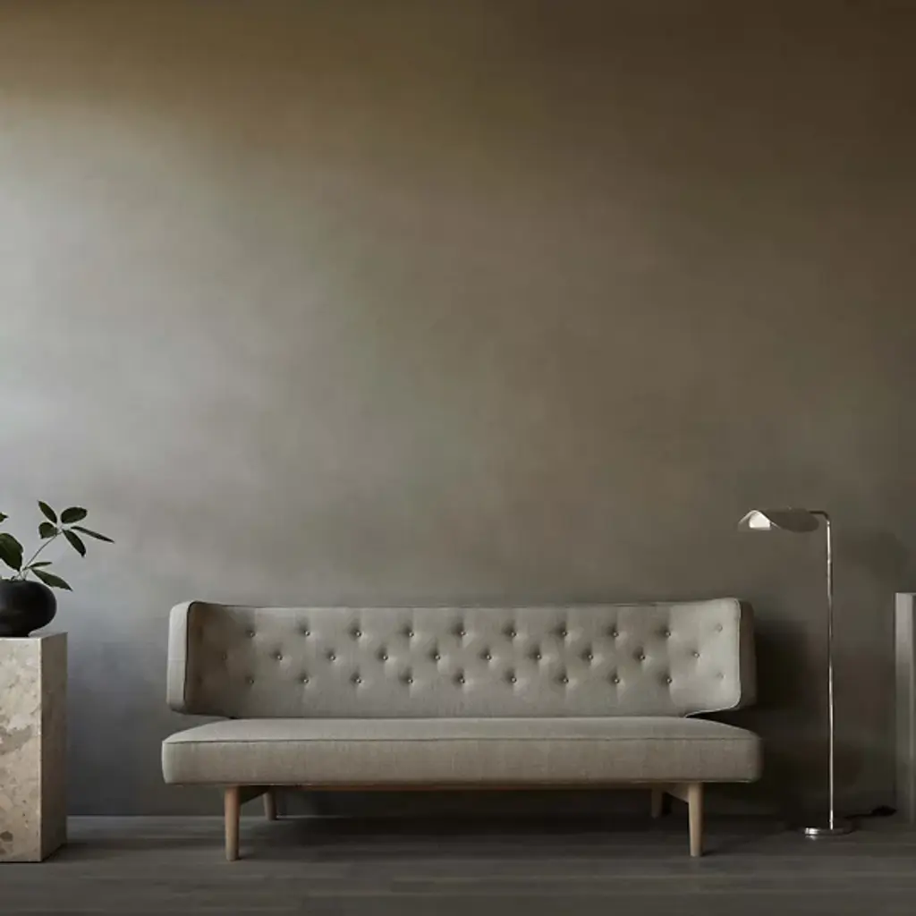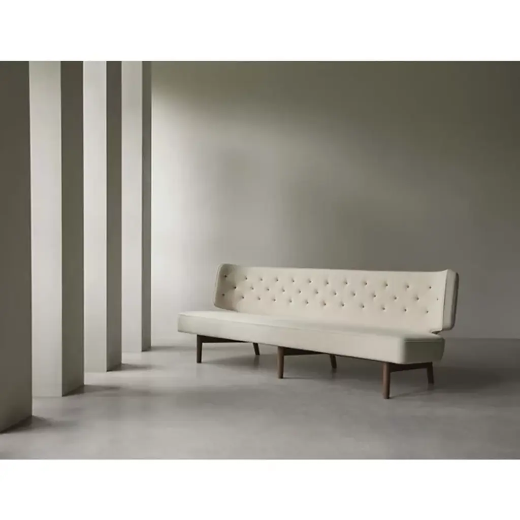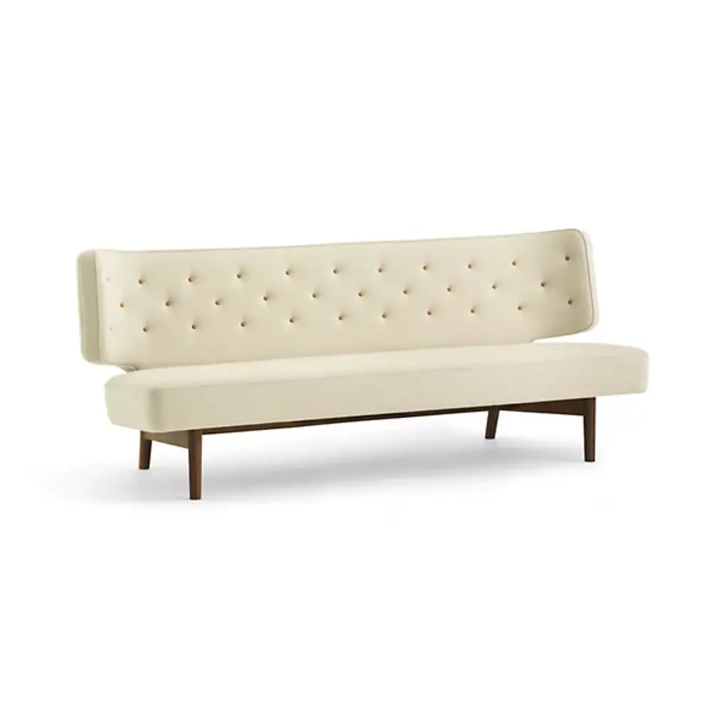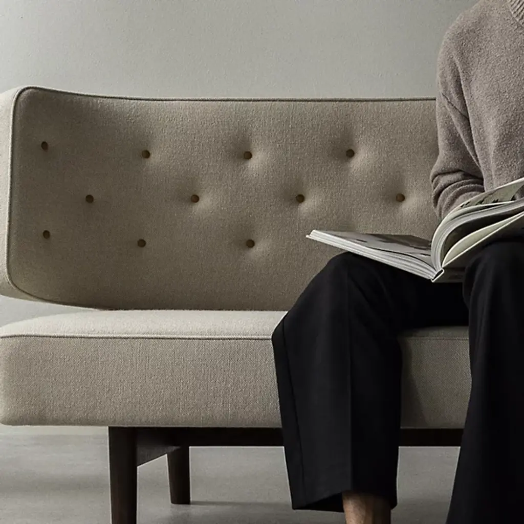 The Radiohus Sofa from Audo Copenhagen, formerly Menu, is a standout example of mid-century modern design, its button pattern providing playful appeal with precise comfort as it offers a generous seating surface. A lasting design from influential Danish architect Villhelm Lauritzen, it was originally designed for Denmark’s “Radio House” in 1935, and hasn’t missed a step since. An outstanding example of innovation and functional prowess, the piece represents Lauritzen’s forward-thinking process with a striking backrest that subtly cradles the sitter on the sides. A button-tufted back adds texture and visual interest, the generous fill material offering plush comfort complemented by rounded corners that contrast beautifully with the architectural angles of the wood base.