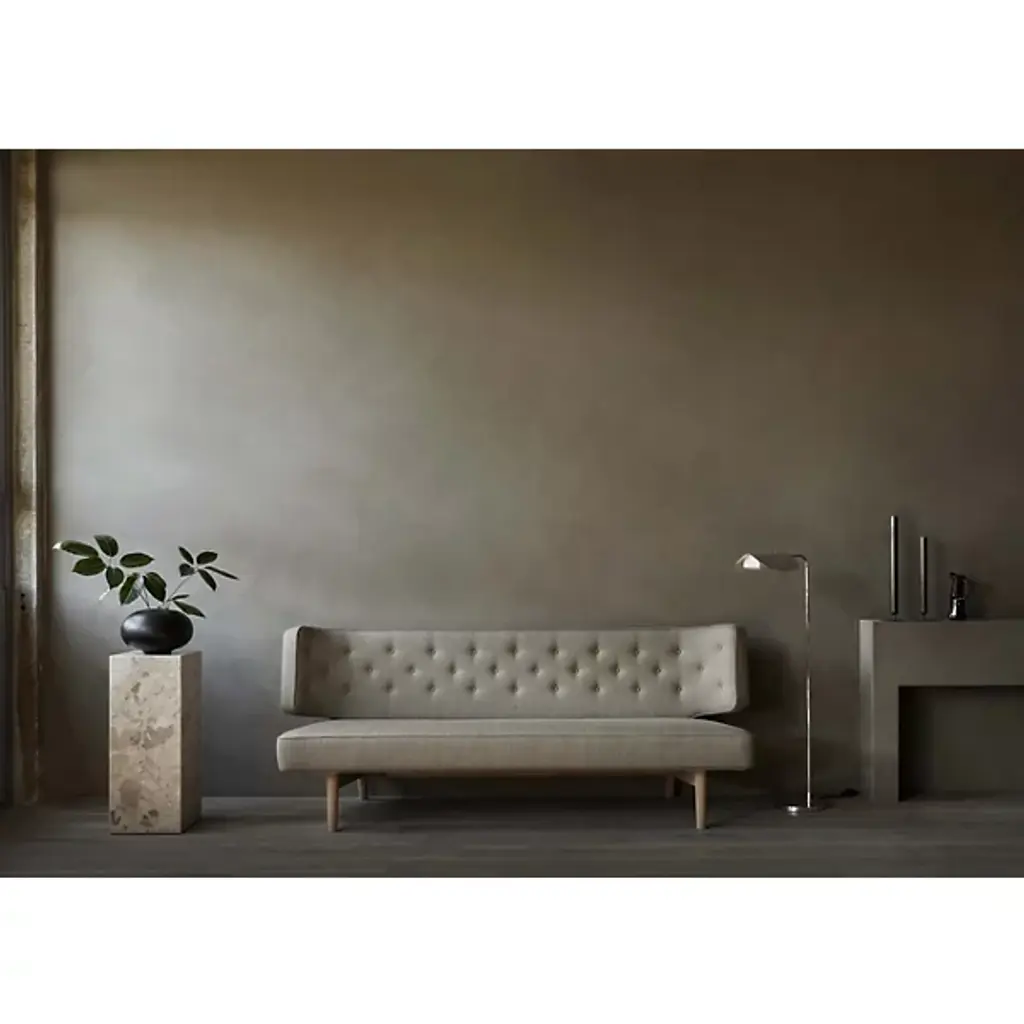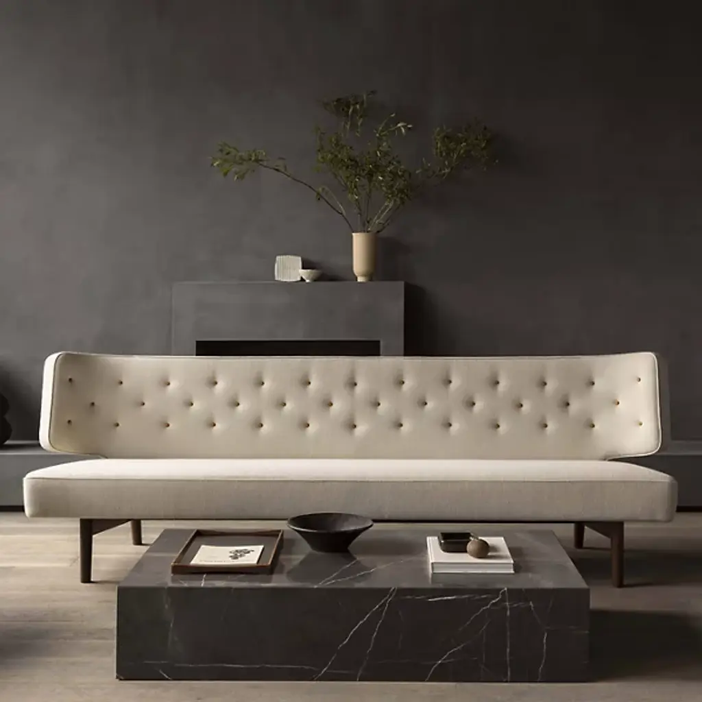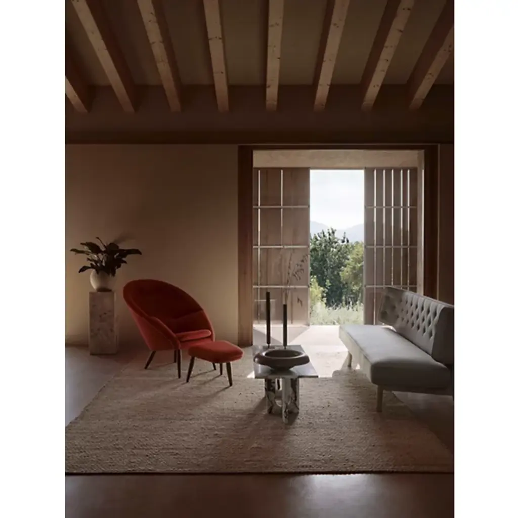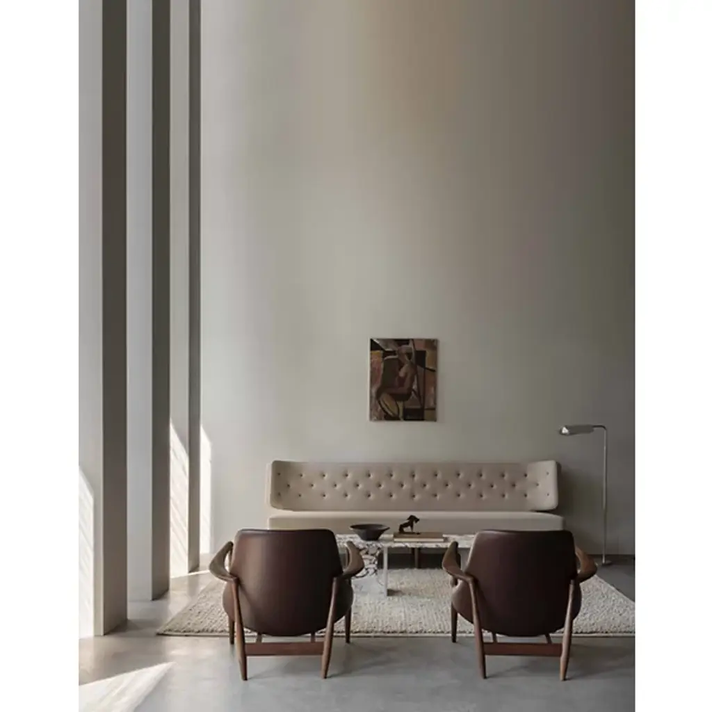 The Radiohus Sofa from Audo Copenhagen, formerly Menu, is a standout example of mid-century modern design, its button pattern providing playful appeal with precise comfort as it offers a generous seating surface. A lasting design from influential Danish architect Villhelm Lauritzen, it was originally designed for Denmark’s “Radio House” in 1935, and hasn’t missed a step since. An outstanding example of innovation and functional prowess, the piece represents Lauritzen’s forward-thinking process with a striking backrest that subtly cradles the sitter on the sides. A button-tufted back adds texture and visual interest, the generous fill material offering plush comfort complemented by rounded corners that contrast beautifully with the architectural angles of the wood base.