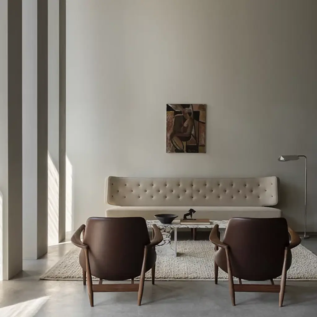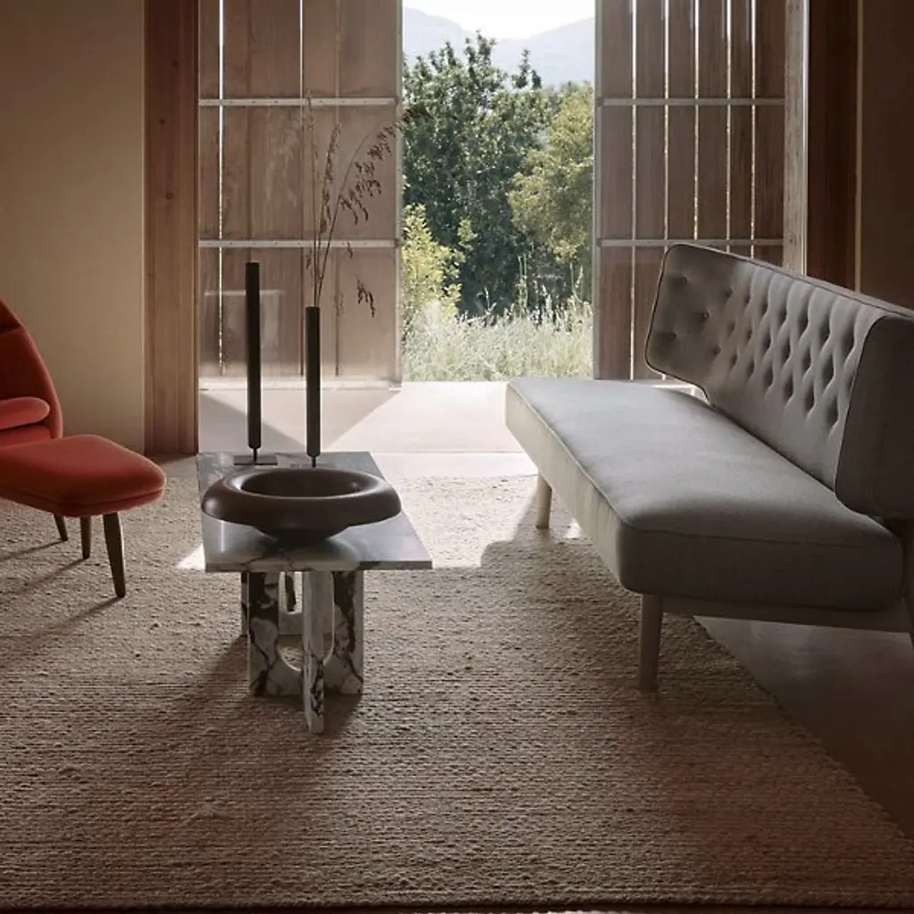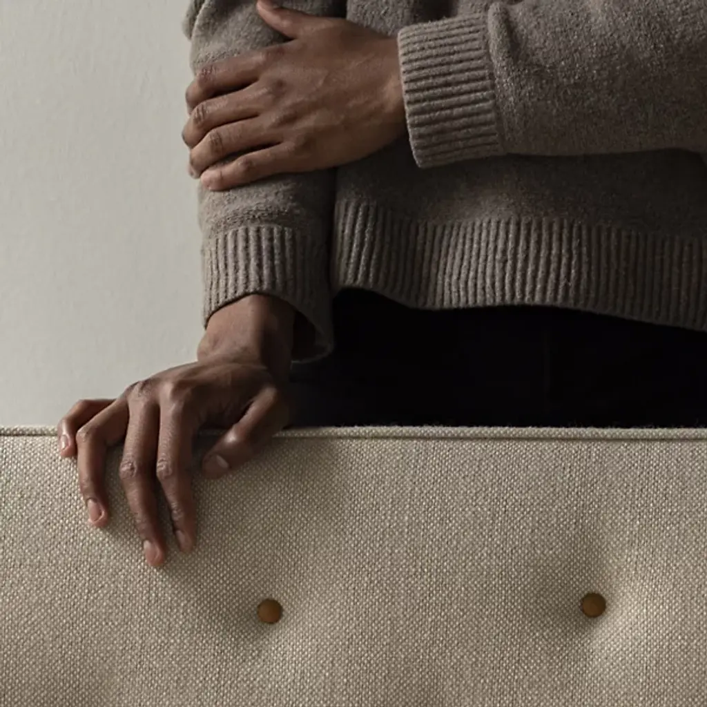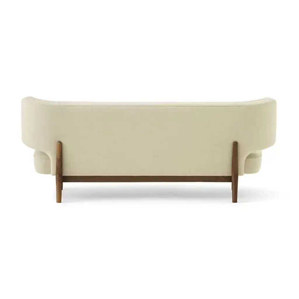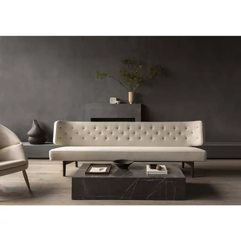 The Radiohus Sofa from Audo Copenhagen, formerly Menu, is a standout example of mid-century modern design, its button pattern providing playful appeal with precise comfort as it offers a generous seating surface. A lasting design from influential Danish architect Villhelm Lauritzen, it was originally designed for Denmark’s “Radio House” in 1935, and hasn’t missed a step since. An outstanding example of innovation and functional prowess, the piece represents Lauritzen’s forward-thinking process with a striking backrest that subtly cradles the sitter on the sides. A button-tufted back adds texture and visual interest, the generous fill material offering plush comfort complemented by rounded corners that contrast beautifully with the architectural angles of the wood base.