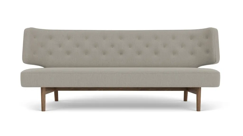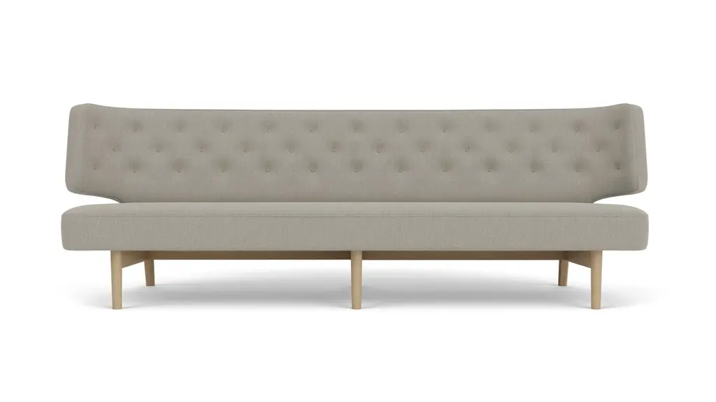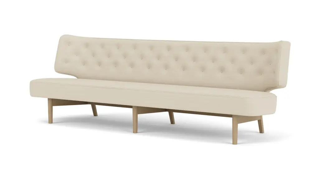 An exclusive and rare design from Vilhelm Lauritzen, the Radiohus Sofa was designed for Denmarks Radio House today the Royal Danish Academy of Music in 1936. A pioneering piece of Nordic Functionalism, the elegant design shunned the conservative and straight lines of the time in favor of a more futuristic expression. Beautiful from all angles, its curved lines and open construction welcome and embrace the sitter, while the quilted back highlights the exactness of its design. A piece of furniture that requires space, let it stand freely in a room. Designed by Vilhelm Lauritzen for Audo Copenhagen North America.