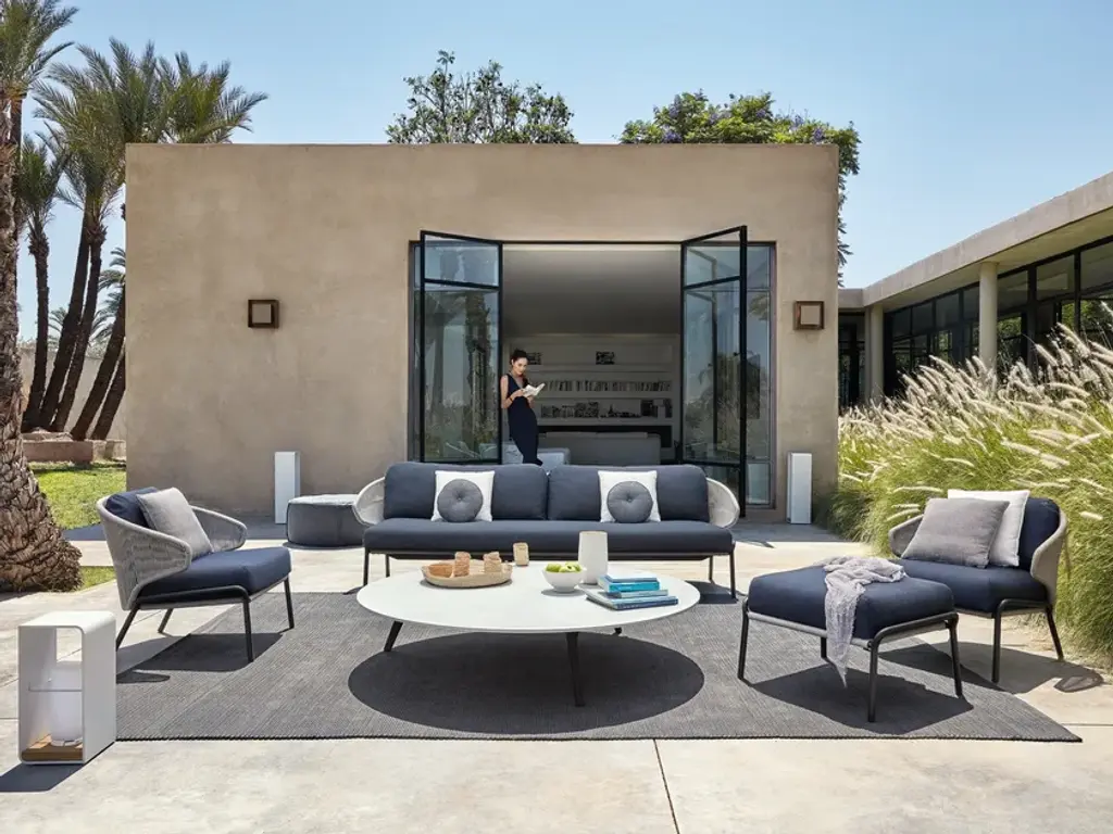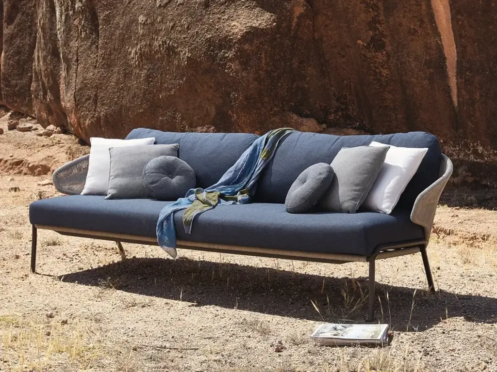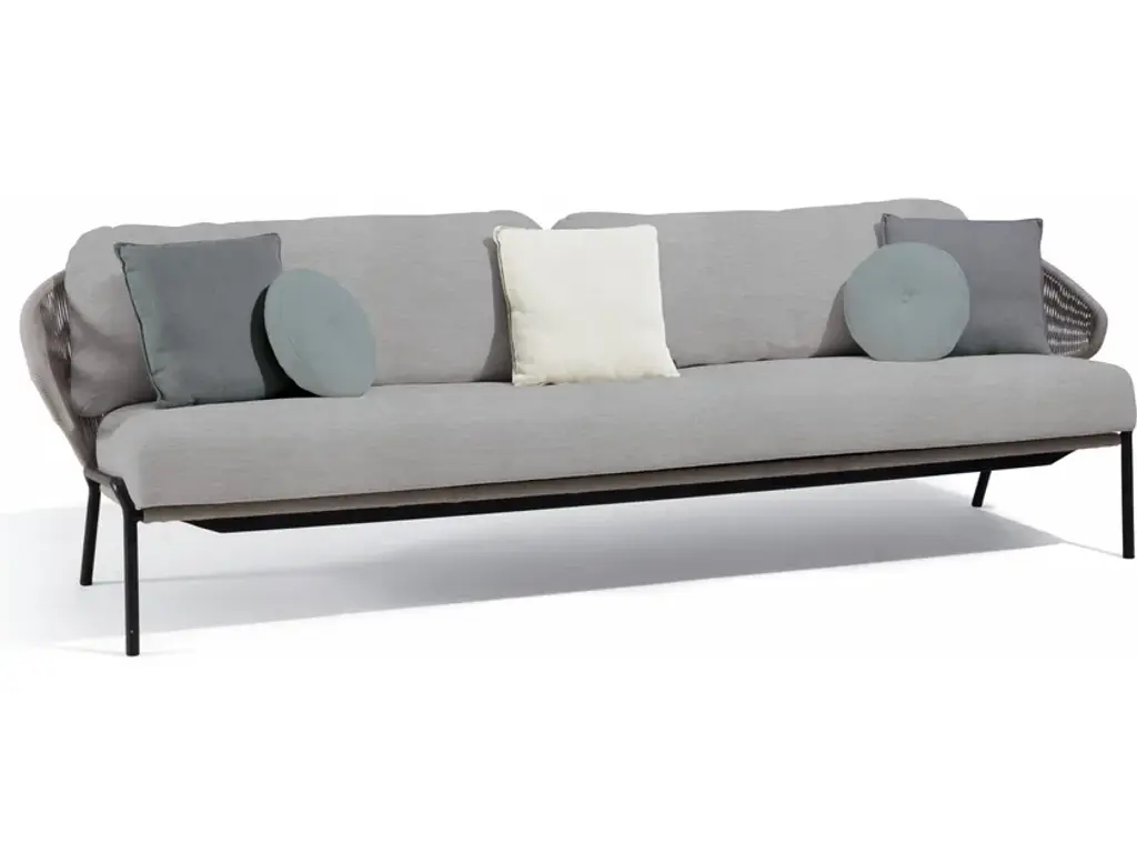 Radius 3 seaterFrame made of thermo-lacquered Lava aluminium, and Bronze or Silver rope. Seat cushion, 2 back cushions and 5 deco cushions.The unique, airy design of the RADOC chair, footstool, lounge chair and sofa collection is perfect for exquisite moments of warmth and closeness. The wrap-around back and armrests, made entirely out of rope, blend seamlessly and give each piece a neomodern yet timeless look and feel. Keep it sober or opt for matching backrest cushions designed for optimal seating comfort for long get-togethers.