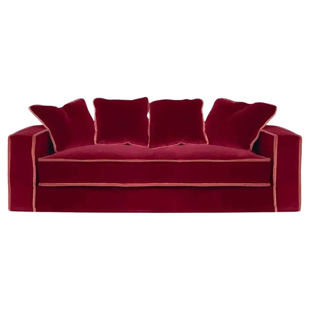 This luxurious and generous sofa is smooth to the touch and ultra comfortable. The deep seats and soft fabric make sinking in true pleasure. Rafaella's angular profile gives this revival style a modern twist, and its plush cushions add comfort and a charming contrast. This model features a striking combination of bordeaux velvet with a trim of burnt orange velvet. Biosofa is the only producer of 100% natural and plastic-free sofas worldwide.