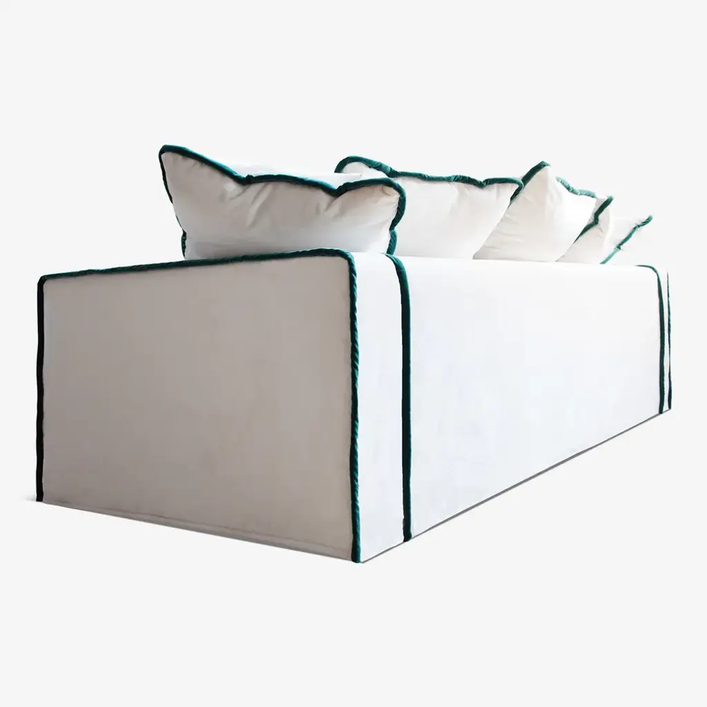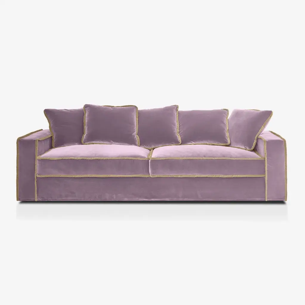 Smooth sophistication with the rafaella 3 seater sofa immerse yourself in the lap of luxury with our rafaella 3 seater sofa—a seamless blend of comfort and modern elegance. This generously sized sofa invites you to experience the sublime softness of its fabric, offering a touch that's both smooth and comforting. The deep seats ensure that sinking into relaxation becomes a true pleasure. rafaella's angular profile adds a contemporary twist to its revival style, while plush cushions contribute to a delightful contrast. Ideal for lounging on cozy evenings and extended weekends, rafaella promises to be a chic and inviting addition to your home. Customize your experience by choosing a contrasting trim, infusing modern lines and a vibrant splash of color into your living space. elevate your ambiance with the exquisite combination of smooth luxury and contemporary flair that rafaella effortlessly provides. materials internal frame: solid dried beech wood, jute belts with steel springs. padding: 100% natural latex, goose down layer, pressed cotton. finishing: choice of 100% natural cotton velvet, steel and cotton zippers, removable cover.