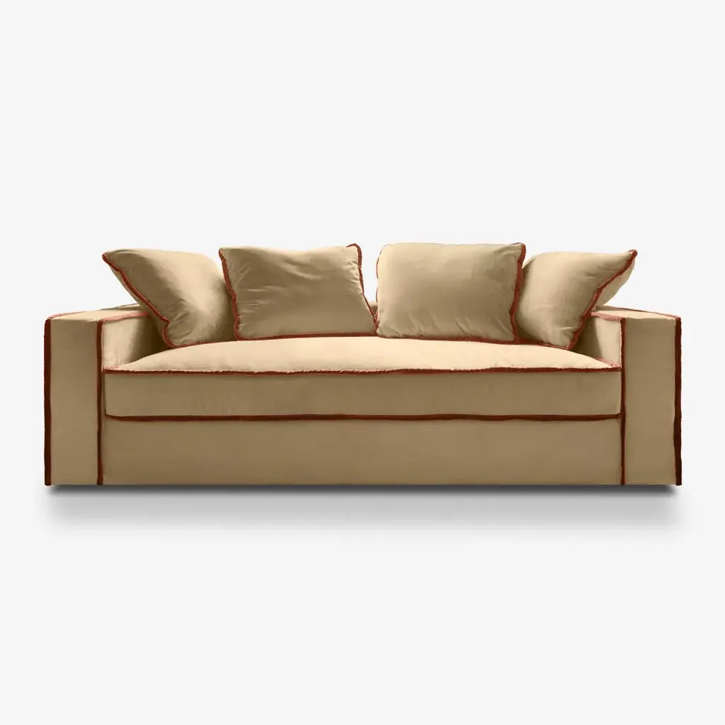 BRIGHT LUXURY Introducing Rafaella, the playful companion to our bestselling Rafael sofa. This luxurious and generous sofa, designed by Davide Barzaghi, offers smooth, soft luxury with a contrasting trim. The deep seats and soft fabric provide an ultra-comfortable experience, making relaxation a true pleasure. Rafaella's angular profile adds a modern twist to the revival style, while plush cushions ensure both comfort and charming contrast. Perfect for lounging in the evening and on long weekends, Rafaella is a delightfully cozy and chic addition to your home, featuring a soft velvet trim in contrasting colors. Crafted with an internal frame of solid dried beech wood and jute belts with steel springs, Rafaella prioritizes quality. Elevate your space with Rafaella's inviting and stylish presence. MATERIALS Internal frame: solid dried beech wood, jute belts with steel springs. Padding: 100% natural latex, goose down layer, pressed cotton. Finishing: choice of 100% natural cotton velvet, steel and cotton zippers, removable cover. Labeled by Maker