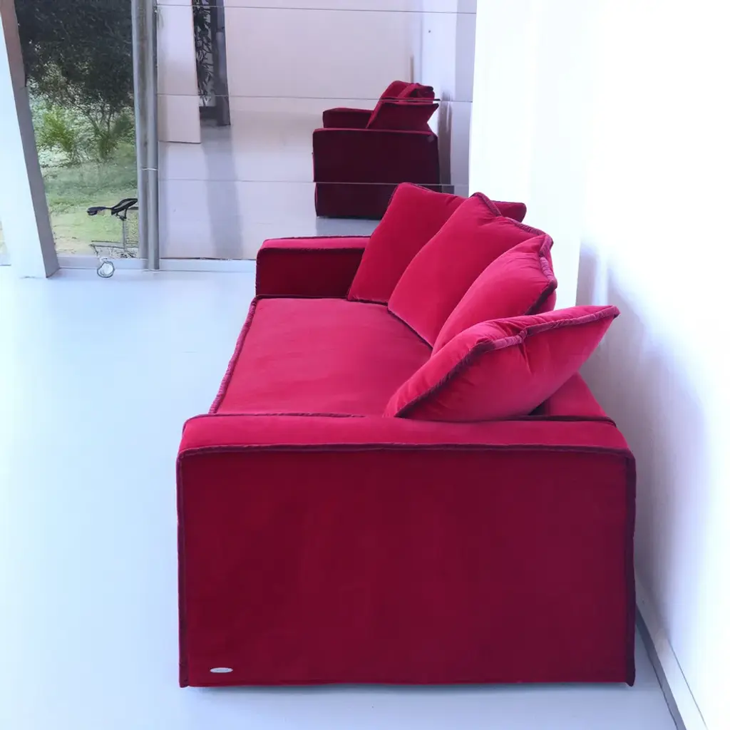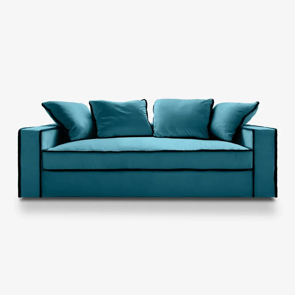 BRIGHT LUXURY Introducing Rafaella, the playful companion to our bestselling Rafael sofa. This luxurious and generous sofa, designed by Davide Barzaghi, offers smooth, soft luxury with a contrasting trim. The deep seats and soft fabric provide an ultra-comfortable experience, making relaxation a true pleasure. Rafaella's angular profile adds a modern twist to the revival style, while plush cushions ensure both comfort and charming contrast. Perfect for lounging in the evening and on long weekends, Rafaella is a delightfully cozy and chic addition to your home, featuring a soft velvet trim in contrasting colors. Crafted with an internal frame of solid dried beech wood and jute belts with steel springs, Rafaella prioritizes quality. Elevate your space with Rafaella's inviting and stylish presence. MATERIALS Internal frame: solid dried beech wood, jute belts with steel springs. Padding: 100% natural latex, goose down layer, pressed cotton. Finishing: choice of 100% natural cotton velvet, steel and cotton zippers, removable cover. Labeled by Maker