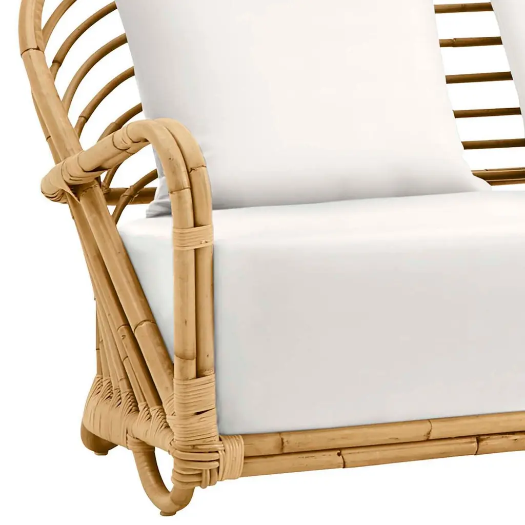 Crafted with meticulous attention to detail, the Rattan 2-Seater Sofa boasts a timeless design inspired by a 1936 creation from Arne Jacobsen. Known for his iconic use of parallel curves, this sofa embodies strength and elegance. Handcrafted by skilled wicker artisans, it features distinctive looped front and back legs for a touch of sophistication. With double caned arms, a plush wedge bench-style seat cushion, and loose pillow backs, it offers unparalleled comfort. A part of an esteemed collection, this sofa seamlessly complements both residential and hospitality spaces, making it a standout piece in any setting.