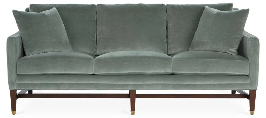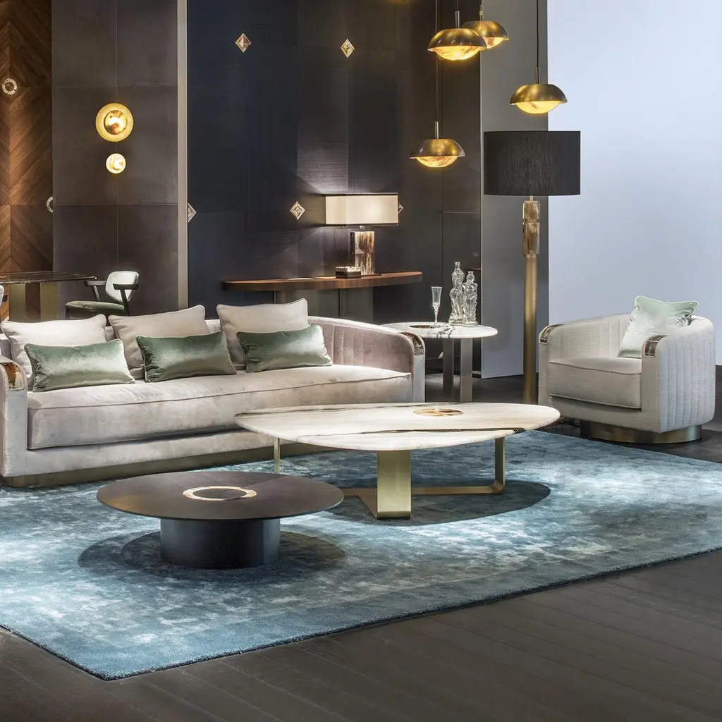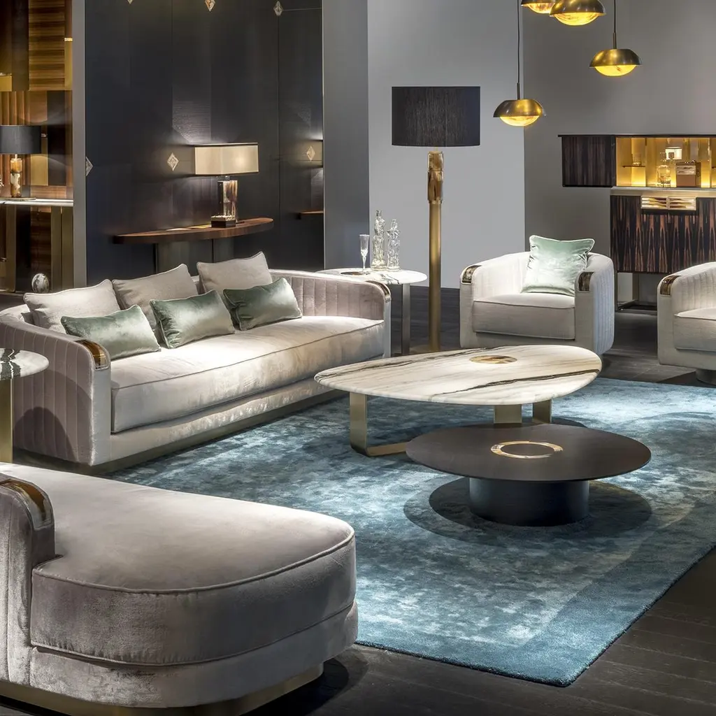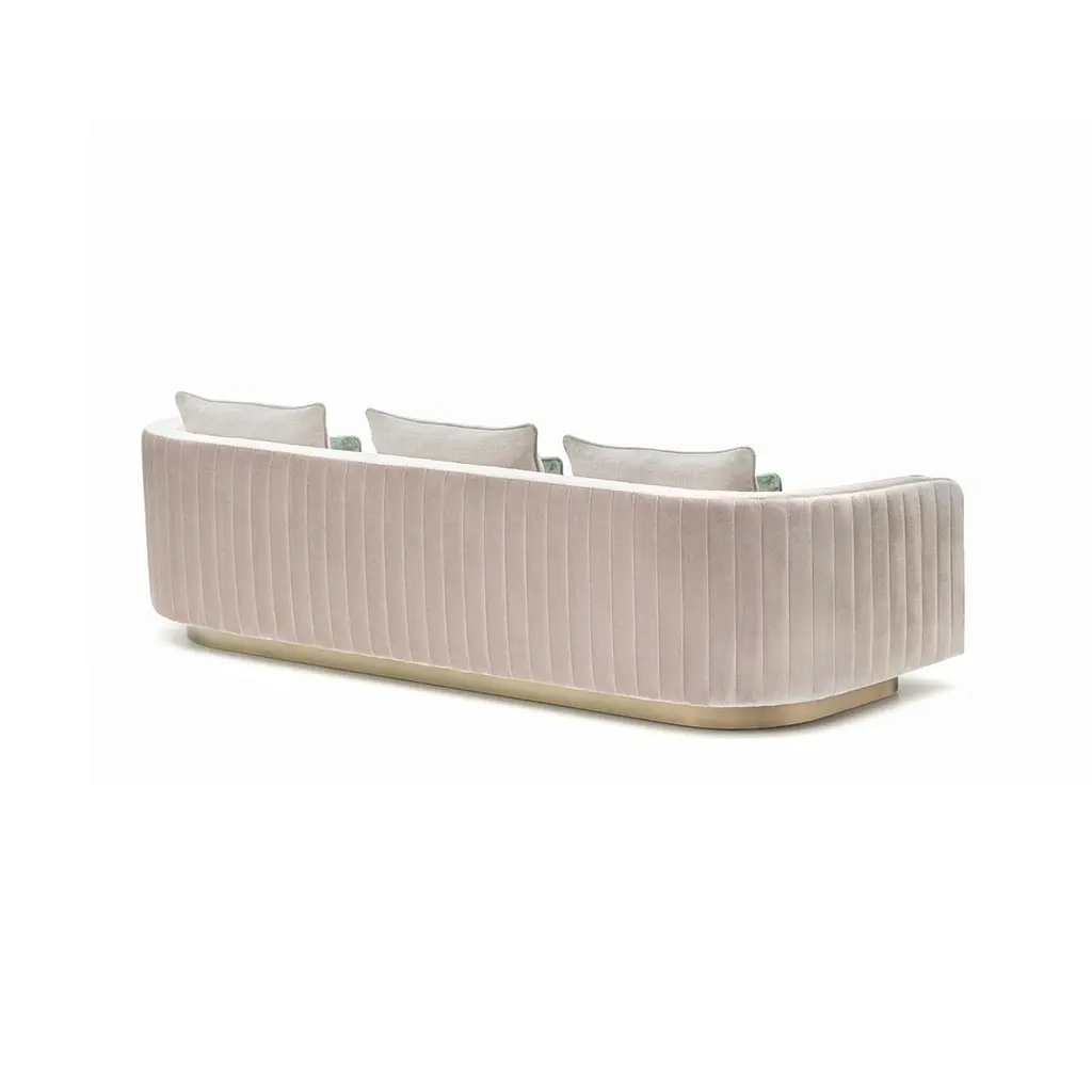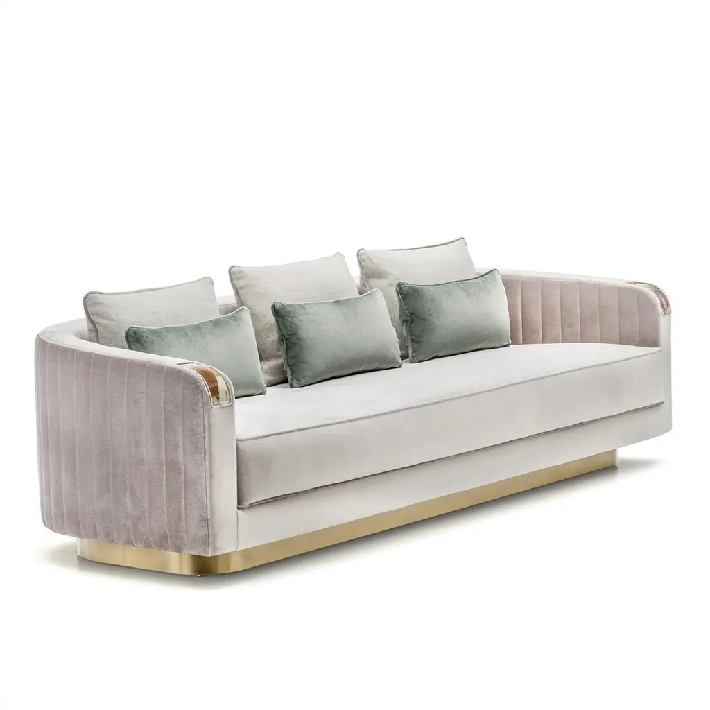 A superb object of functional decor, this sofa will imbue a living room with modern sophistication, while also being a comfortable three-seater. Upholstered in Splendido velvet, with vertical tufting on the enveloping back and armrests, this magnificent piece boasts a pearly white color that complements the glossy horn inserts on both armrests and wooden base with a satin brass finish. Inside, the softness of the seat is ensured by expanded polyurethane foam, goose down, and memory foam padding. Customized dimensions and finishes available - please ask the Concierge for details.