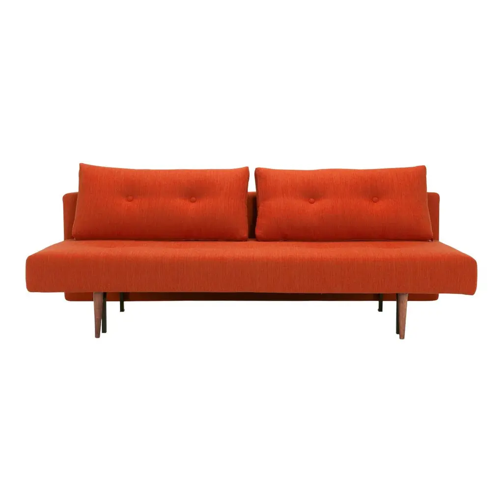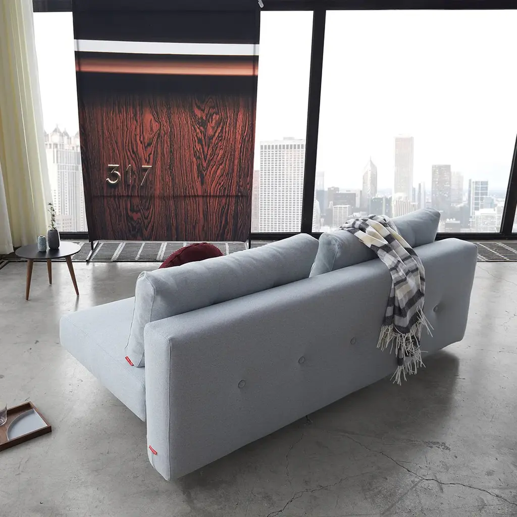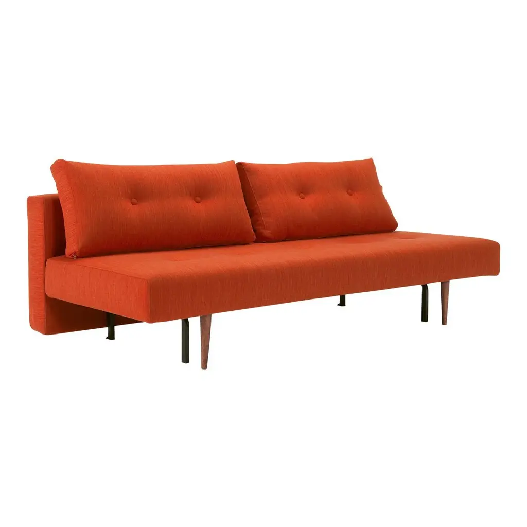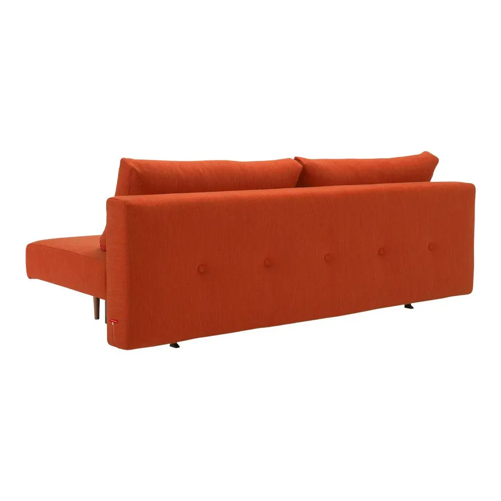 The simplicity of the design and voluptuousness of the cushions is underscored by the integrated buttons. A subtle comment on the sofa's desire for simple comfort. Remove the cushions and you have a single bed. Slide out the seat, flip down the backrest and you have a double bed. Perfect for small living.