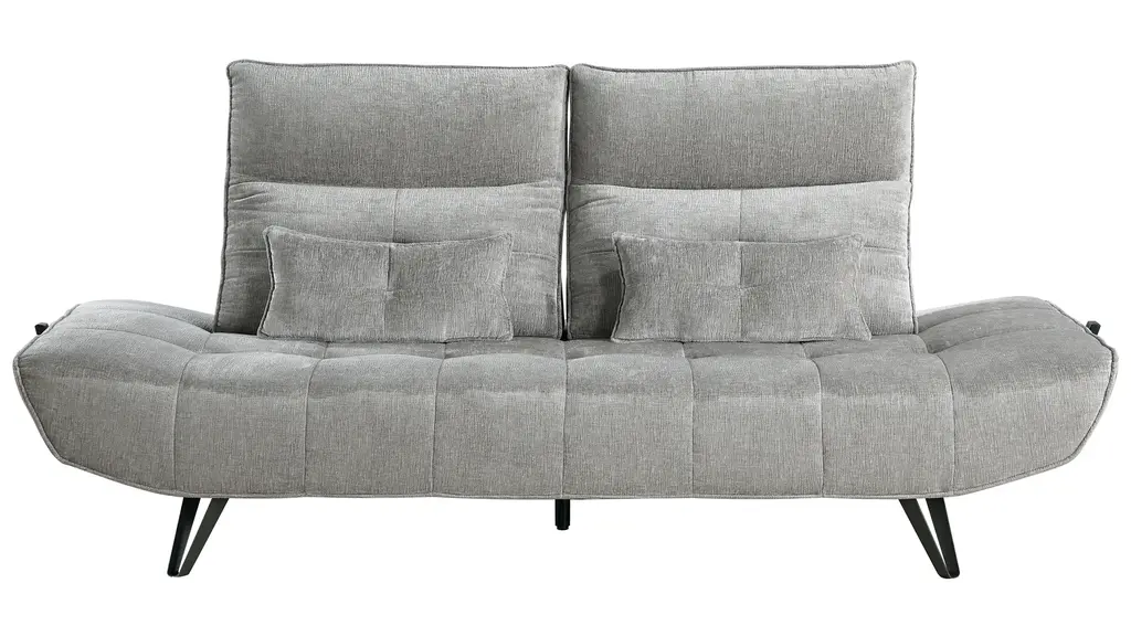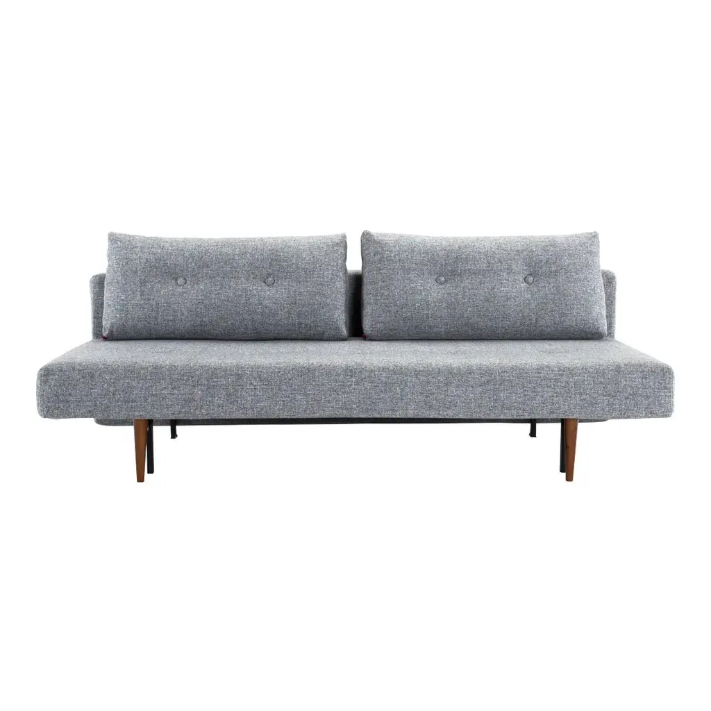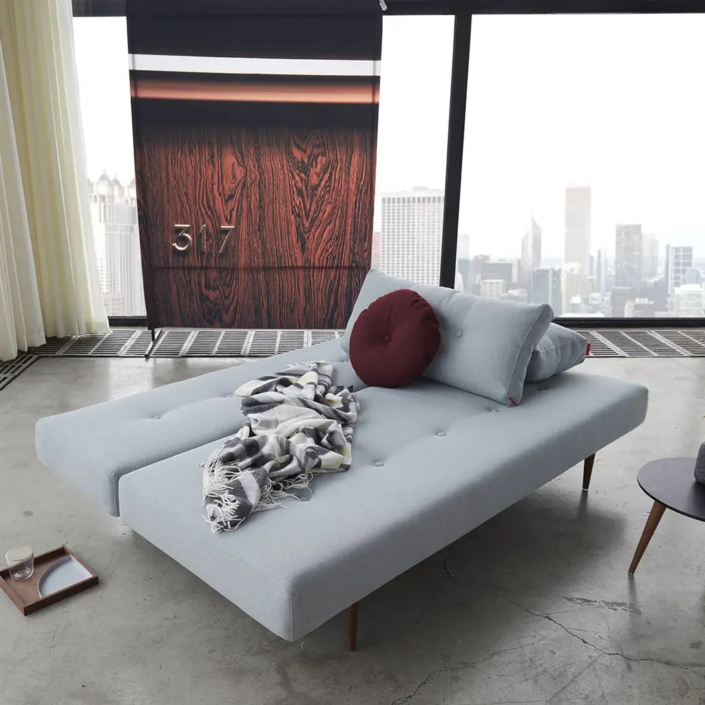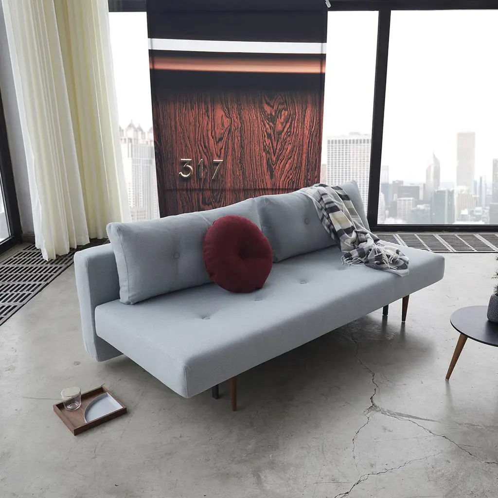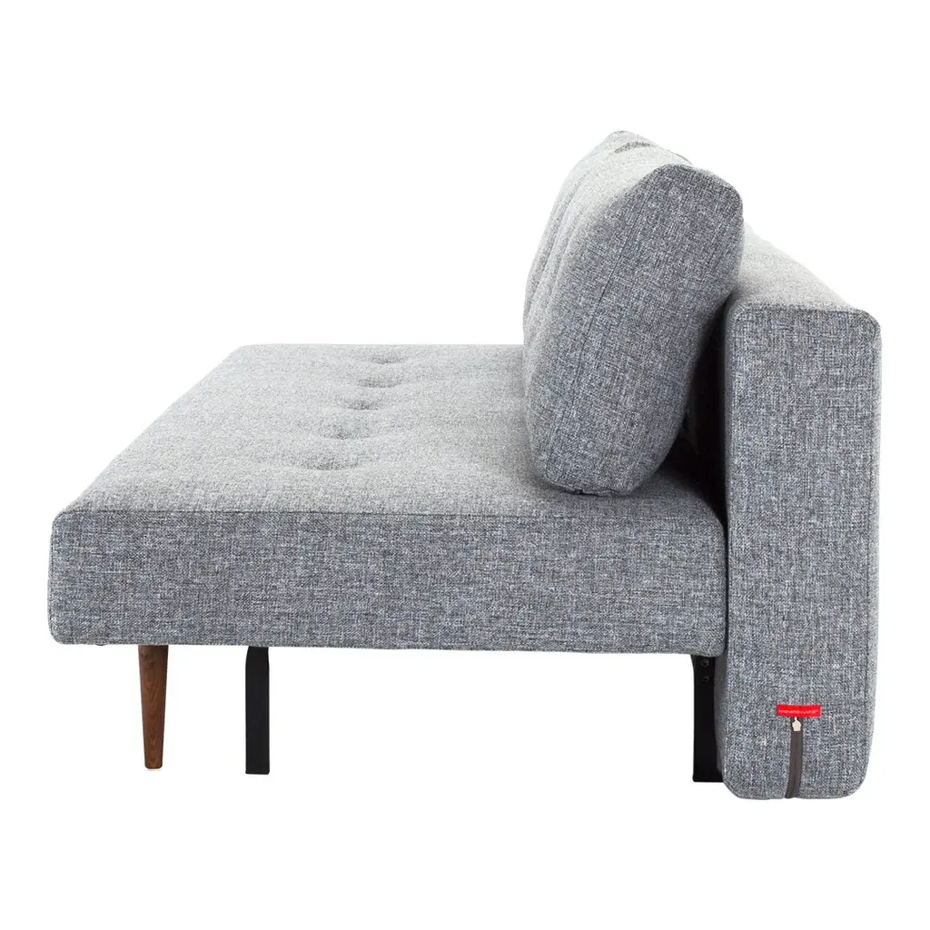 The simplicity of the design and voluptuousness of the cushions is underscored by the integrated buttons. A subtle comment on the sofa's desire for simple comfort. Remove the cushions and you have a single bed. Slide out the seat, flip down the backrest and you have a double bed. Perfect for small living.