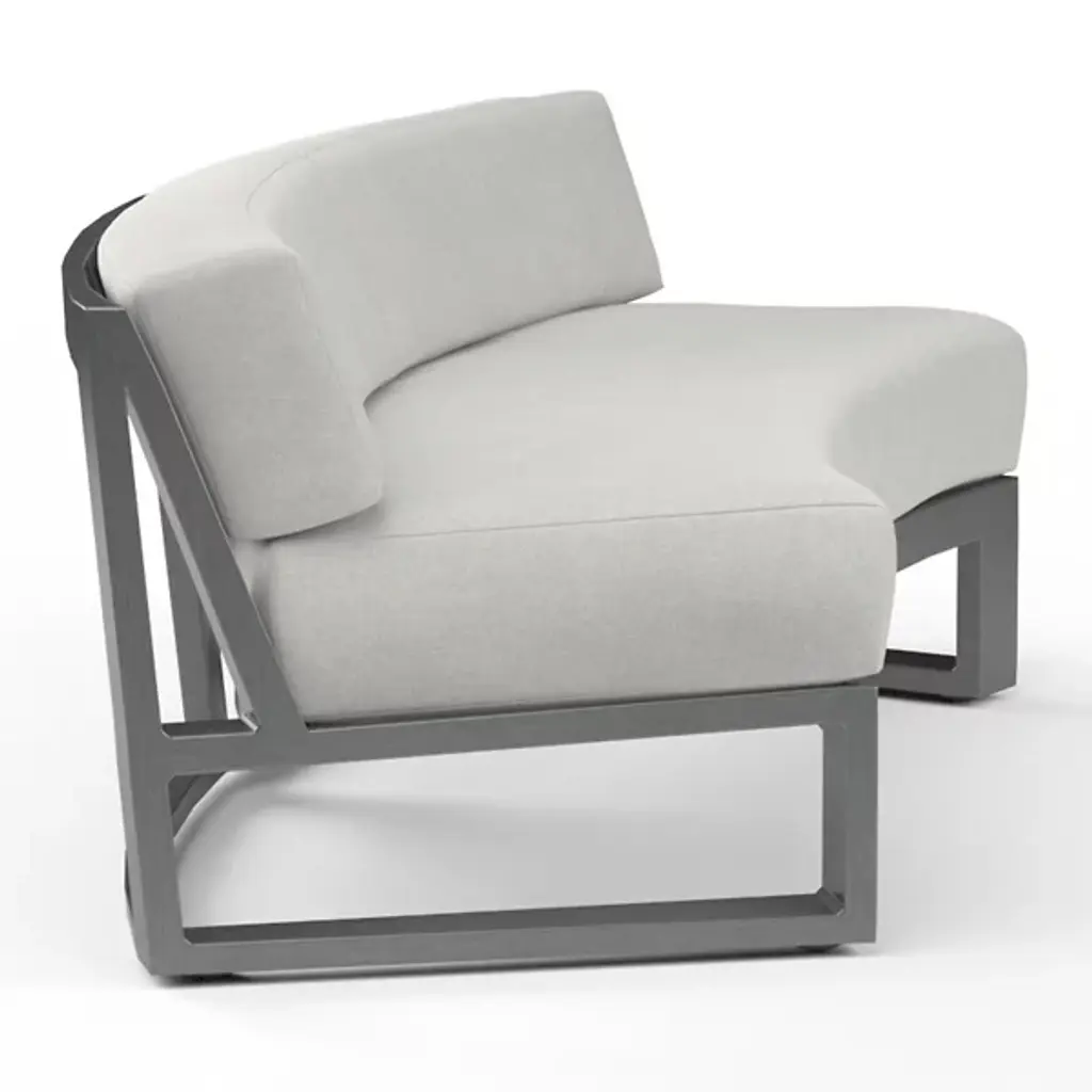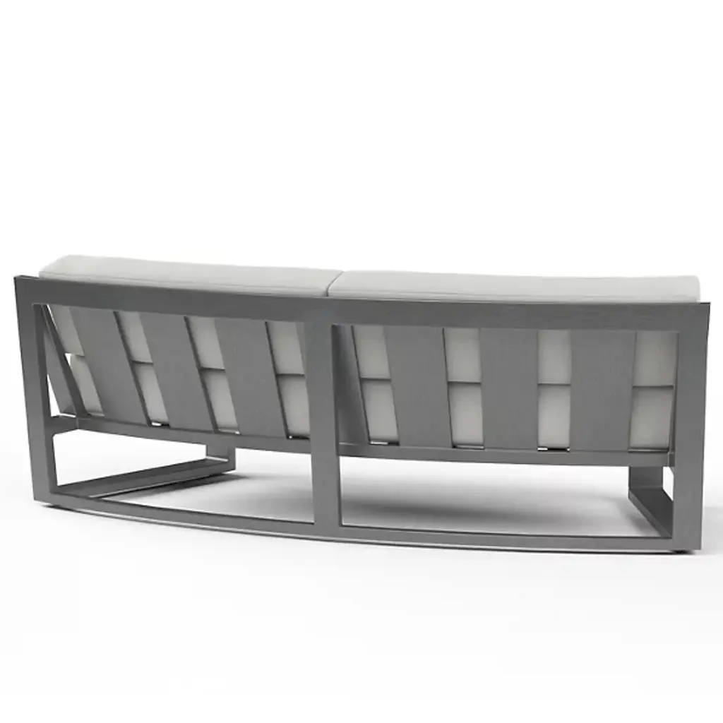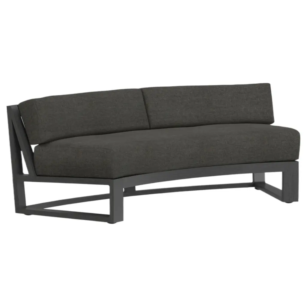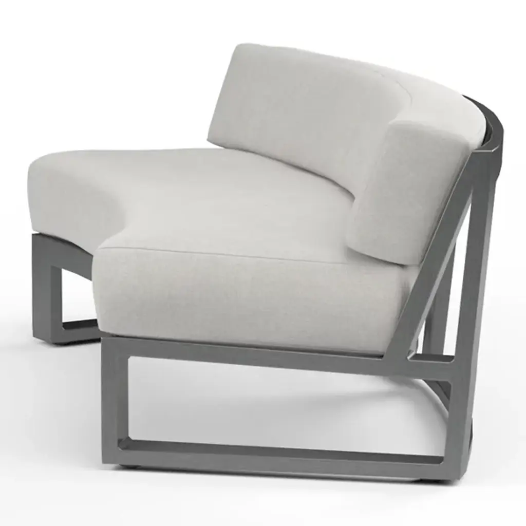 The Redondo Outdoor Curved Sofa from Sunset West arcs through gentle geometry that softens the collection's typically angular aesthetic while maintaining mid-century design principles. Curved configuration encourages intimate conversation flow while plush cushioning invites extended relaxation during outdoor gatherings. Linear aluminum framework contrasts beautifully with rounded seating to create dynamic tension between structure and comfort. Hand-brushed slate finish develops natural patina that enhances artisanal character through seasonal changes. The curved form draws people together naturally during conversations and gatherings.