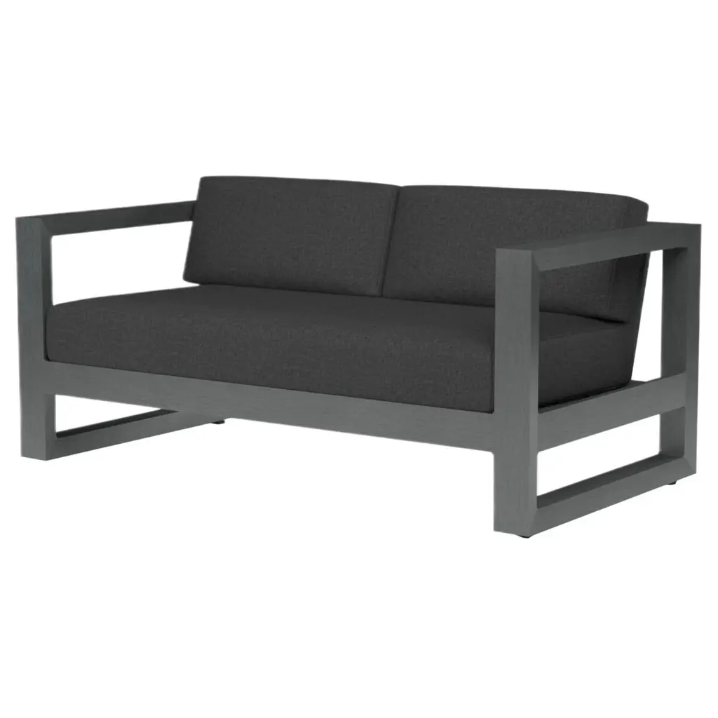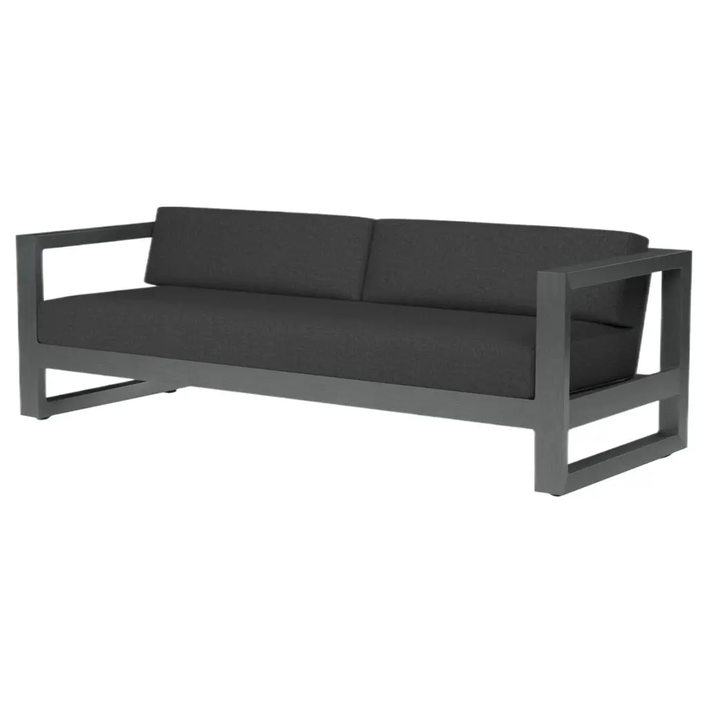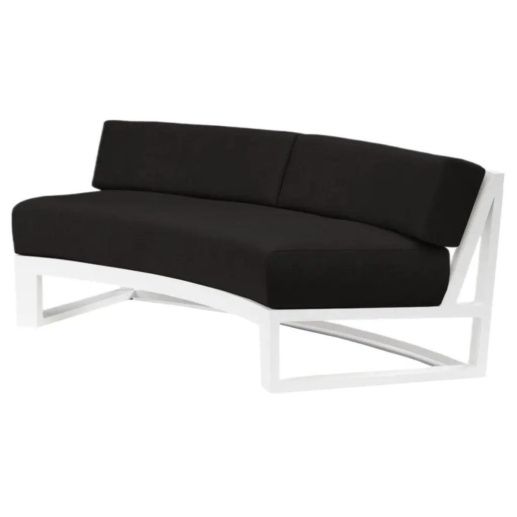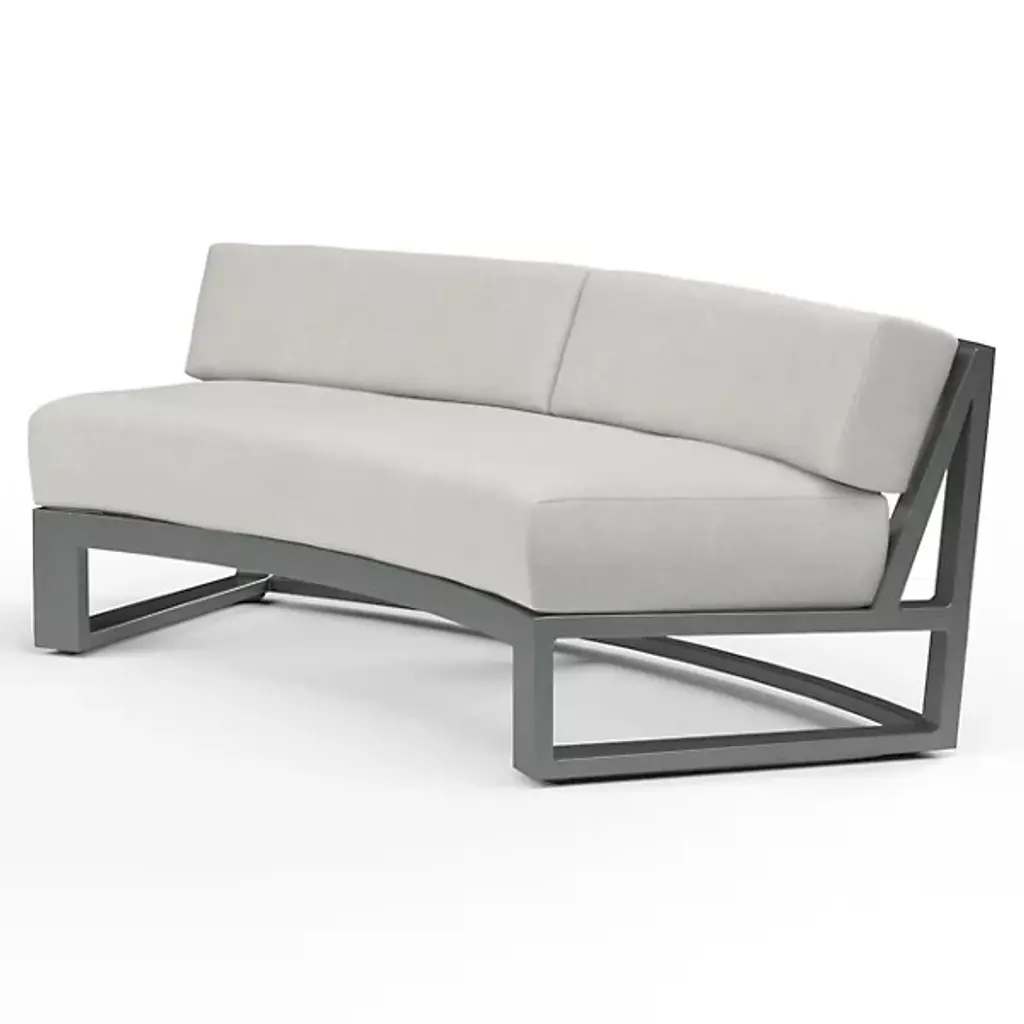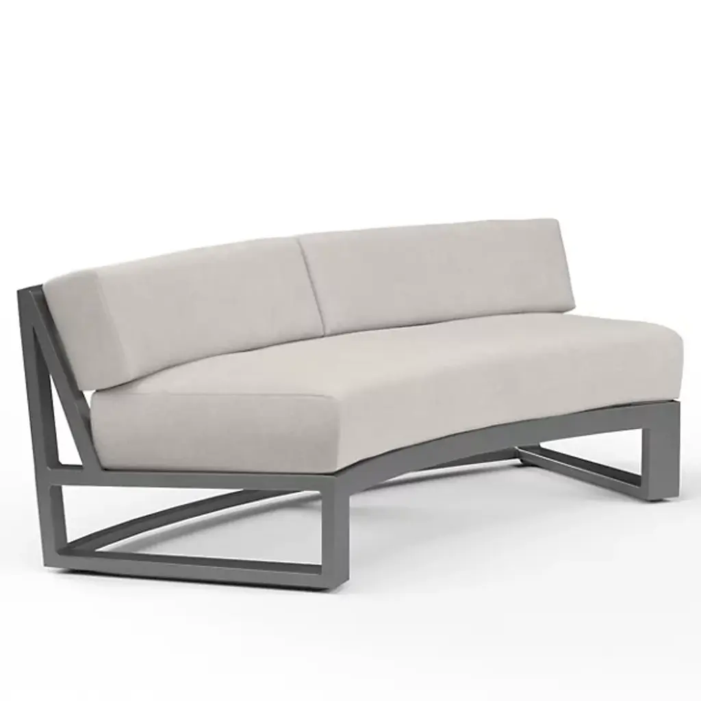 The Redondo Outdoor Curved Sofa from Sunset West arcs through gentle geometry that softens the collection's typically angular aesthetic while maintaining mid-century design principles. Curved configuration encourages intimate conversation flow while plush cushioning invites extended relaxation during outdoor gatherings. Linear aluminum framework contrasts beautifully with rounded seating to create dynamic tension between structure and comfort. Hand-brushed slate finish develops natural patina that enhances artisanal character through seasonal changes. The curved form draws people together naturally during conversations and gatherings.