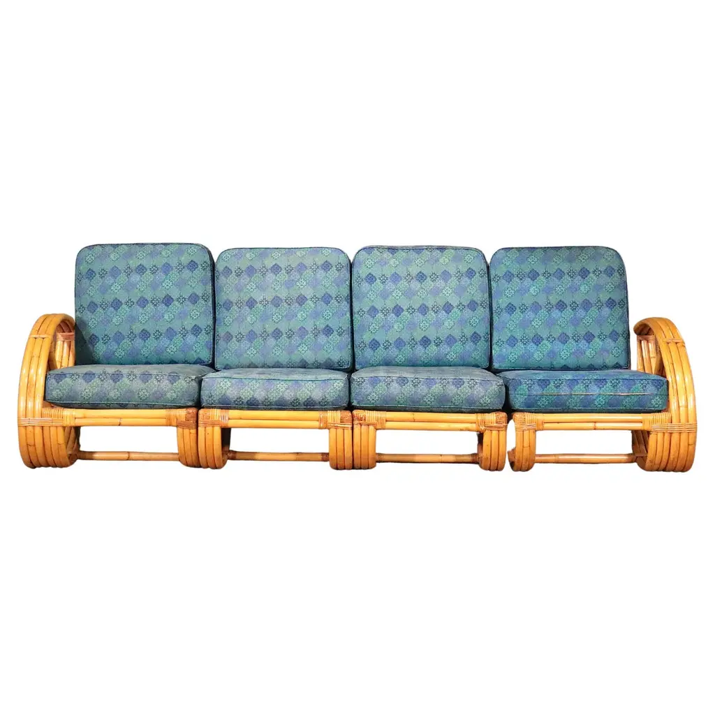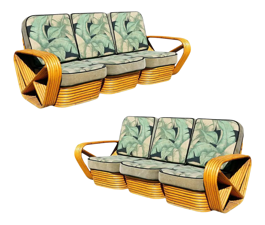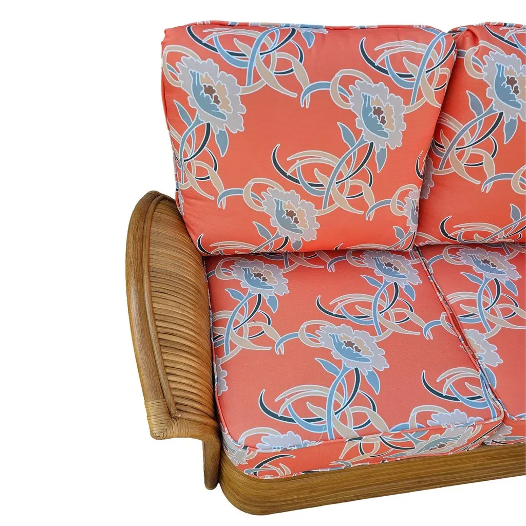 This beautifully restored rattan blending style vintage charm with modern comfort. Rattan Fan 3 seat sofa with the same fabric as seen in the original "Golden Girls" show which ran from 1985 till 1992. Harvey Schwartz was the original supplier of the rattan living room set used in all seven seasons of The "Golden Girl". All meticulously refinished to highlight the natural rattan’s warmth and durability. It is perfect for creating a stylish and cozy tropical-inspired Paul Frankl-designed living space.Rattan is more than just furniture—it's a statement of style, uniqueness, and timeless elegance. Frequently featured in home design magazines and advertisements worldwide, rattan's appeal lies in its ability to blend classic charm with contemporary aesthetics effortlessly.We take pride in offering the finest rattan available, showcasing expert craftsmanship through meticulously restored pieces built to last. Every item in our collection is revitalized with precision—wrappings repaired, connections reinforced, and a durable protective finish applied. Paired with fresh, perfectly fitted cushions, our rattan furniture delivers unparalleled comfort and beauty for your home or workspace. We have almost 100 years of expertise and know how to properly refinish and fully strengthen your rattan furnitureOur high-resolution photos capture the flawless condition and timeless style of each piece, highlighting rattan's enduring quality. With furniture that has stood the test of time—lasting 60 to 100 years—and now expertly restored to endure another 75, our collection represents both heritage and innovation. Stylish, unique, and versatile, rattan furniture remains a timeless choice, perfect for any setting.Cushions made to order included. The cushions pictured in these photos are for display use only, we might have them please ask. All cushions are C.O.M (customers' own material) simply send us your fabric and we will have the cushions made for you. New cushions take 2 weeks to be completed.Harvey Schwartz is the leading expert in vintage rattan and the author of "Rattan Furniture: Tropical Comfort Throughout the Home." Signed copies are available for 39.99 USD. The hardbound 160-page full-color book details the fascinating History of rattan with photos of wonderful vintage and modern-day tropical décors and rattan. The book is great for any newcomer to rattan wanting to learn as well as a top resource for dealers and designers alike.We fully guarantee your complete satisfaction!-Dimensions-Sofa: 33in. H x 77in. W x 36in. D.MARCSS