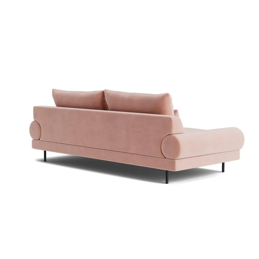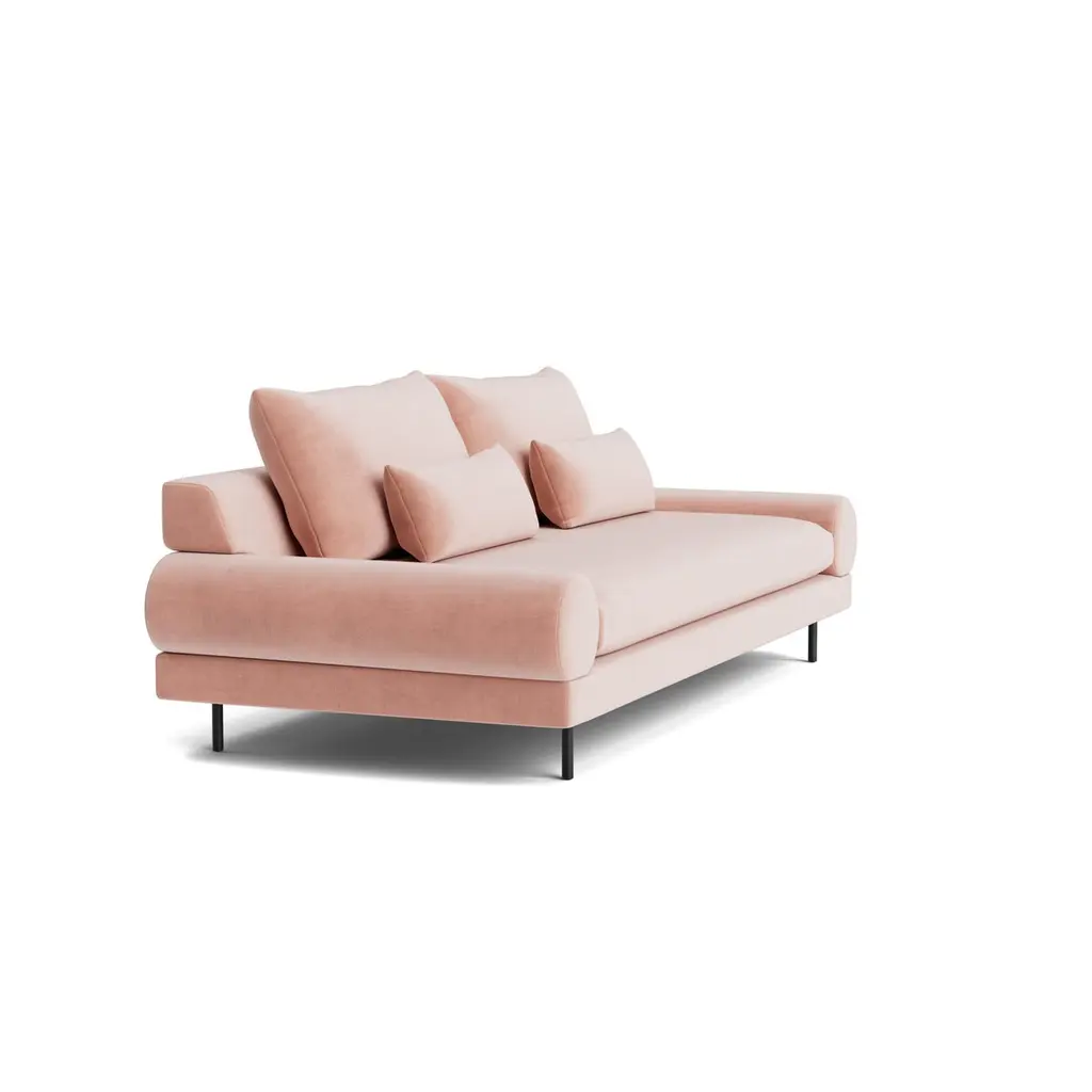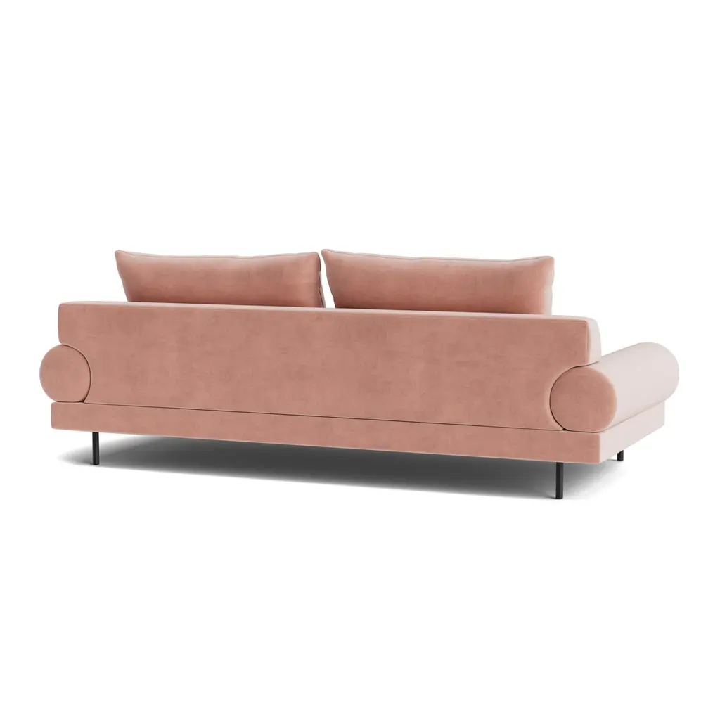 Our retro take on a roll arm sofa. Cylindrical arms, a deep bench seat, and split back cushions sit atop an ultra-thin deck elevated on cylindrical steel legs to create a sleek, retro feel. Made in America, and endlessly customizable.