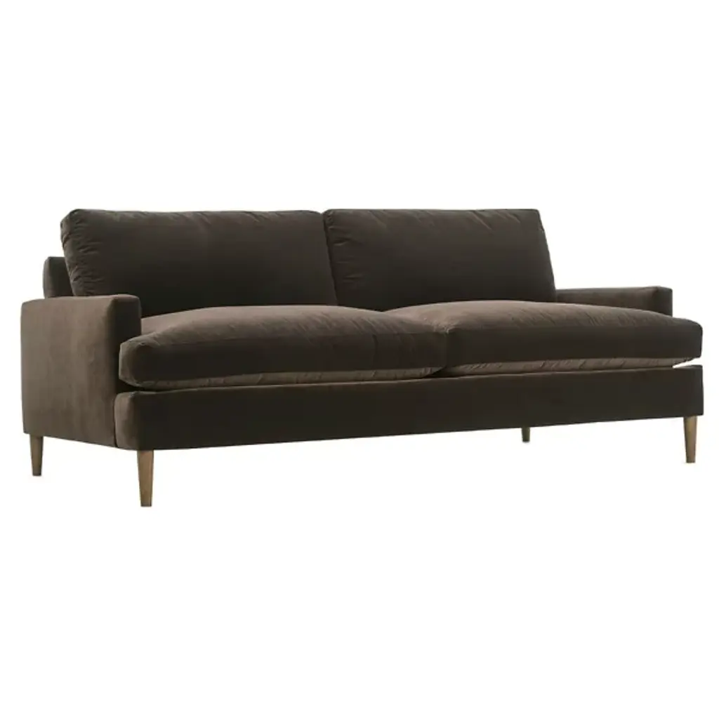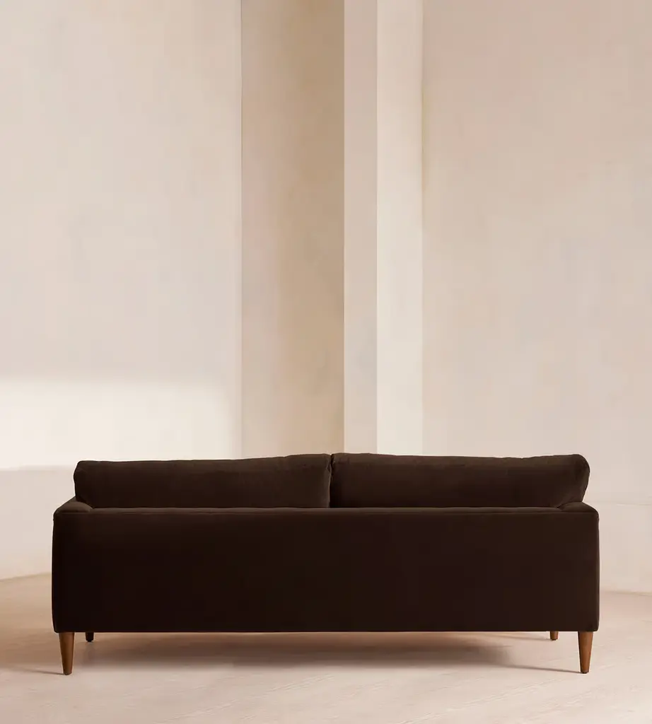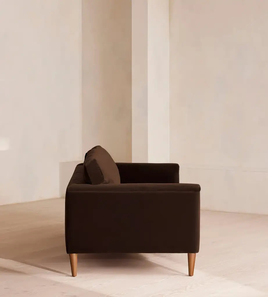 Deep seats, feather-wrapped cushions and rich velvet upholstery combine to create the perfect spot for relaxation. Built for three, the Reya sofa brings together deep seats and comfortable cushions upholstered in velvet in bespoke colorways to create a piece inspired by the interiors of DUMBO House. Turned walnut legs lift its silhouette off the floor to create the illusion of more space.