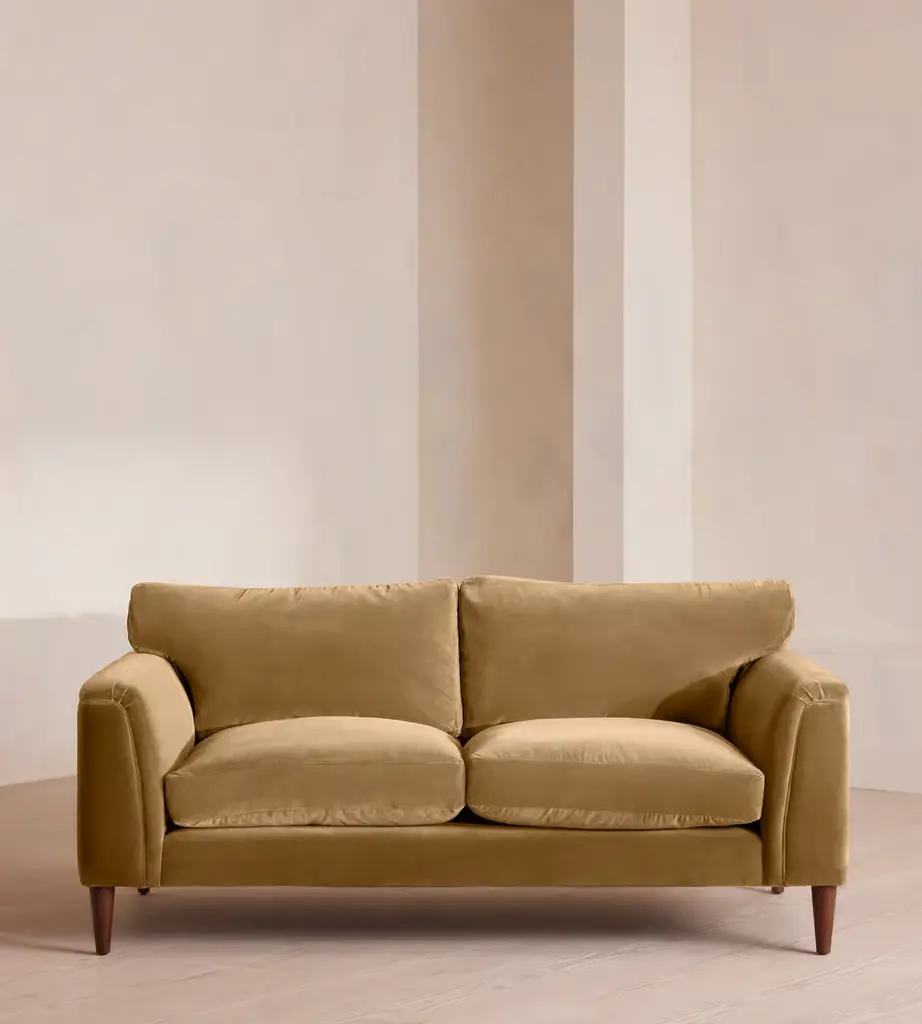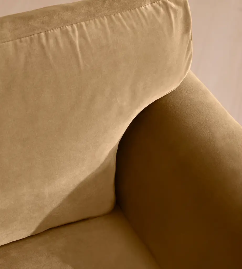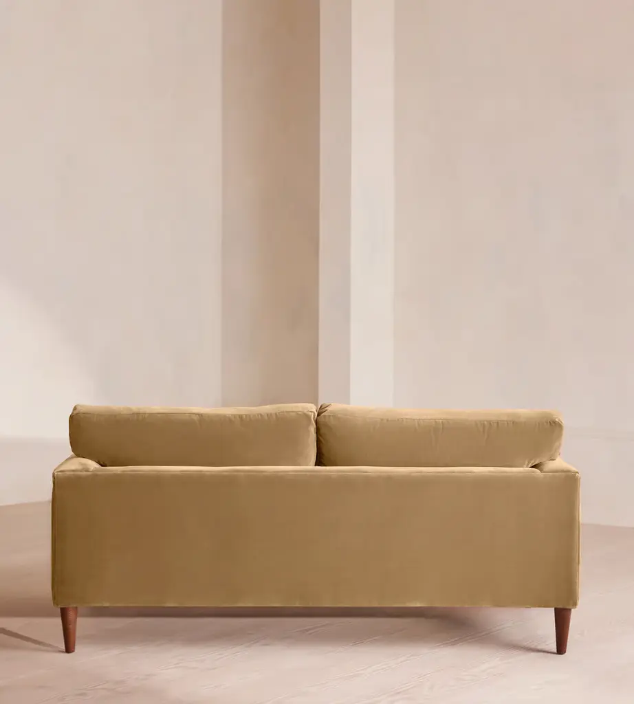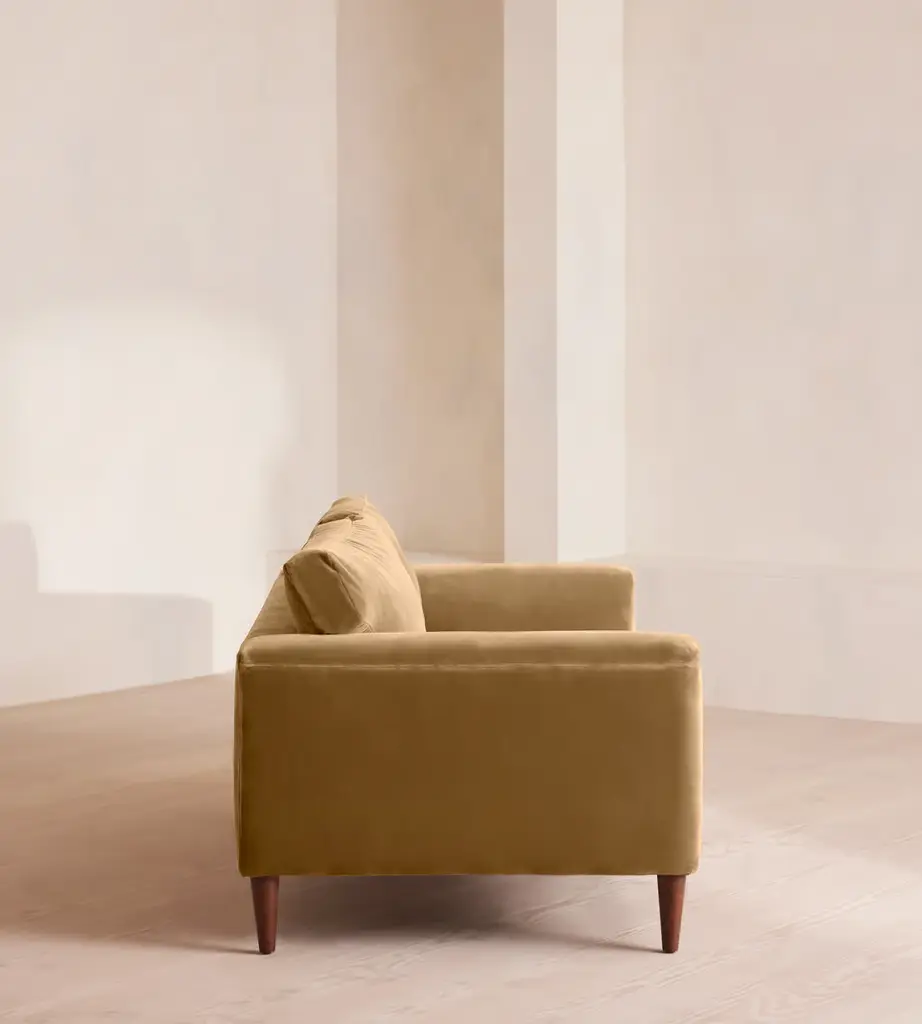 Our Reya sofa invites you to sink into its comfortable, cushioned curves for only relaxing moments in mind. The mid-century design takes inspiration from similar interiors seen throughout DUMBO House, with velvet upholstery and turned walnut legs that lift this sofa off the floor creating the illusion of more space. Pair with our Reya ottoman and loveseat for the full look.