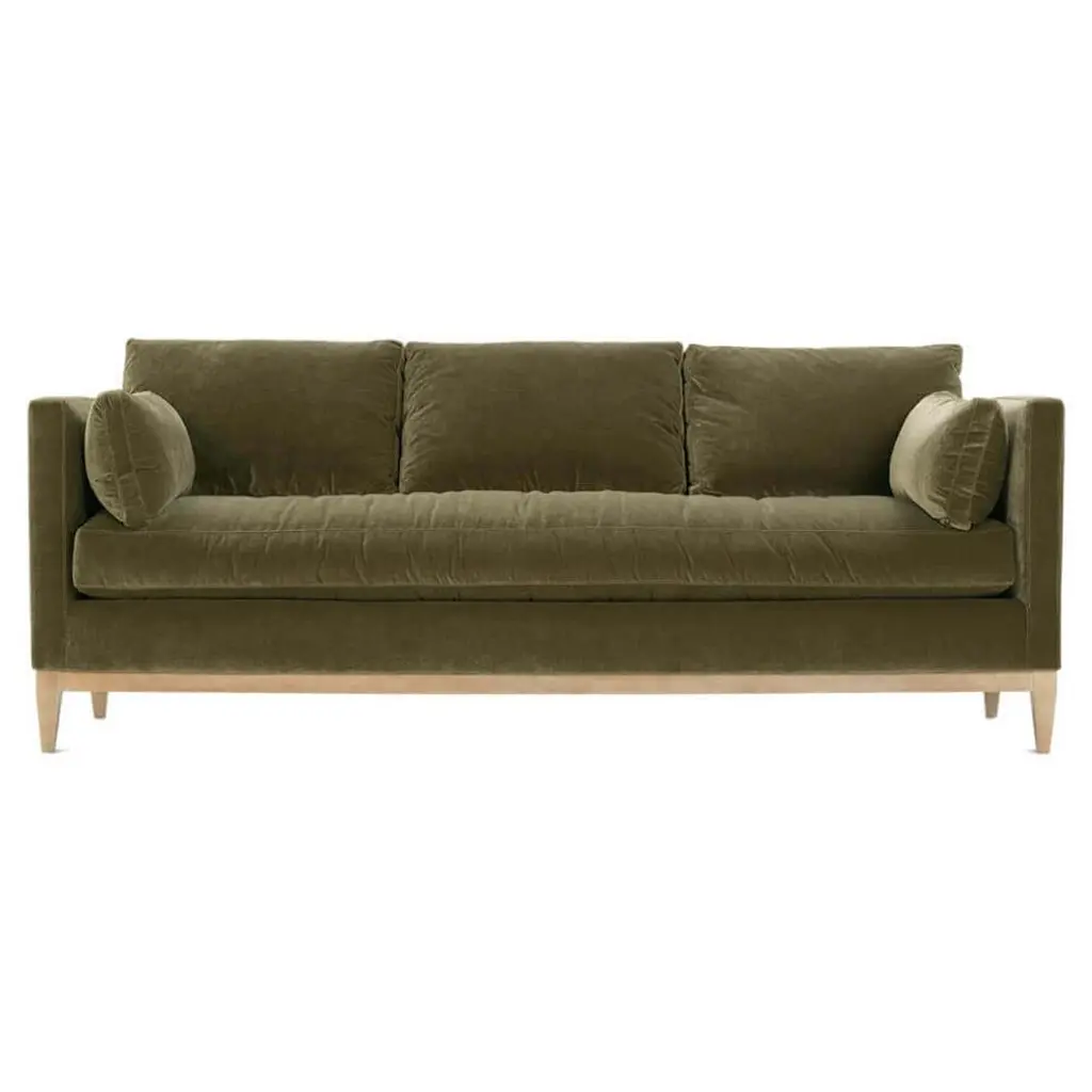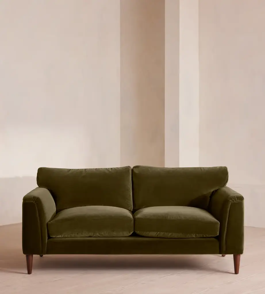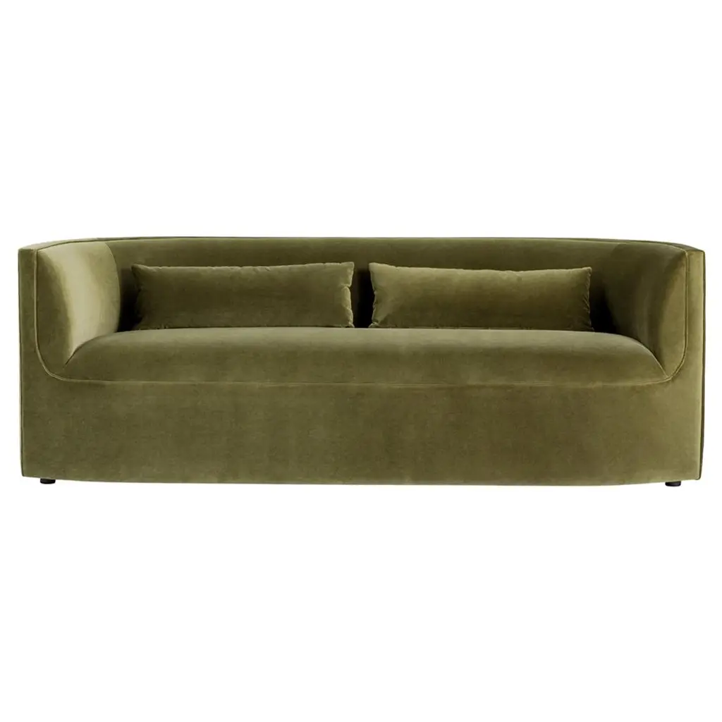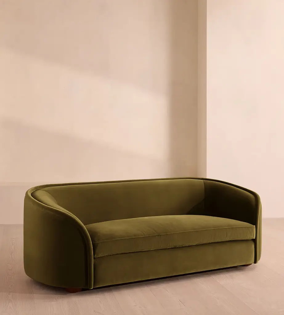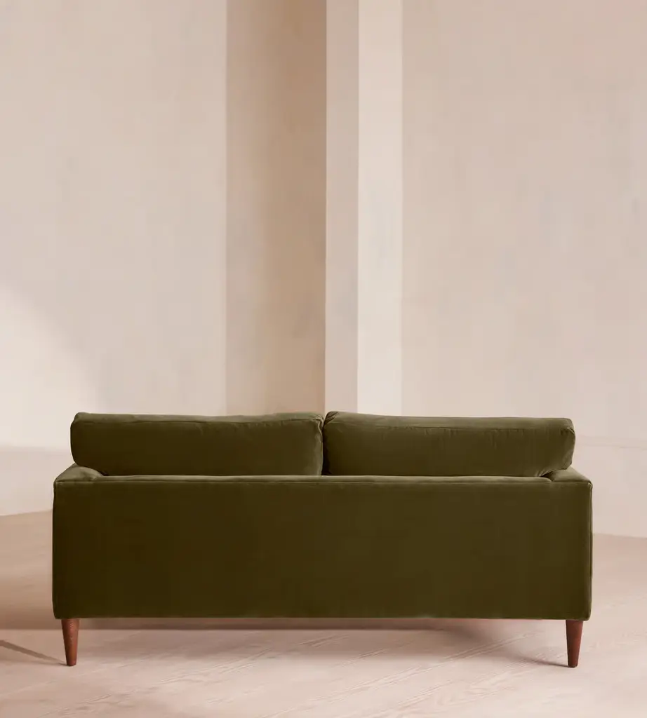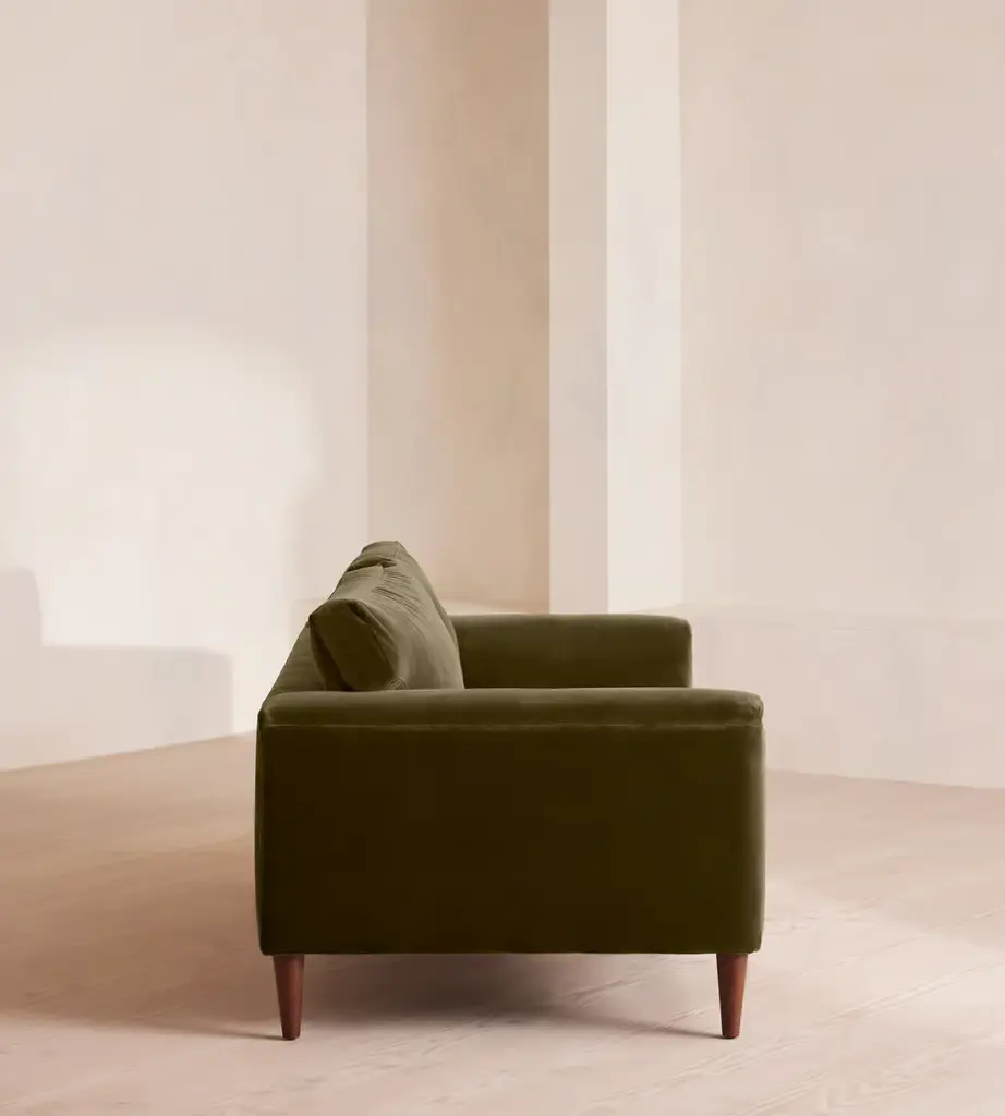 Our Reya sofa invites you to sink into its comfortable, cushioned curves for only relaxing moments in mind. The mid-century design takes inspiration from similar interiors seen throughout DUMBO House, with velvet upholstery and turned walnut legs that lift this sofa off the floor creating the illusion of more space. Pair with our Reya ottoman and loveseat for the full look.
