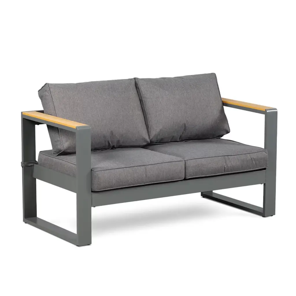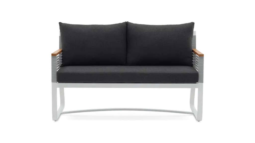 Ribbons black sofa by MOWEEDimensions: D83 x W160 x H81 cmMaterial: Aluminum, UpholsteryWeight: 32 kgAlso available in different colors and finishes. An unmistakable collection for its beauty and robustness. A tribute to the Valencian manufacturing tradition as a challenge to innovation, making it sustainable and durable. A collection with details that make it unique. We discover its most representative side, Ribbons. Engineering and tradition come together, thus achieving a collection with its own character.Möwee is part of the work, effort and commitment of Gaviota, a leading company in the outdoor sector. It was set up as an independent venture to broaden horizons in the outdoor furniture world, with its own distinctive character and way of doing things. Freshness, simplicity, quality and design are at the heart of its DNA.