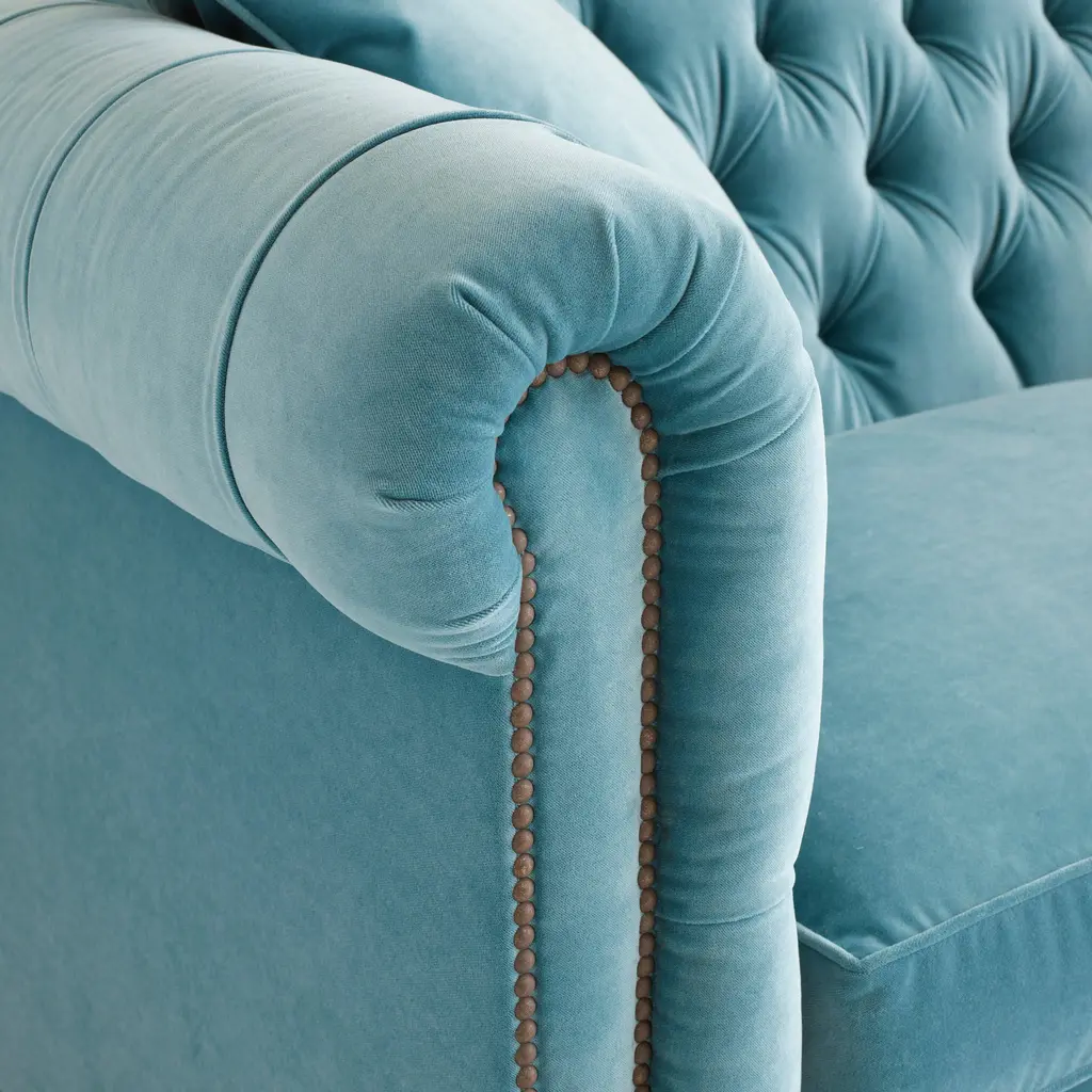 Inspired by the classic Chesterfield Sofa, our Richmond Sofa has all the time-honored details: straight back, button tufting, rolled arms, and graceful turned legs. We've added nailhead trim to punctuate the timeless silhouette. Haven cushions feature an eco-friendly soy-based foam core surrounded by down and feather fill for luxurious comfort. Custom upholstered in your choice of designer fabrics. Exclusively from Annie Selke.
