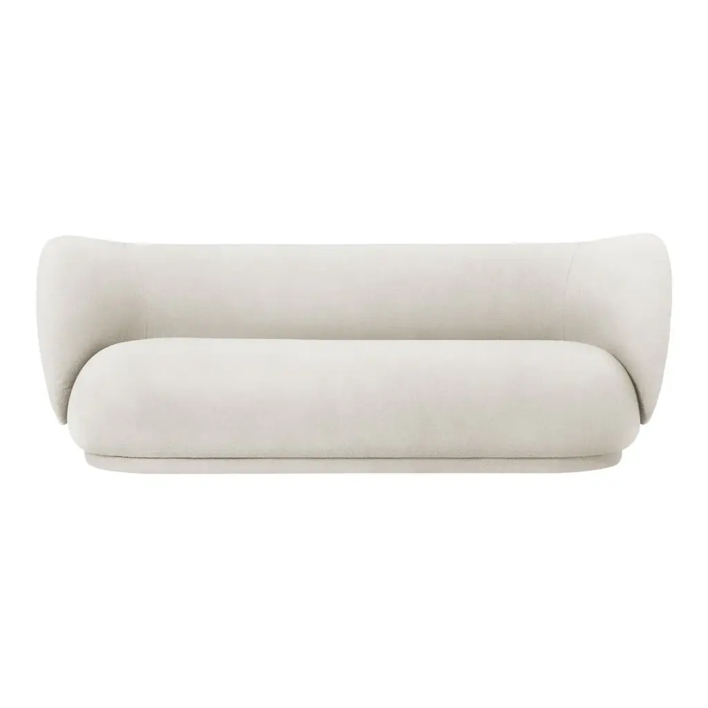 The Rico series welcomes curves and volumes into a classic design defined by soft lines and an embracing expression. Contrasting the sturdiness of the three-seater's frame, the sofa has an upholstery of timeless, yet easeful boucle fabric, which is woven of uneven yarn to attain the rich, loopy texture of the surface. The curvaceous nature of the series adds a modern union of comfort and elegance to any room and makes you feel drawn into its motherly embrace. The brushed item is part of our made to order customization concept. The materials have been handpicked in order to create this custom piece – the only one of its kind. Please note it cannot be exchanged or returned.