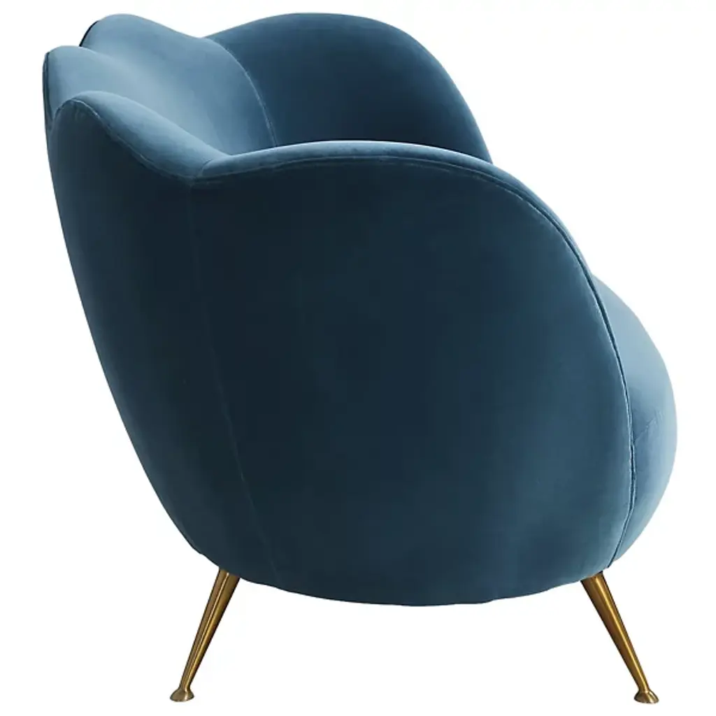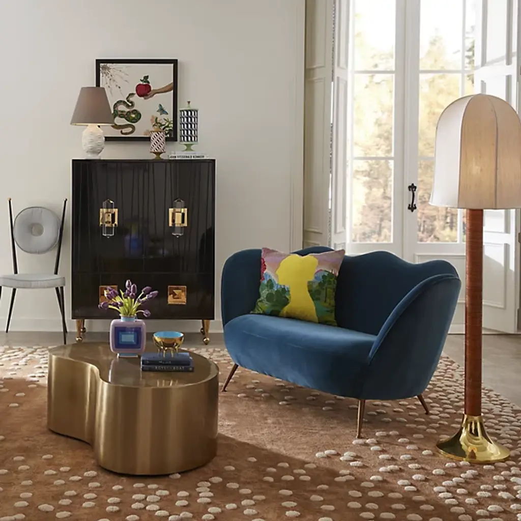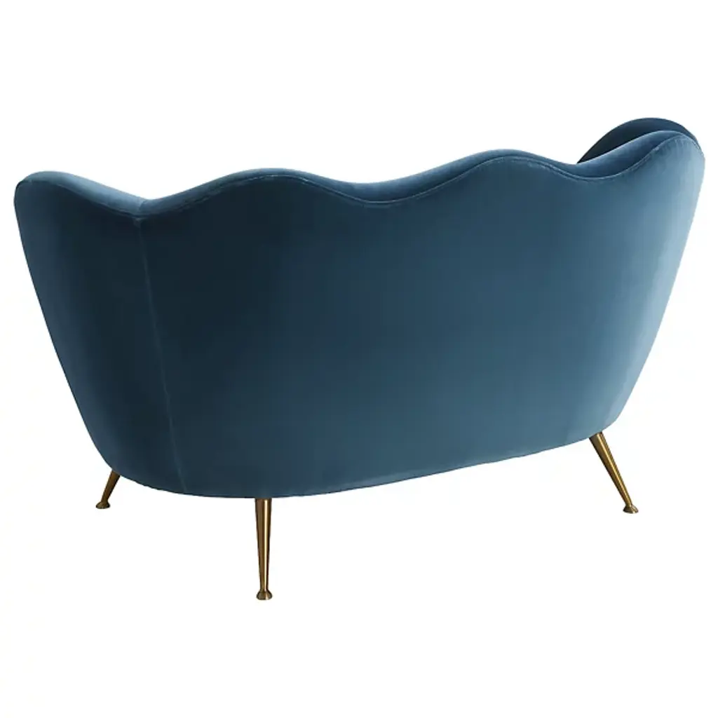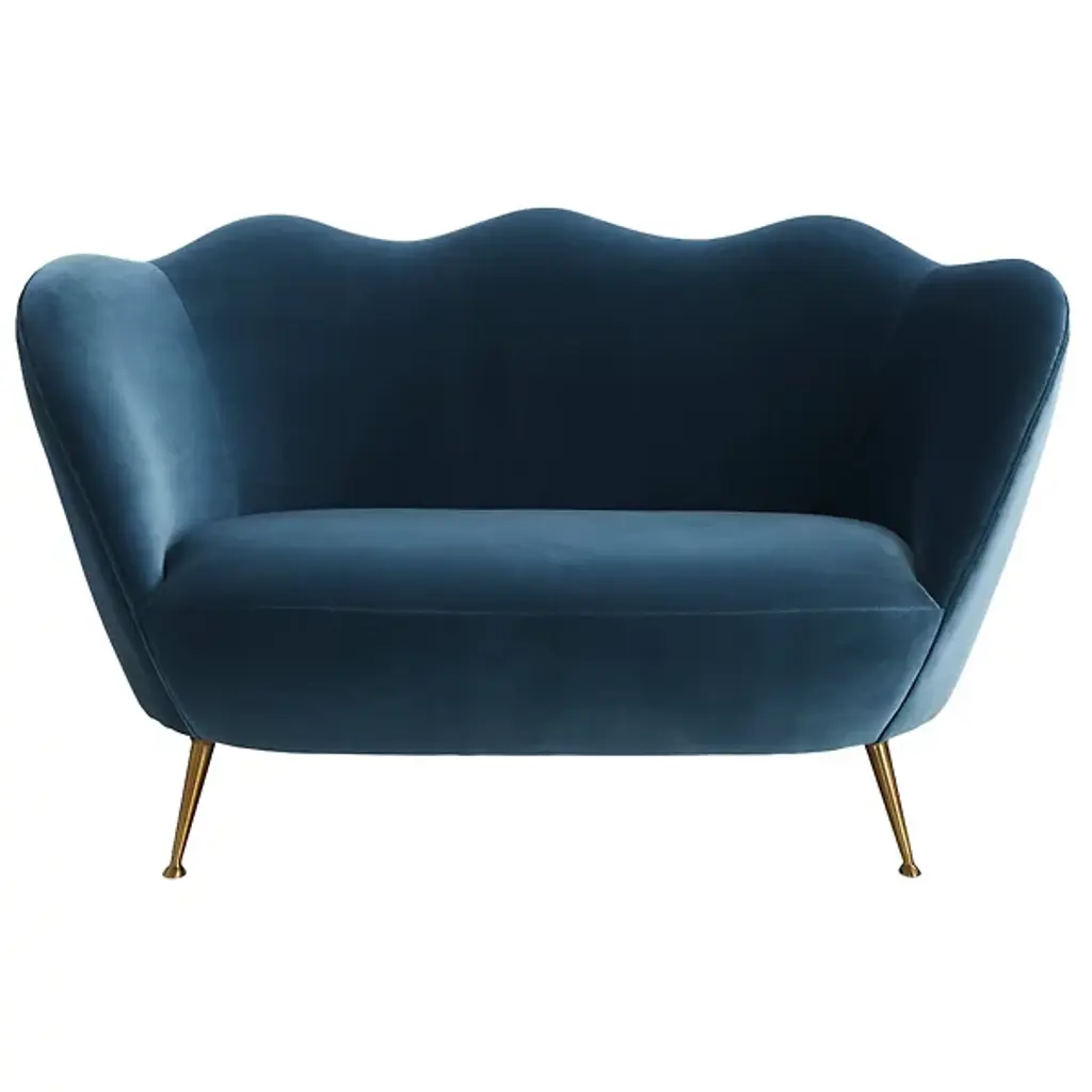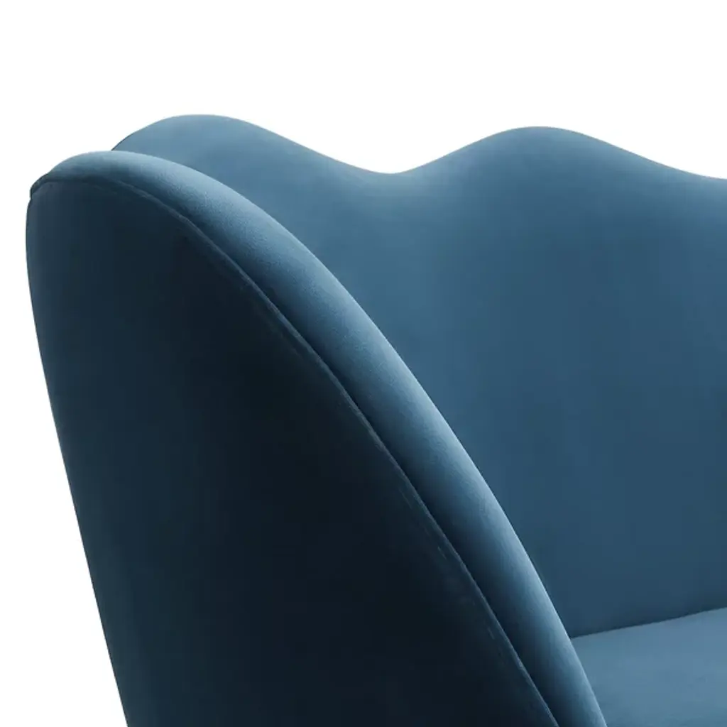 The Ripple Apartment Sofa from Jonathan Adler is designed to fit seamlessly into any room. Its enveloping back curve comforts you, while the wave-topped back doubles as an intuitive armrest, perfect for conversations. Whether placed in a pied-à-terre or at the foot of your bed, this sofa brings a touch of modern elegance. Upholstered in supersoft, jewel-toned velvet that acts as a moody neutral, it offers a simple yet luxurious vibe. The Ripple edge adds a wave of minimal modernism and sensual curves, making this piece stylish and inviting.