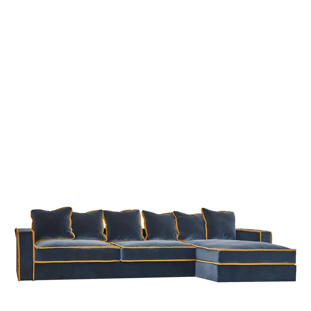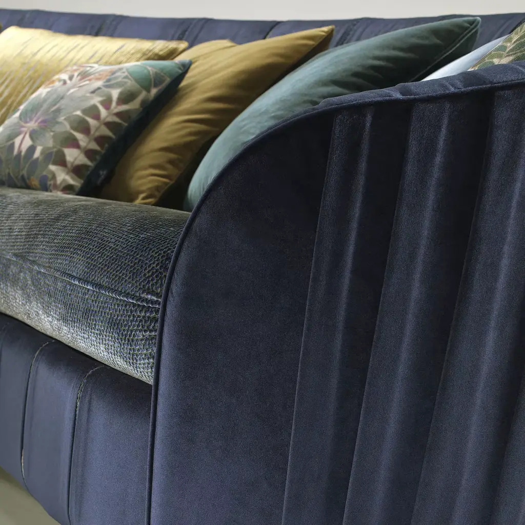 An invitation to conviviality expressed through a luxurious sartorial language, this sofa is sure not to go unnoticed in refined modern living rooms thanks to its generous dimensions and enveloping design. The solid wooden core, coupled with a rich polyurethane padding, outlines clean-lined volumes enhanced by the vertical pleats that adorn its superb blue velvet upholstery.