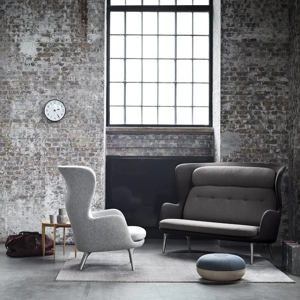 The Ro Sofa comes fully upholstered in in a wide range of fabrics. Single fabric or a mix of 2 fabrics; one fabric for the shell and one for the cushions.. The base consists of 4 legs in brushed aluminum and is also available with a wooden base in solid oak with a clear lacquer finish.