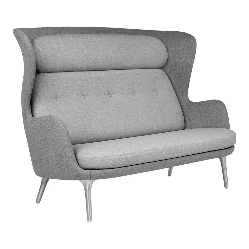 The Ro Sofa comes fully upholstered in in a wide range of fabrics. Single fabric or a mix of 2 fabrics; one fabric for the shell and one for the cushions.. The base consists of 4 legs in brushed aluminum and is also available with a wooden base in solid oak with a clear lacquer finish.