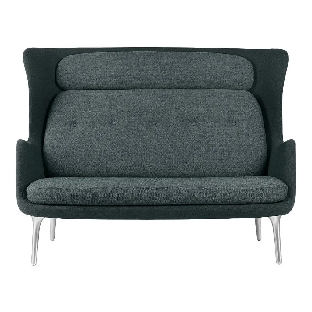 The Ro Sofa comes fully upholstered in in a wide range of fabrics. Single fabric or a mix of 2 fabrics; one fabric for the shell and one for the cushions.. The base consists of 4 legs in brushed aluminum and is also available with a wooden base in solid oak with a clear lacquer finish.