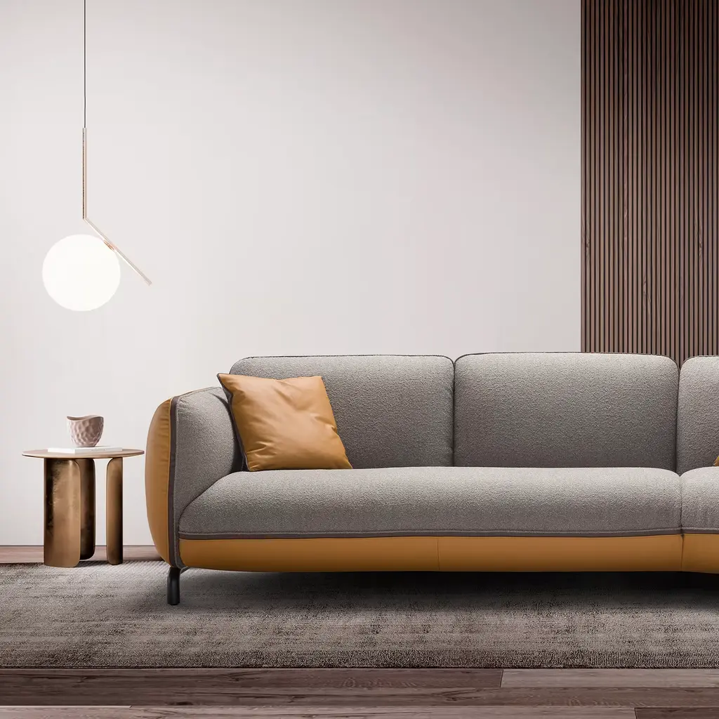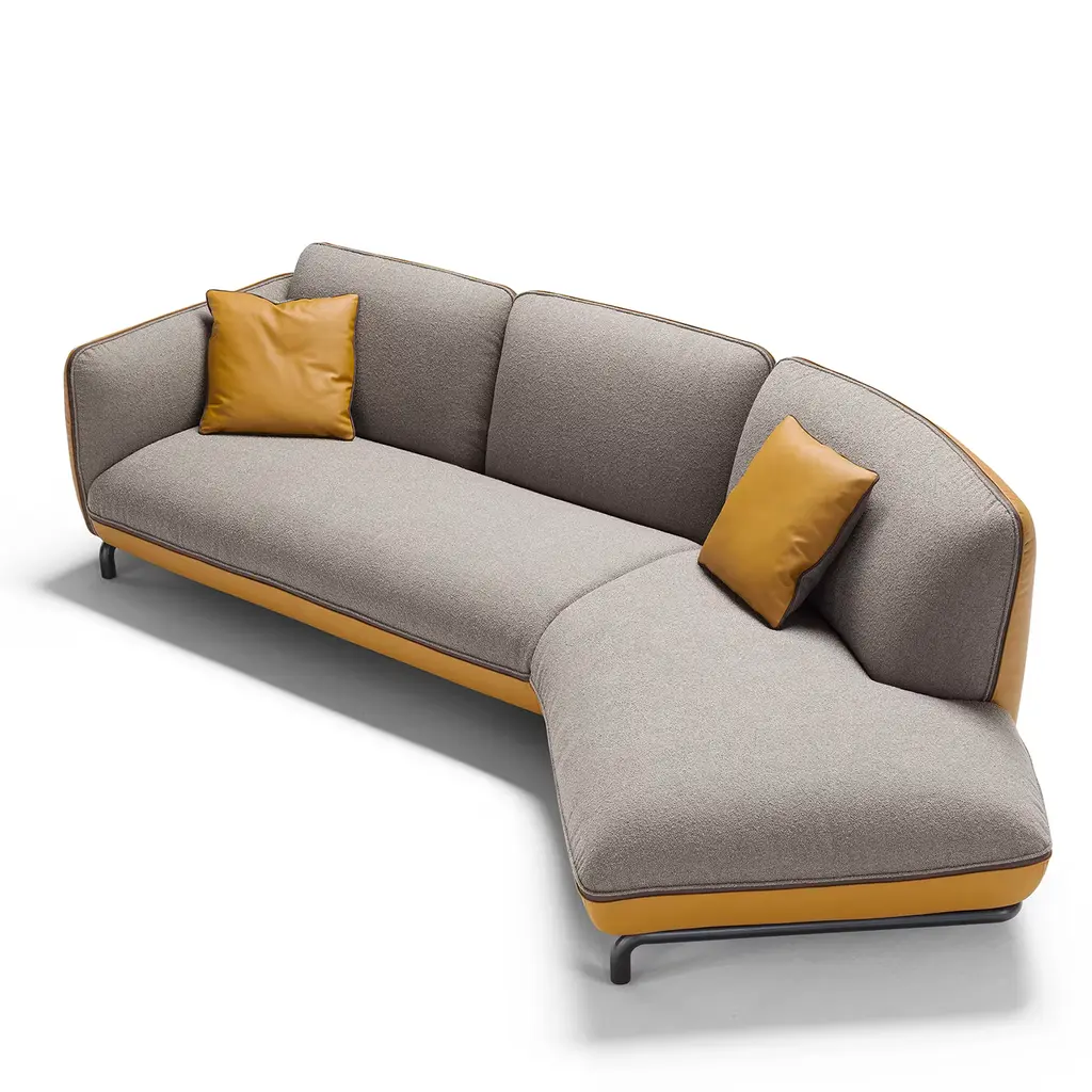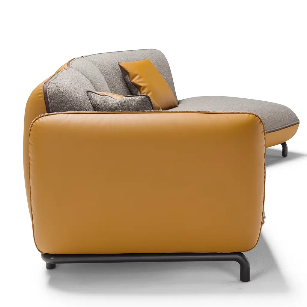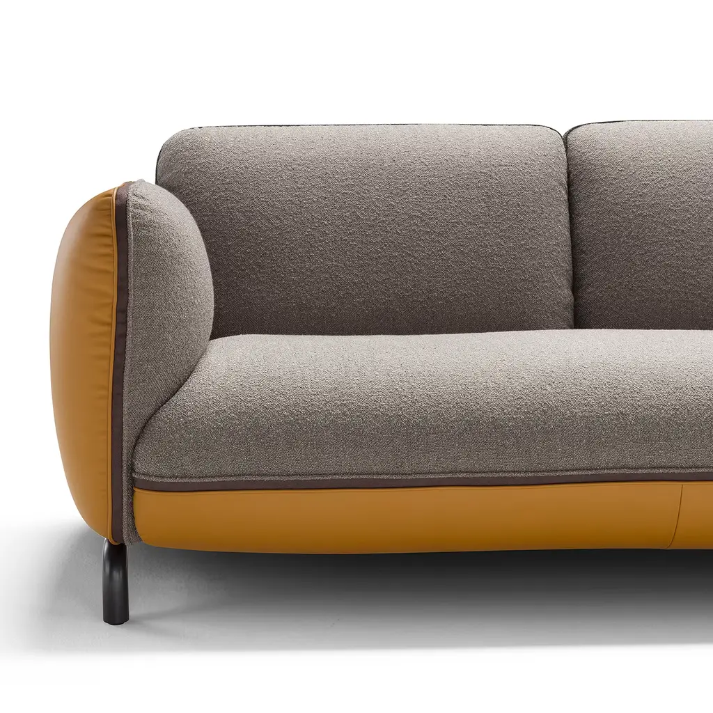 This angular sofa showcases sartorial flair with a fresh approach to the use of colors and materials. Raised on a cylindrical metal base, the 43cm-high seat has generous padding enveloped in a mix of gray fabric and yellow leather areas, a neat chromatic and tactile conflict finished with a refined raised stitching on the sides. Please explore available variants by consulting the Concierge. Decorative cushions included.
