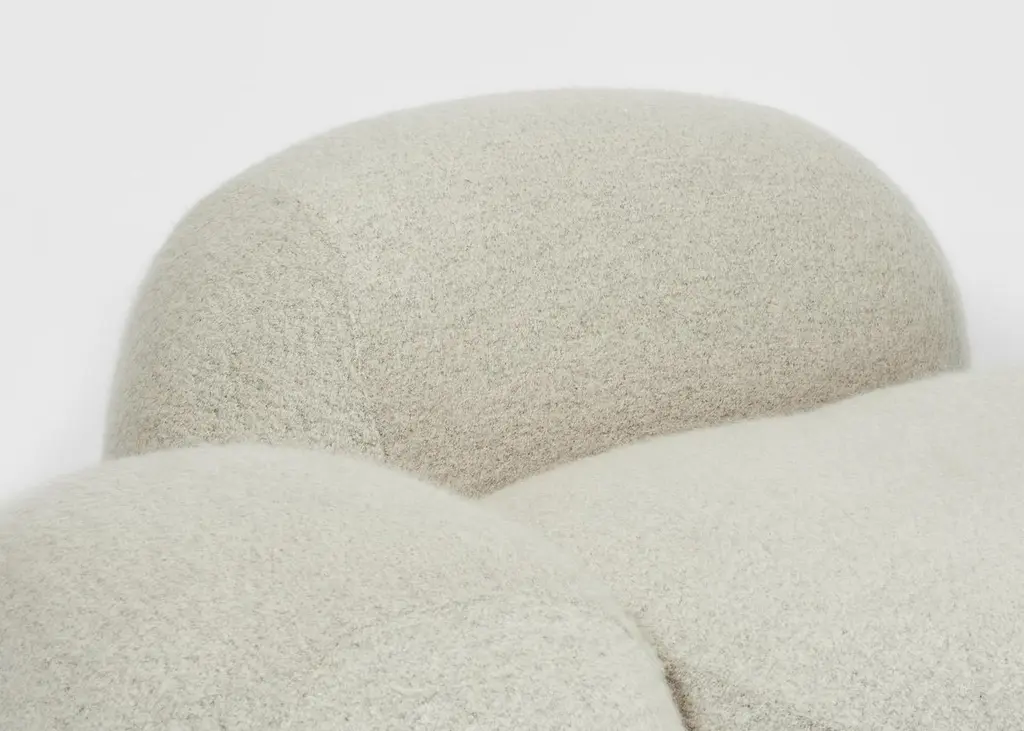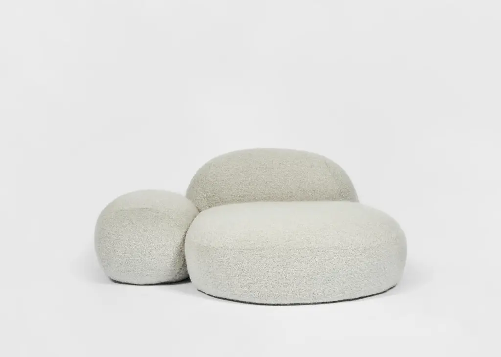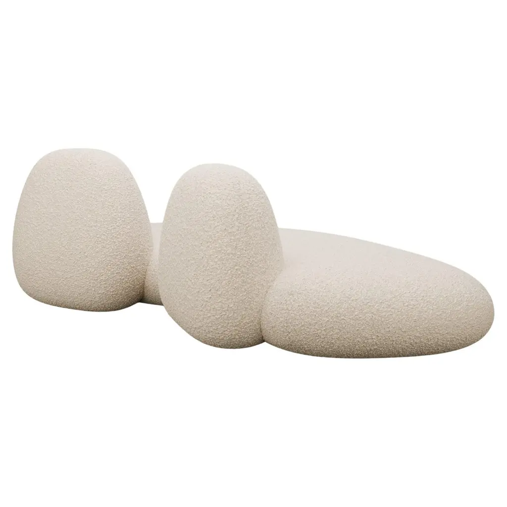 The Rock Sofa by FRED RIGBY as part of the 5/5/5 Collection. An assemblage of 5 objects by 5 designers, celebrating 5 years of St. Vincents.With complete freedom and over a year in the making, the result is an original and inspiring assemblage of objects that eschew trends and reflect the unique narratives of their makers.The Rock Sofa, exclusively made for St. Vincents, is inspired by the stone clusters and rock formations seen on beaches. Asymmetric and informal, like rocks jutting out the earth, it invites the sitter to relax without imposing a fixed seating position. The tactile Pierre Frey fabric gives it a light and soft quality matching its intended use as a lounge chair.Handmade in London, the Rock Sofa is available in COM.