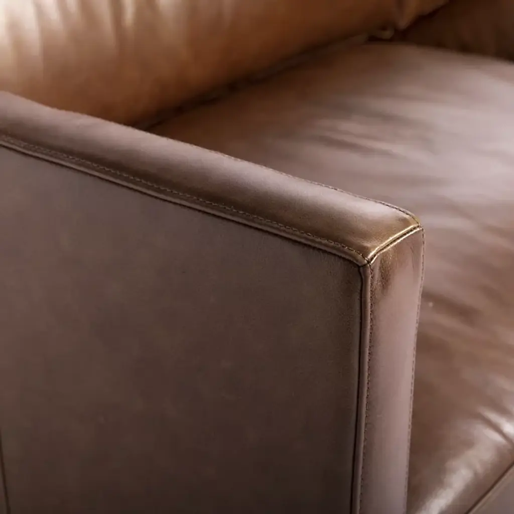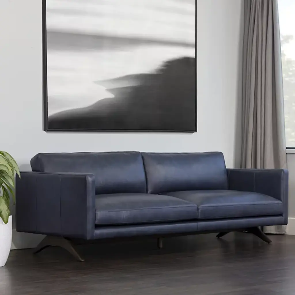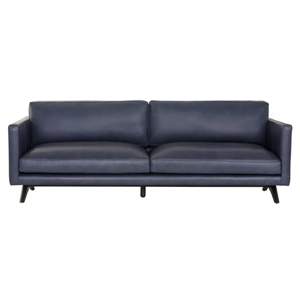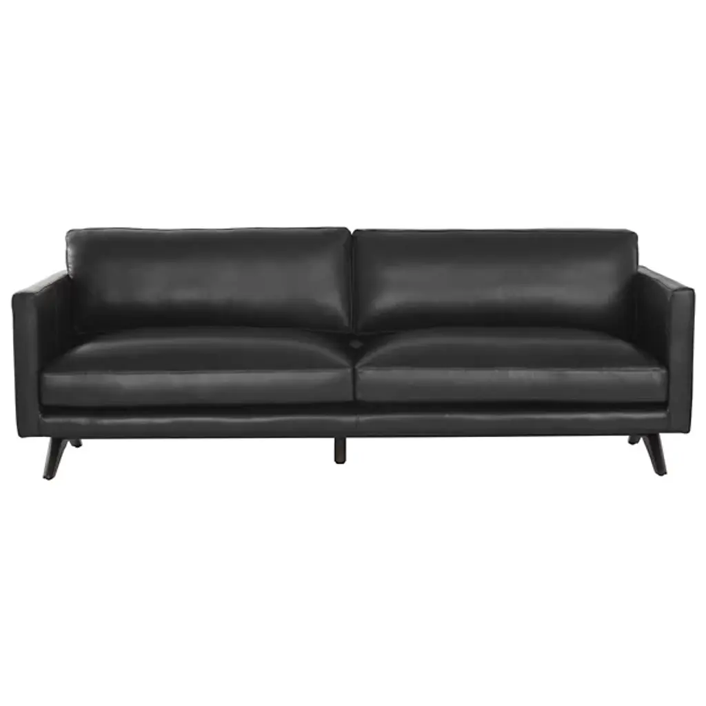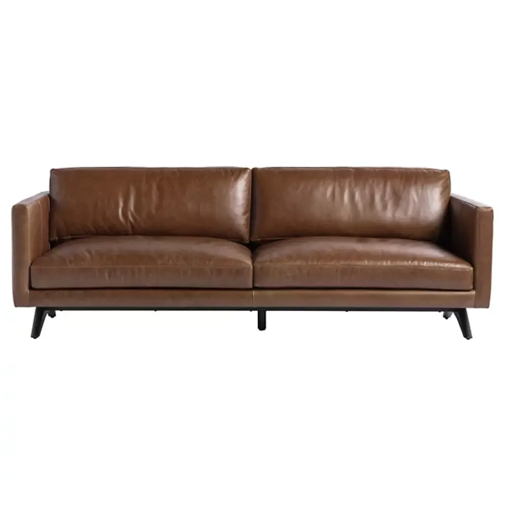 The Rogers Sofa from Sunpan embodies refined power through its commanding presence and mid-century aesthetic. The wide, welcoming frame showcases premium top-grain leather upholstery that tells its own story through naturally occurring markings and subtle variations. Beneath its sophisticated exterior lies a masterfully engineered foundation of high-resiliency foam and responsive springs, while angled solid oak legs provide elevated balance. This distinguished sofa transforms any setting into a statement of timeless elegance.