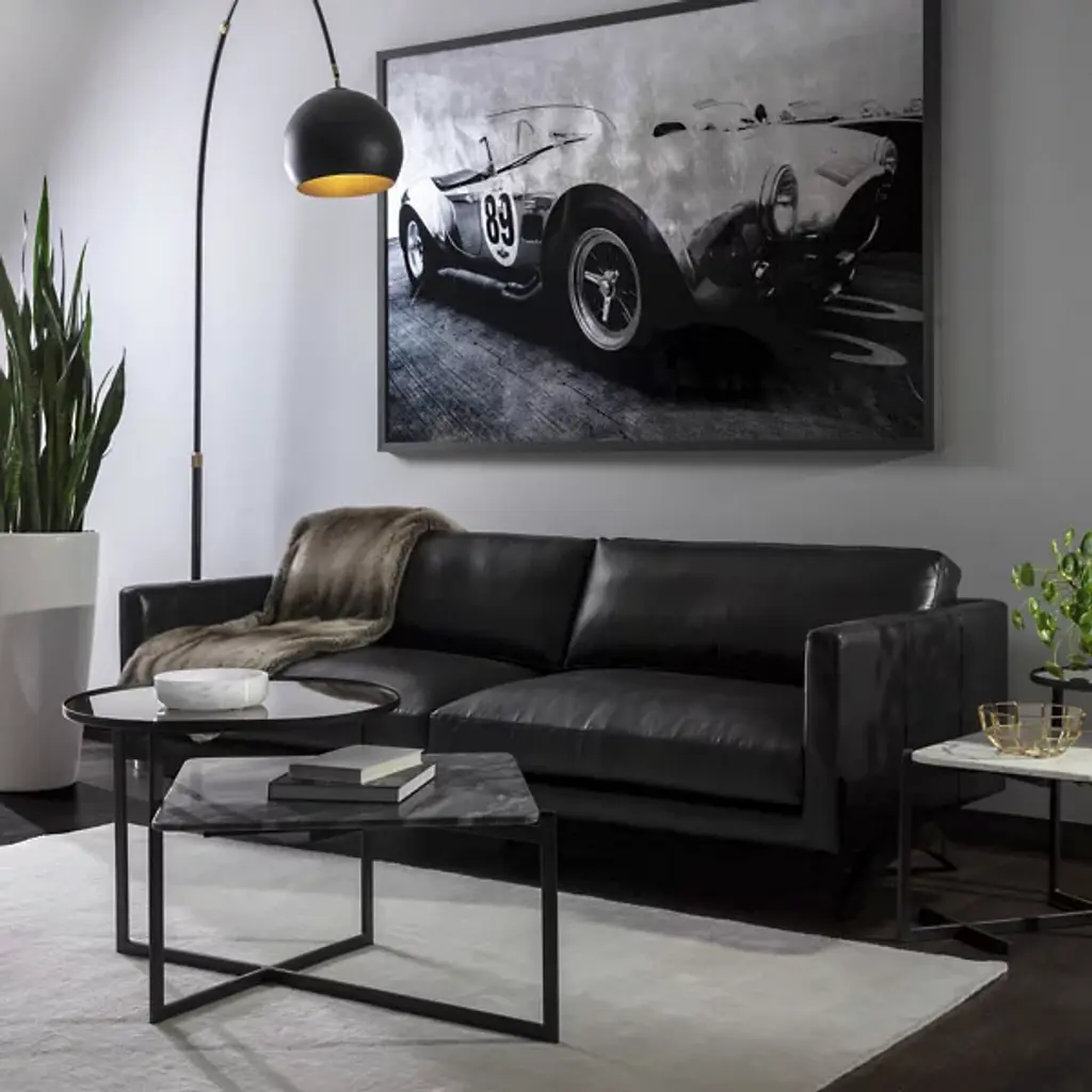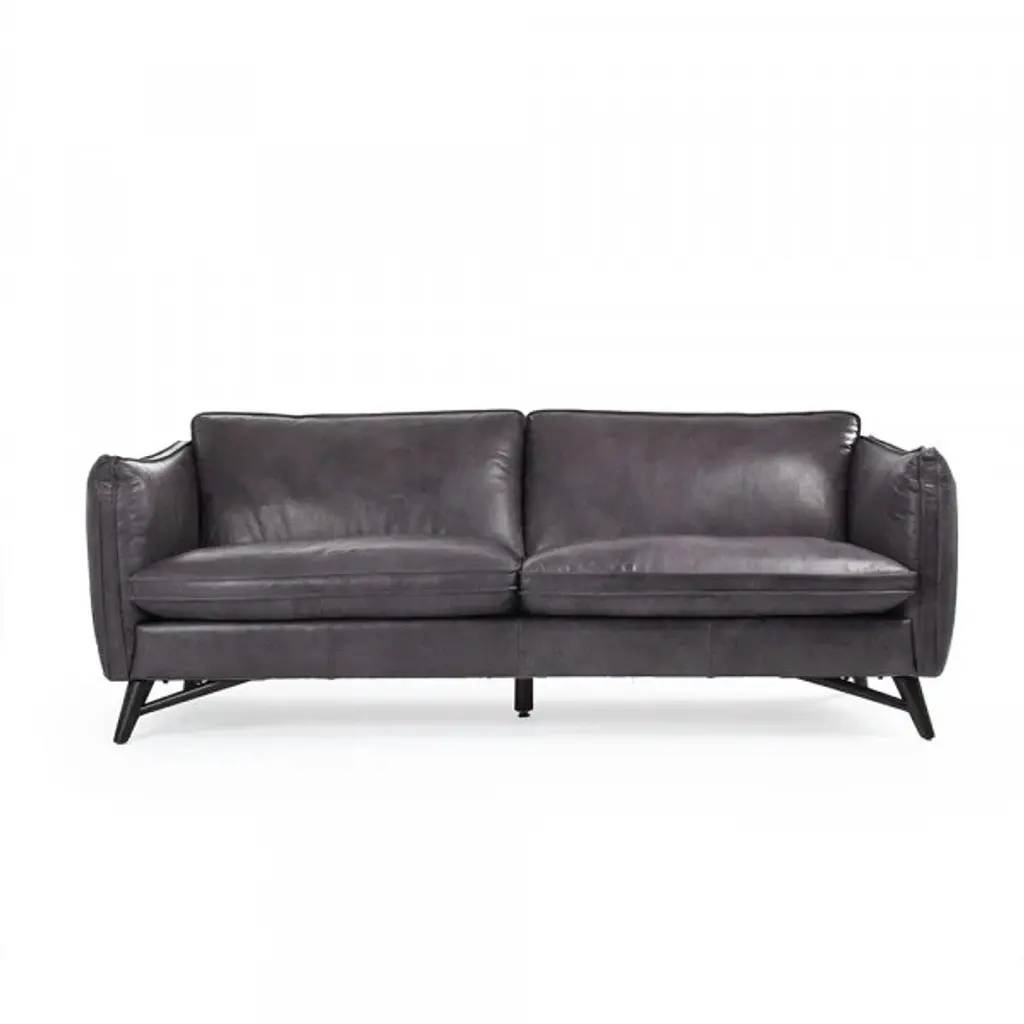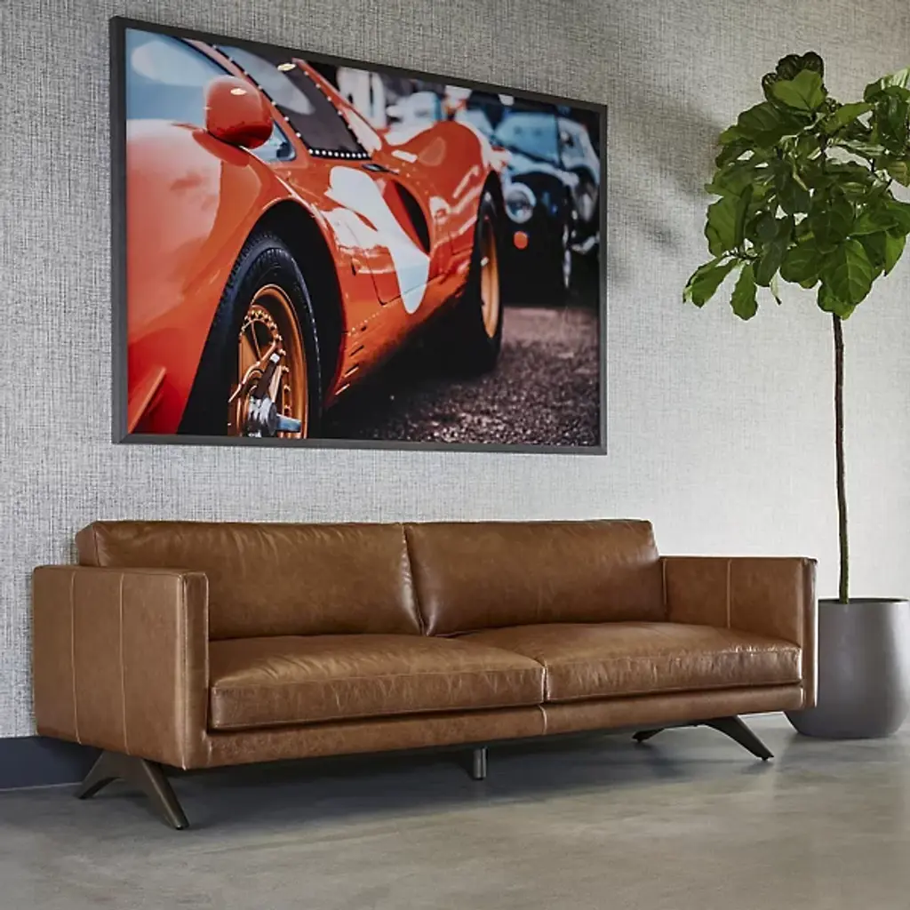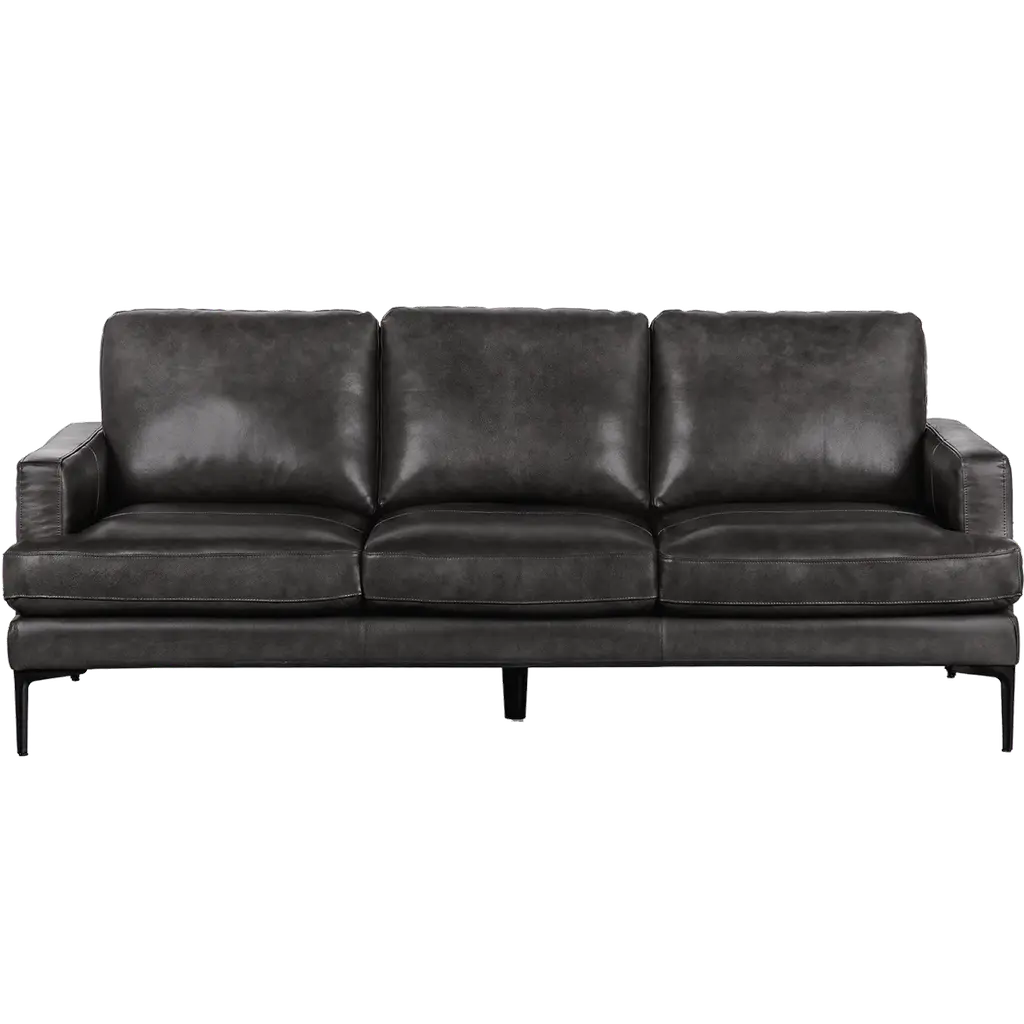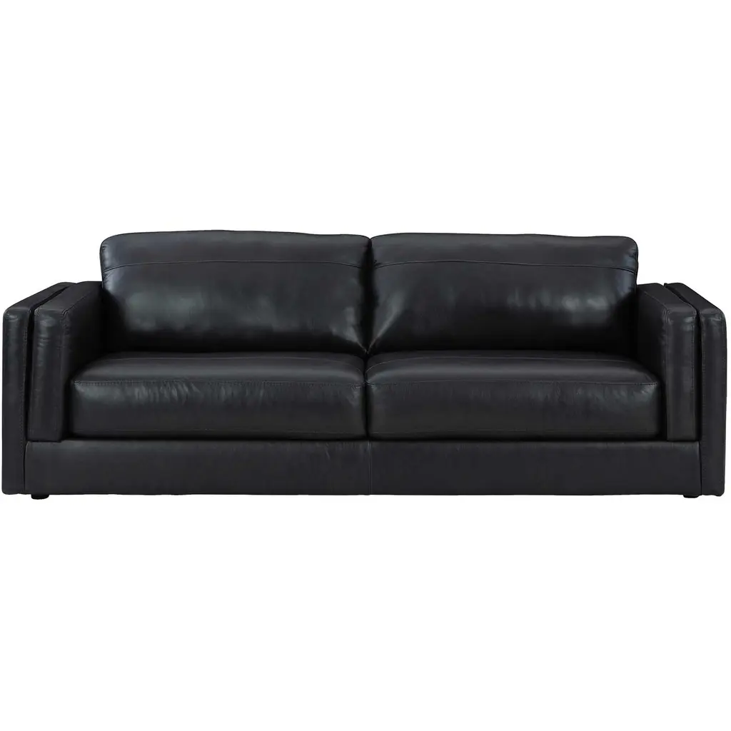 The Rogers Sofa from Sunpan embodies refined power through its commanding presence and mid-century aesthetic. The wide, welcoming frame showcases premium top-grain leather upholstery that tells its own story through naturally occurring markings and subtle variations. Beneath its sophisticated exterior lies a masterfully engineered foundation of high-resiliency foam and responsive springs, while angled solid oak legs provide elevated balance. This distinguished sofa transforms any setting into a statement of timeless elegance.
