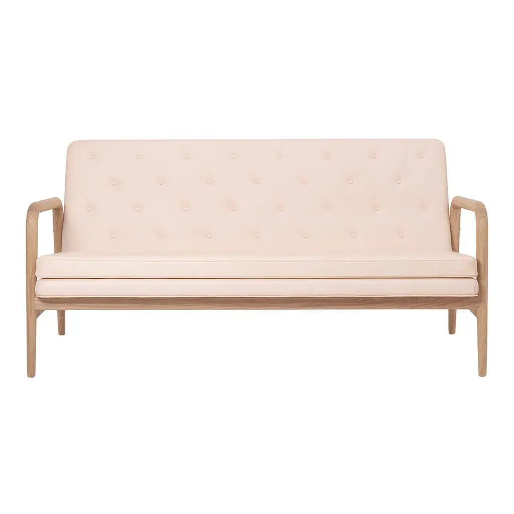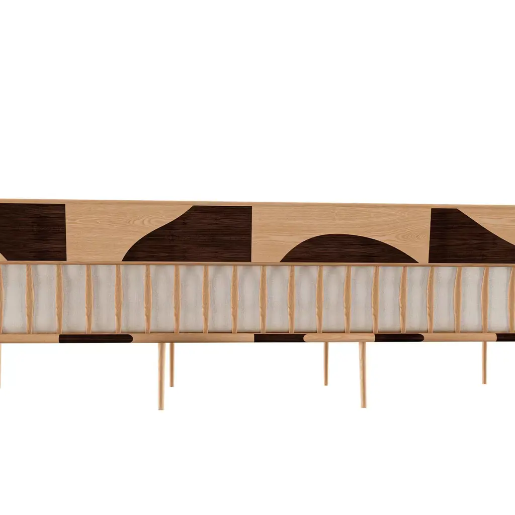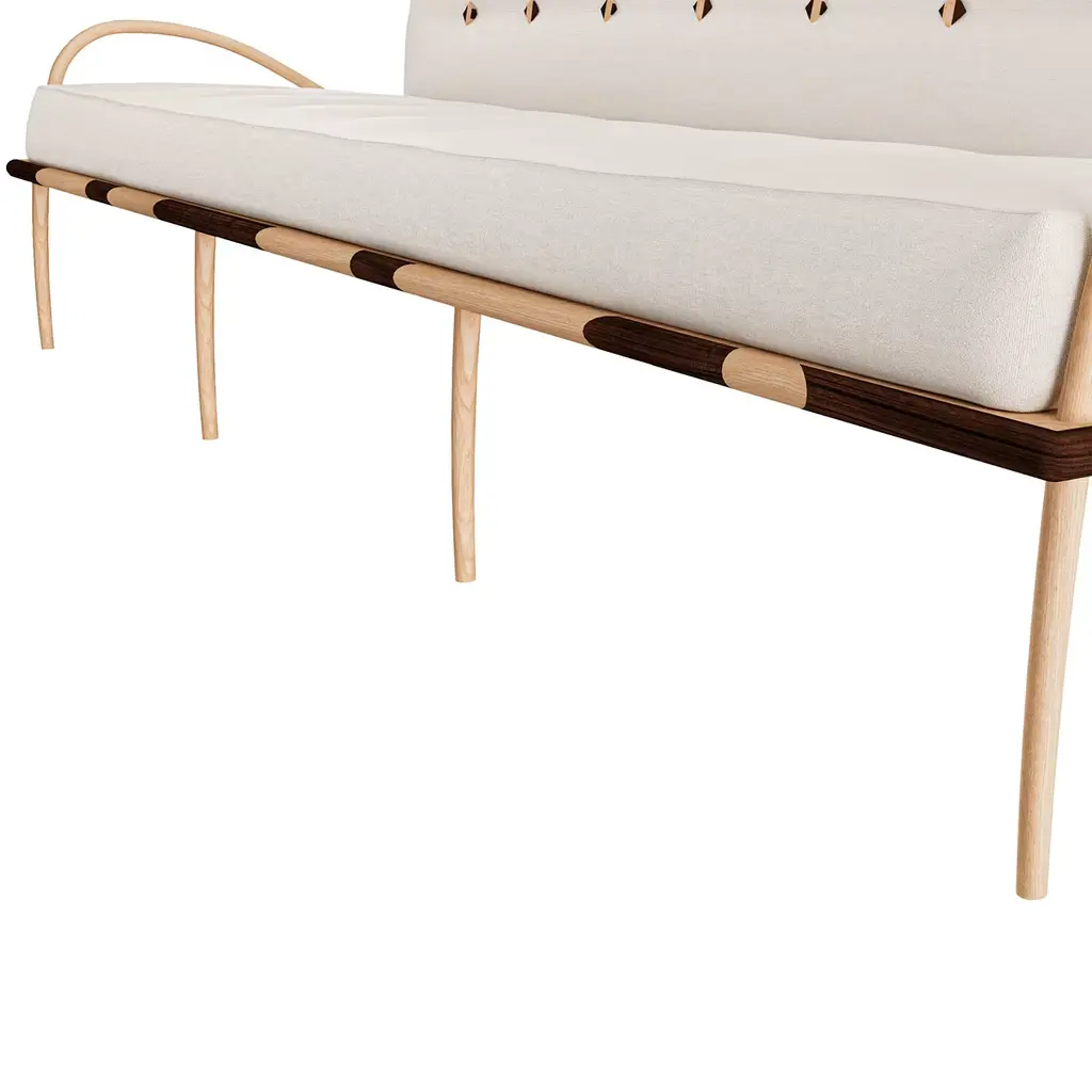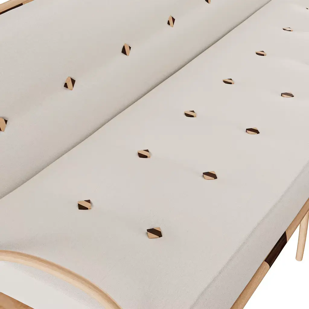 Feminine and graceful yet distilling daring charm, this sofa is an exclusive design conceived having in mind ancient Moroccan seats and exquisitely contemporary style. The distinguishing trait is the precious inlays of ash and Canaletto walnut characterizing both the structure and the buttons. The curved arms are fashioned by thermoforming and manual shaping of solid ash. Please contact the Concierge for customizations.