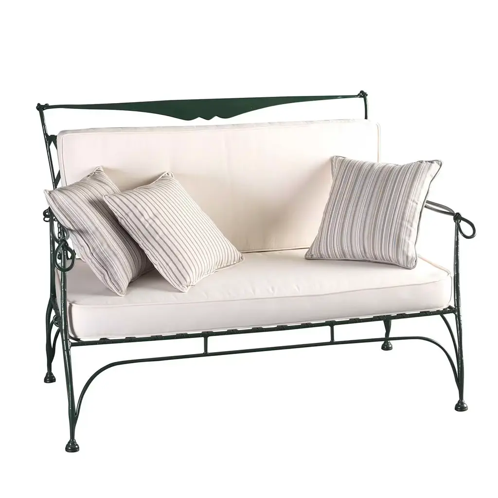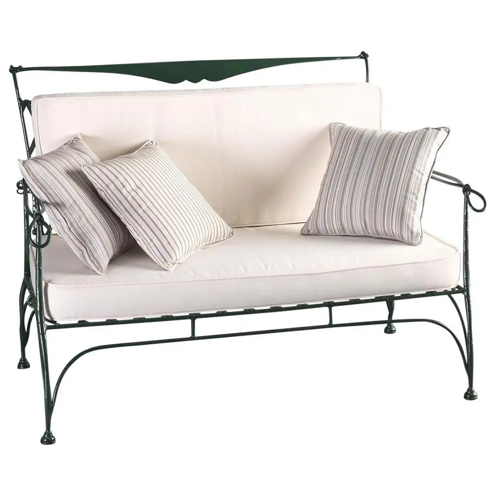 Marrying style and comfort, wrought iron furniture combines a vintage look with modern taste. This elegant, romantic loveseat features a zinc-plated powder-coated stainless steel structure and a soft, upholstered, rectangular outdoor cushion. The soothing light green color and the smooth, sensuous lines provide unparalleled lightness and a timeless flair.