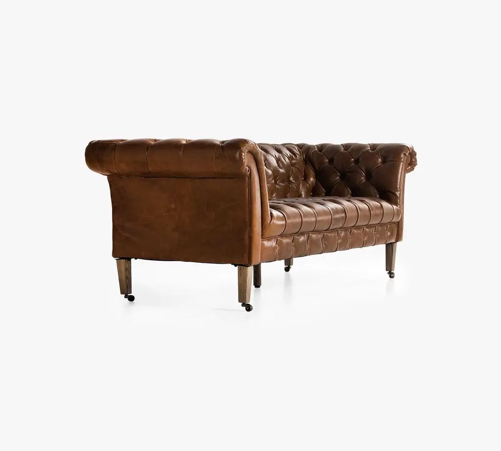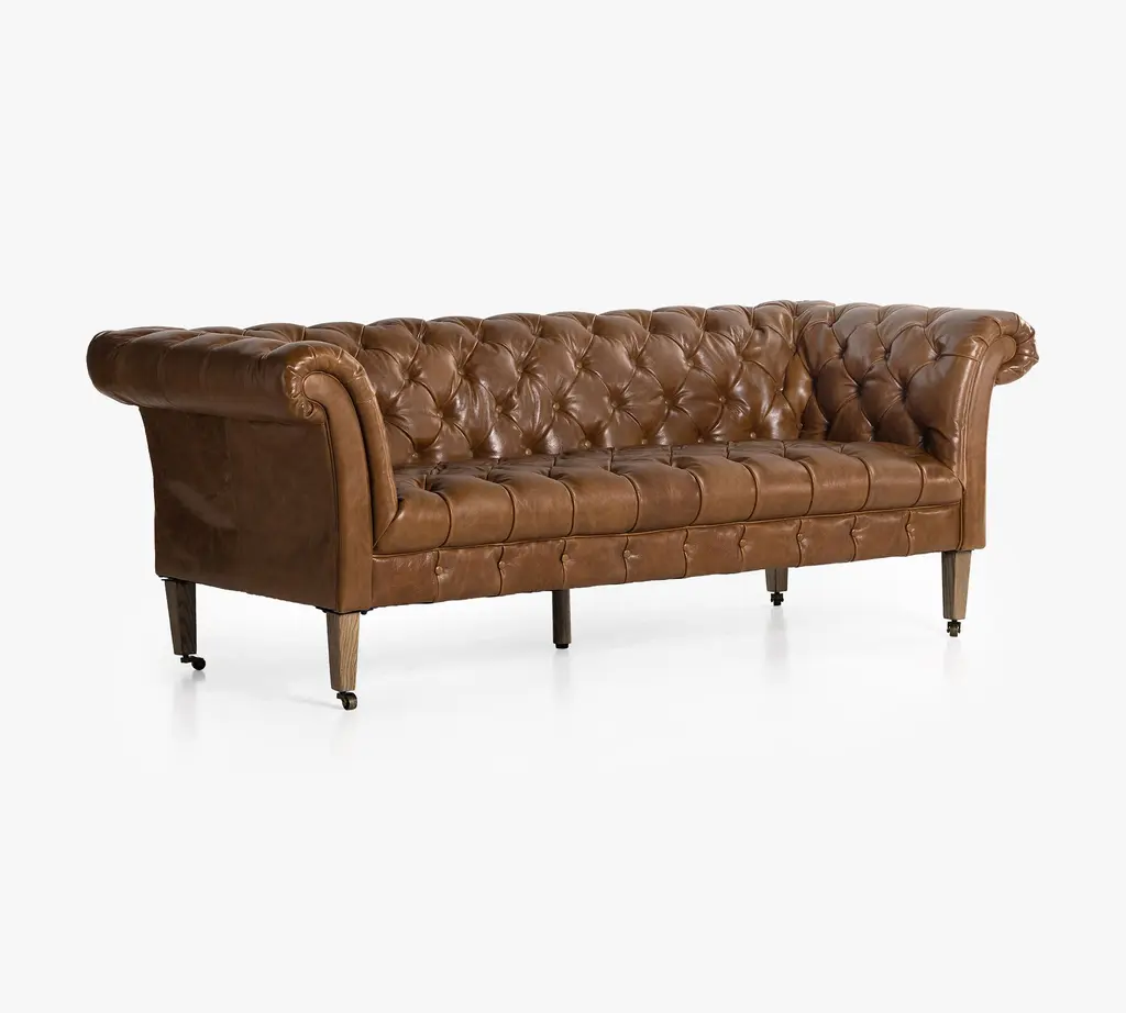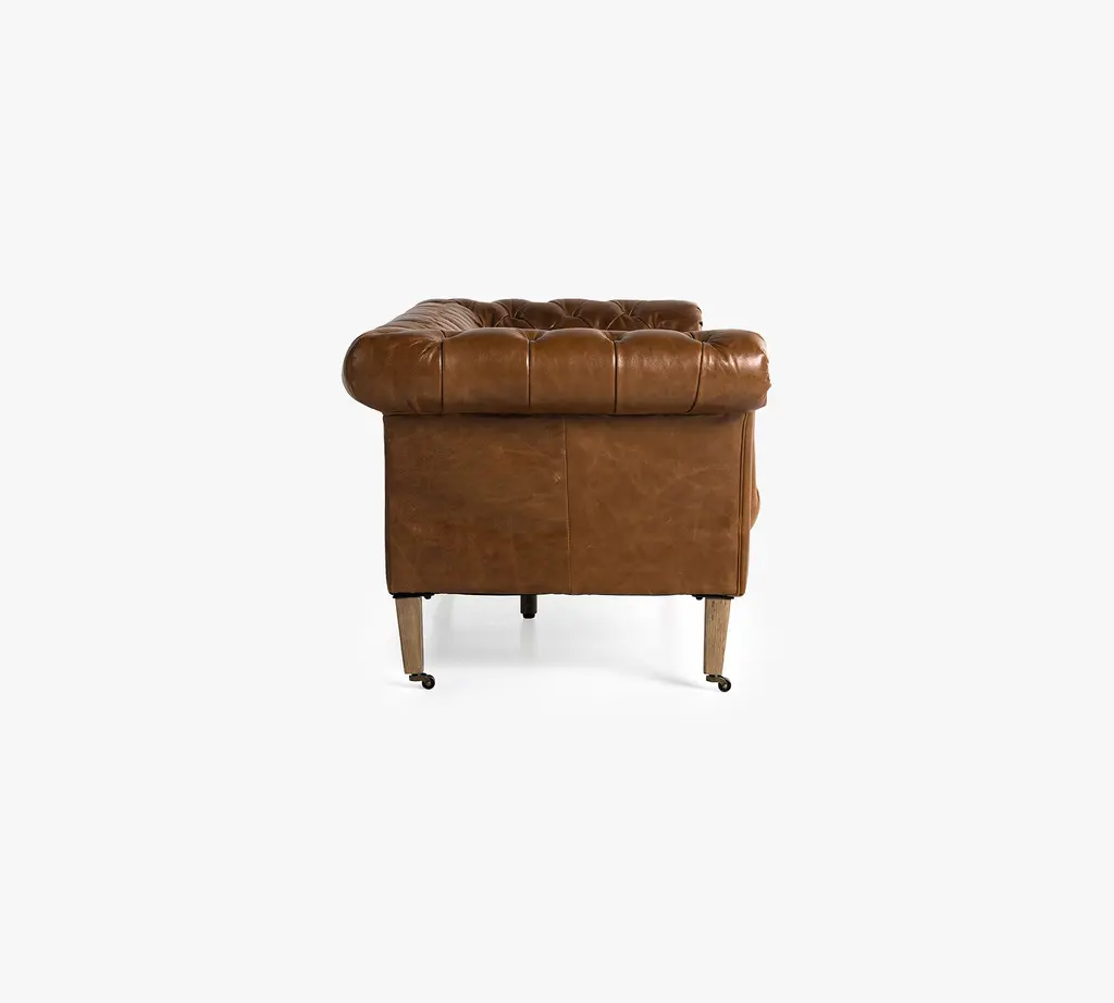 A nod to the classic Chesterfield sofa, this regal piece displays all the fine points of the Edwardian original that inspired it. Top grain leather in a warm finish is upholstered into sheltering arms, and dramatically tufted. Solid ash legs feature casters for modern ease.