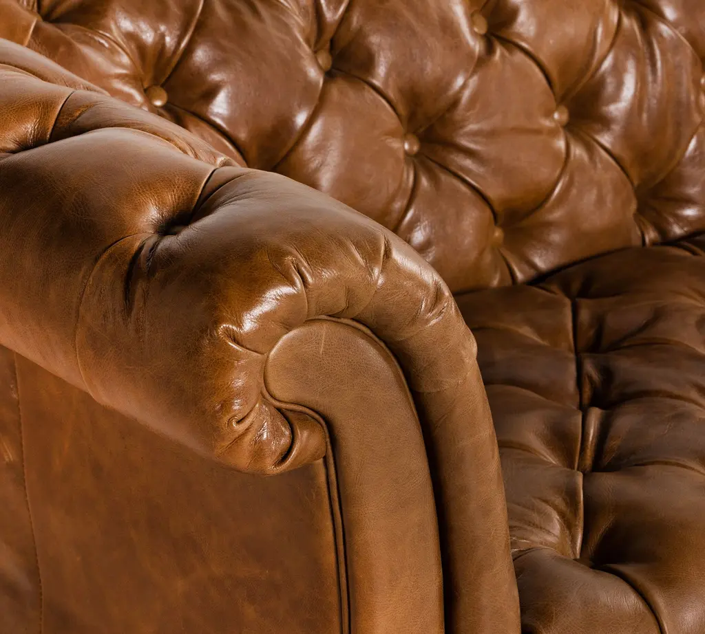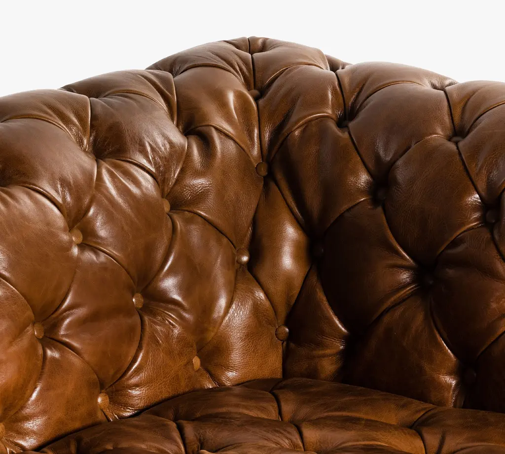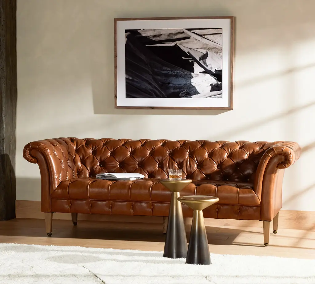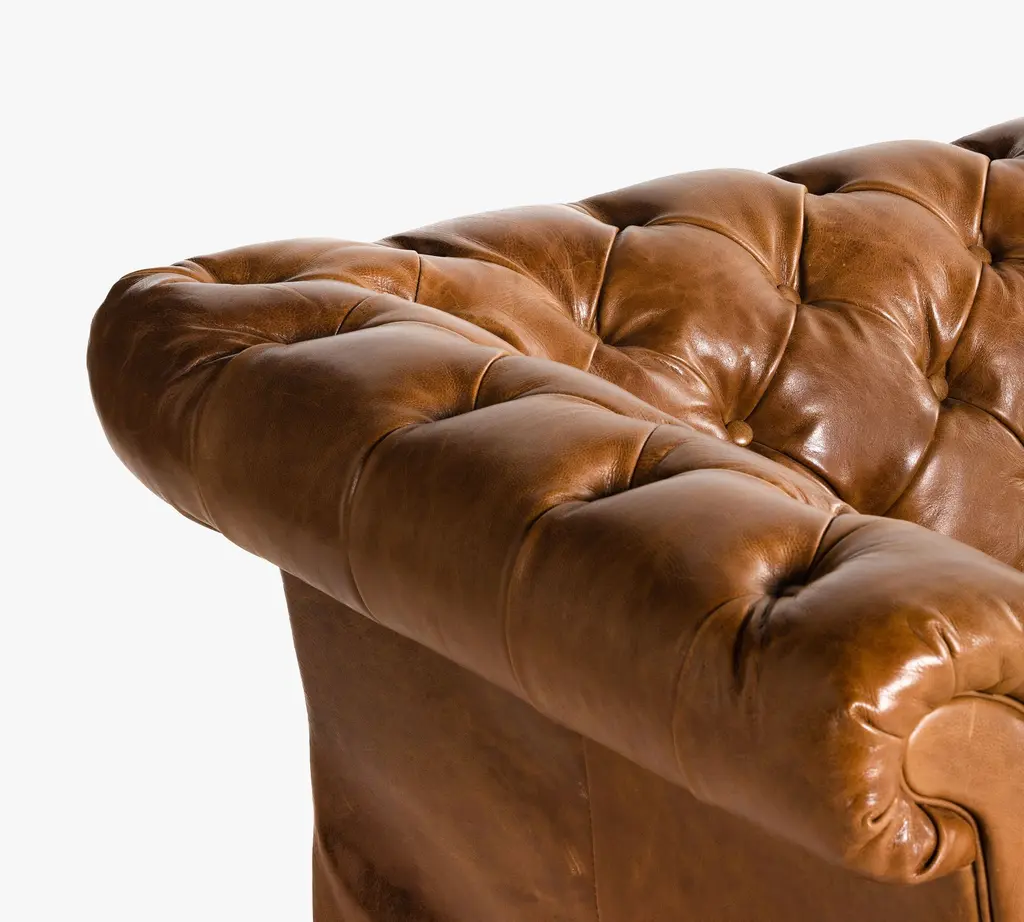 A nod to the classic Chesterfield sofa, this regal piece displays all the fine points of the Edwardian original that inspired it. Top grain leather in a warm finish is upholstered into sheltering arms, and dramatically tufted. Solid ash legs feature casters for modern ease.