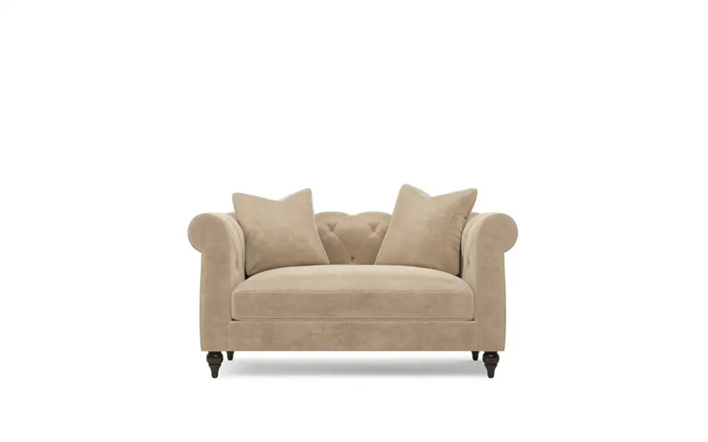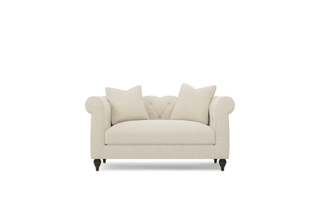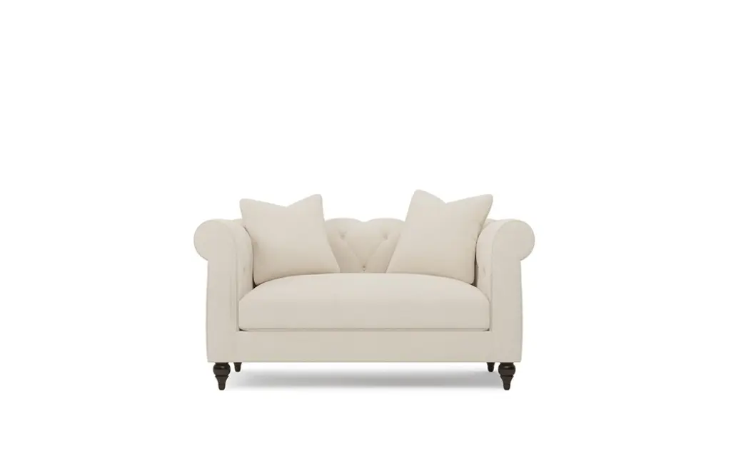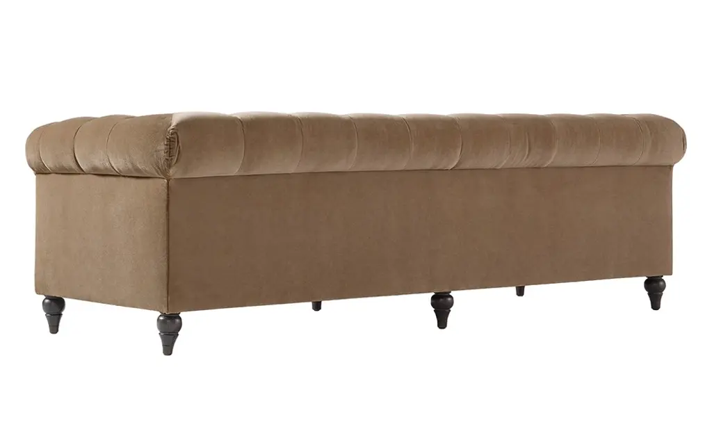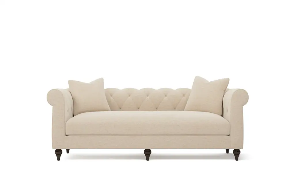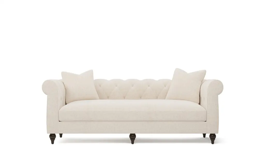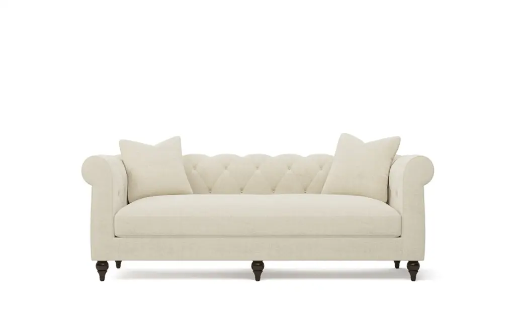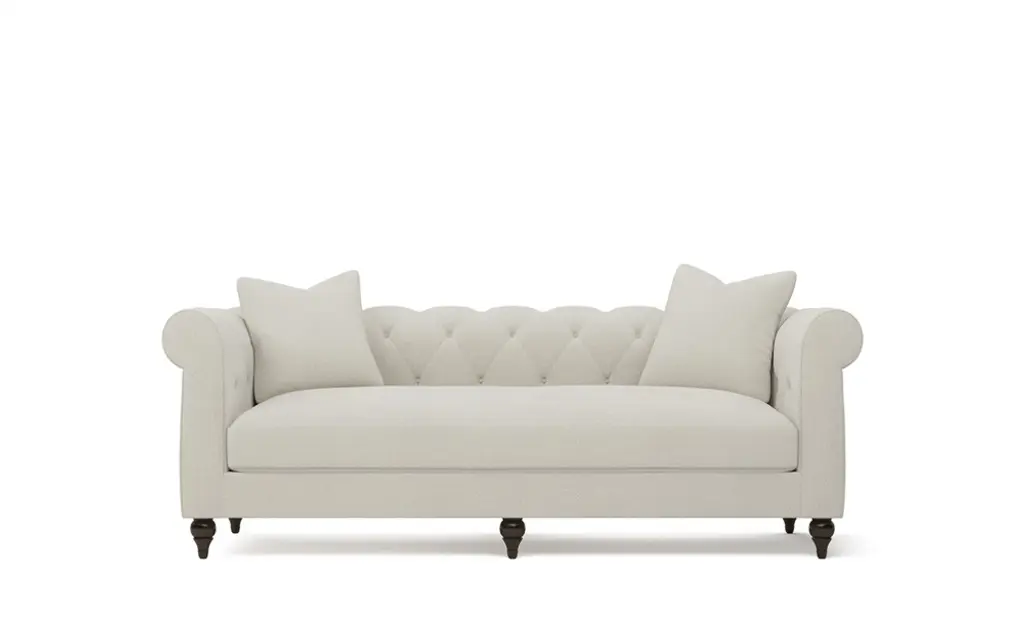 A Kathy Kuo Home exclusive, our 88” Rosehill sofa puts a modern twist on the traditional Chesterfield style. Designed without pleating for a cleaner look, the timeless silhouette highlights rolled arms, a tufted back, and turned wood legs. A simple, sophisticated bench seat features a custom cushion fill—hypoallergenic Trillium® fiber holds its shape and offers all the comfort of down without the fluffing maintenance. This charming sofa is a perfect choice for any classic living room.