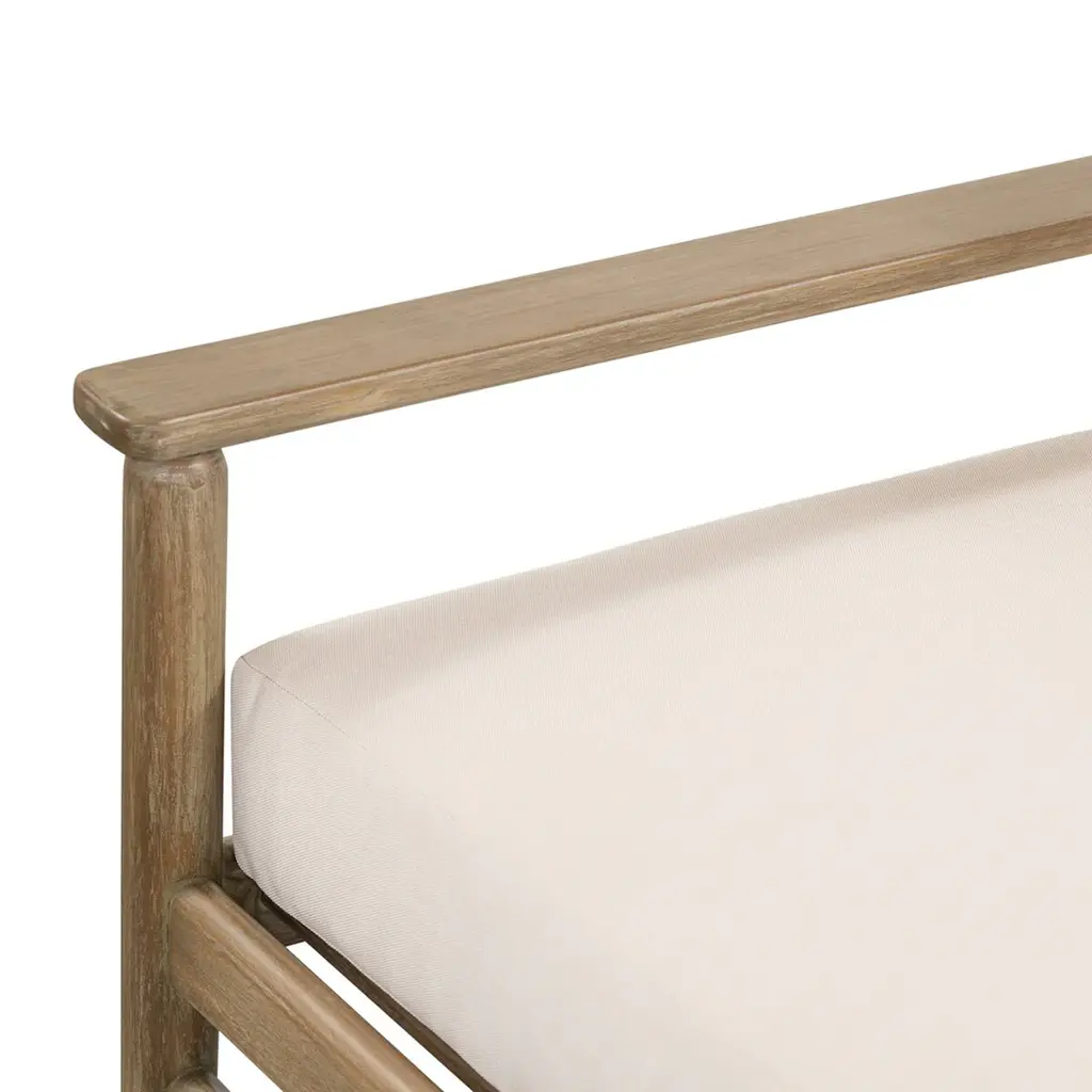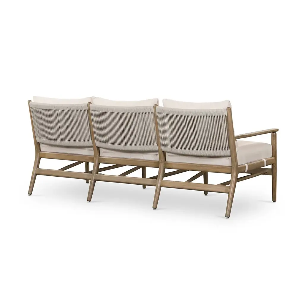 Made with FSC-certified eucalyptus, tapered legs and paddle arms lend a slim, shapely look to outdoor-friendly sofa seating with durable, Velcro-secured box cushions in a versatile ivory. Linear rope detailing on back adds novel texture. Cover or store indoors during inclement weather and when not in use. Ships In 10-14 Business Days Rope back UV-resistant performance fabric cushion Natural eucalyptus frame This image is for illustrative purposes only. The colors shown are accurate within the constraints of lighting, photography, and the color accuracy of your screen.