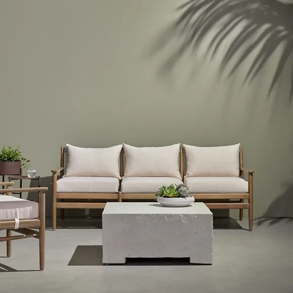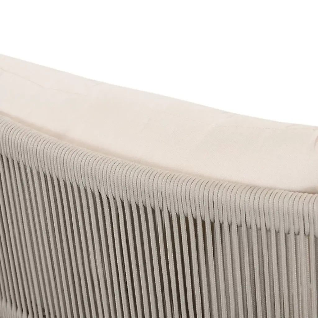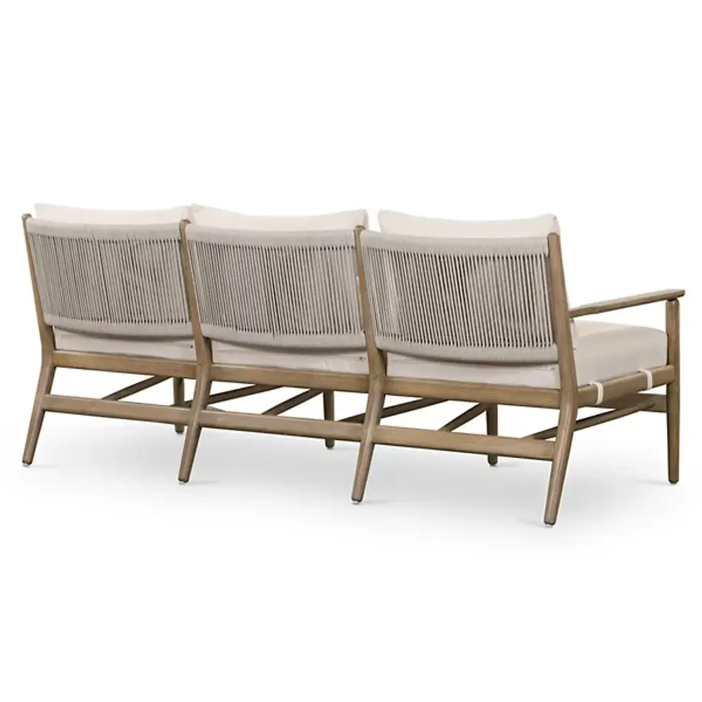 Crafted from FSC-certified eucalyptus, the Rosen Outdoor Sofa from Four Hands combines a sleek, tapered leg design with elegant paddle arms for a refined, shapely look. Durable box cushions in versatile ivory are securely fastened with Velcro for added stability and comfort. Unique linear rope detailing on the back brings a touch of texture, enhancing its modern style. Ideal for patios or gardens, this sofa should be covered or stored indoors during inclement weather to maintain its beauty and longevity.
