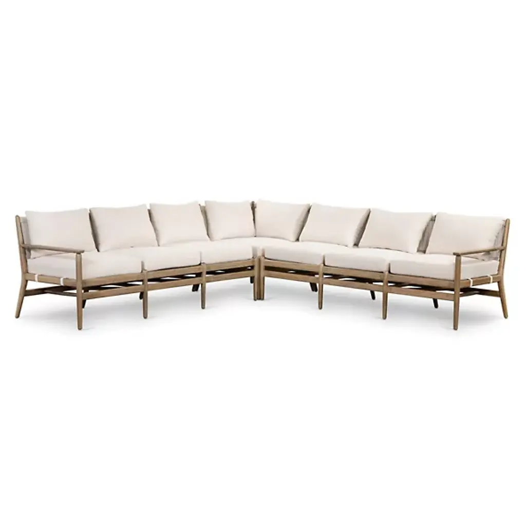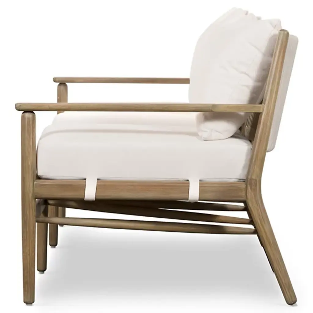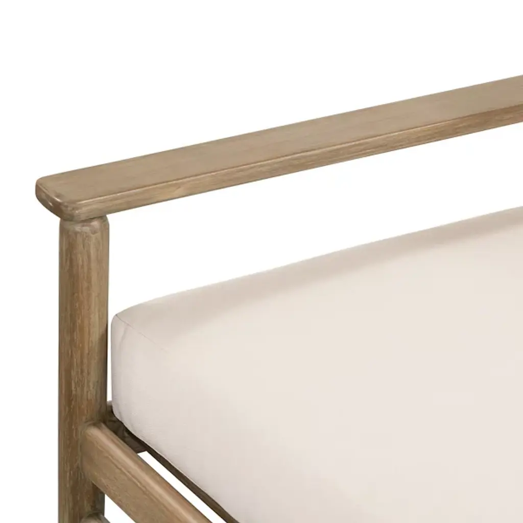 Crafted from FSC-certified eucalyptus, the Rosen Outdoor Sofa from Four Hands combines a sleek, tapered leg design with elegant paddle arms for a refined, shapely look. Durable box cushions in versatile ivory are securely fastened with Velcro for added stability and comfort. Unique linear rope detailing on the back brings a touch of texture, enhancing its modern style. Ideal for patios or gardens, this sofa should be covered or stored indoors during inclement weather to maintain its beauty and longevity.