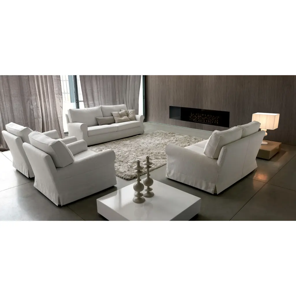 Experience the pinnacle of luxury with our Round-Arm Upholstered Sofa by Dema Milord. Featuring a steel structure with 10-year guaranteed springs, polyurethane foam padding, and "ILPOFLEX" cold-formed armrests. Indulge in the comfort of multiple density foam cushions and removable covers in composite acrylic fiber. Elevate your living space with this exquisite piece.